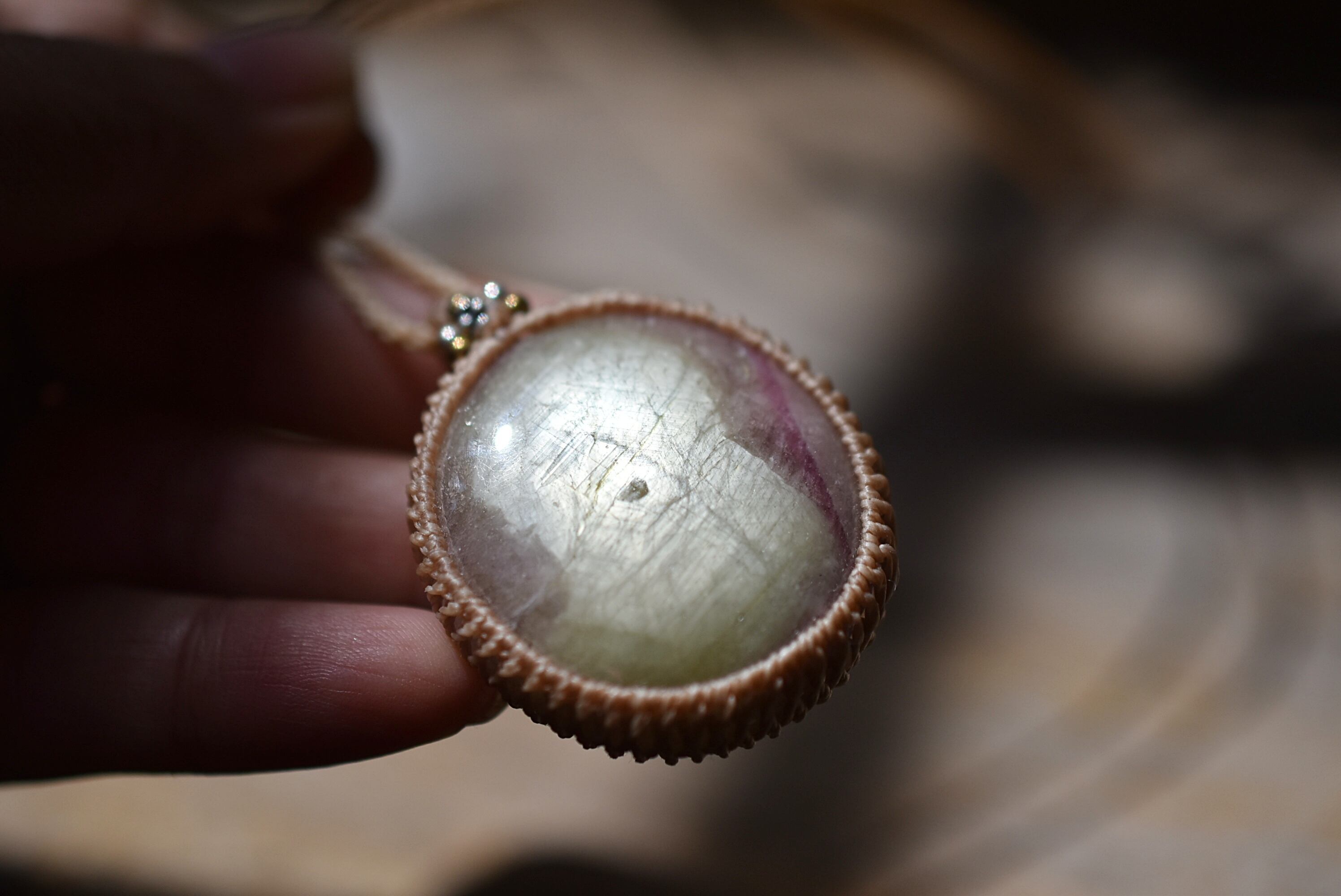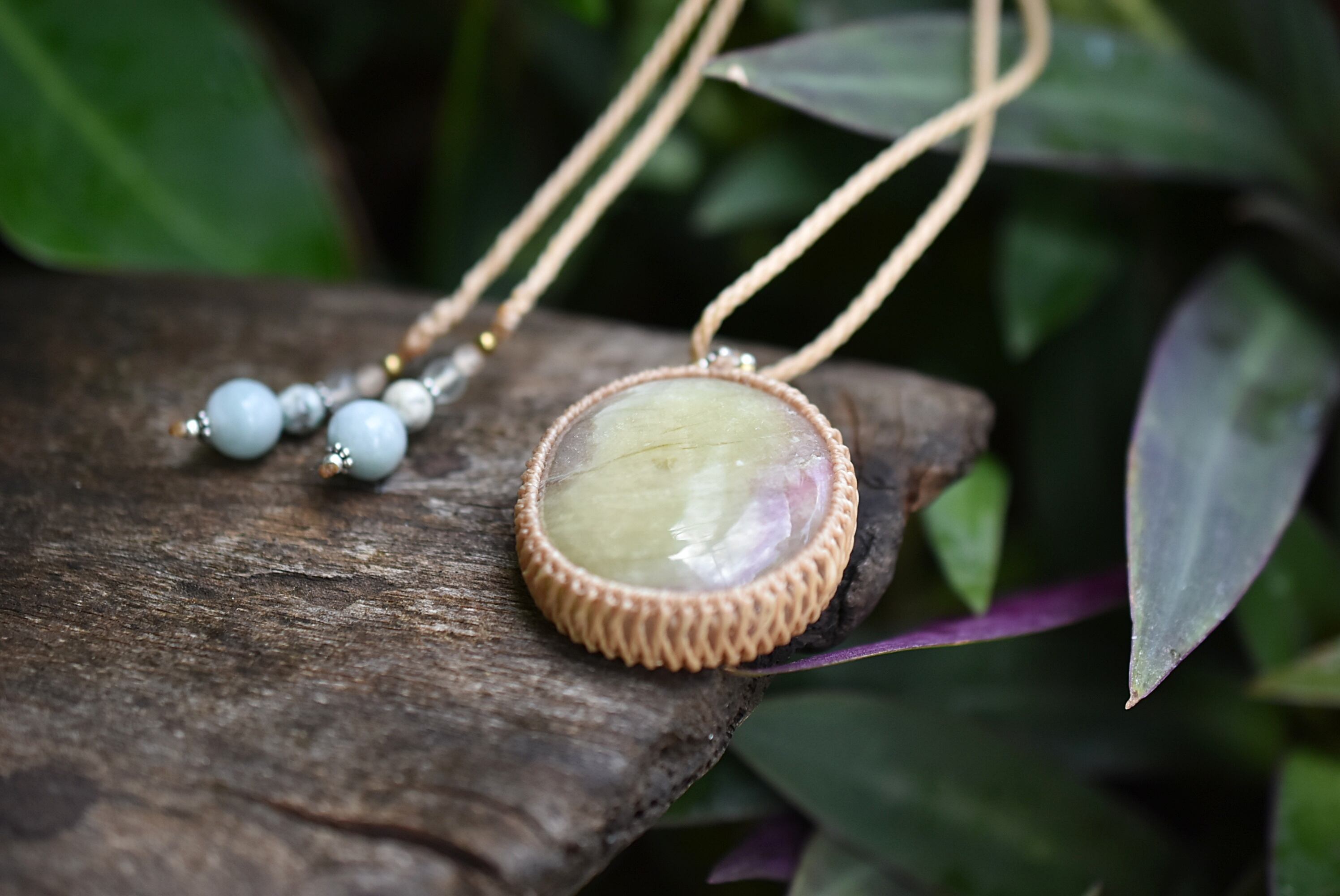 ◆このたびはキャラメル色の蝋引き糸を使用しマクラメ編み装飾を施しました。