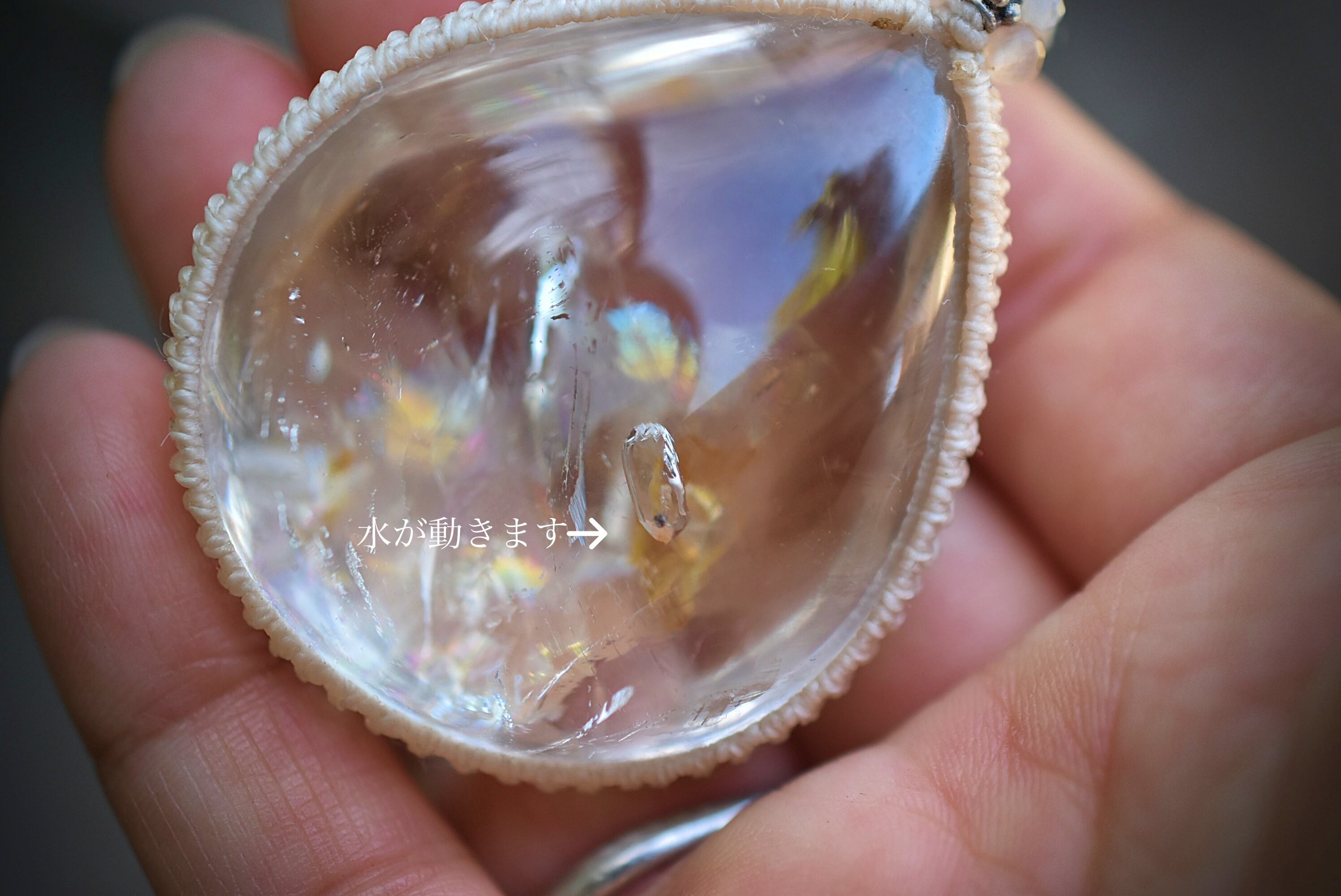 水入り水晶は名前の通り、水晶の内部に水分が内包されたもので、その中に内包された空気が動くことによって水の存在を確認することができるもの。数千万年から数億年前のものと言われております。