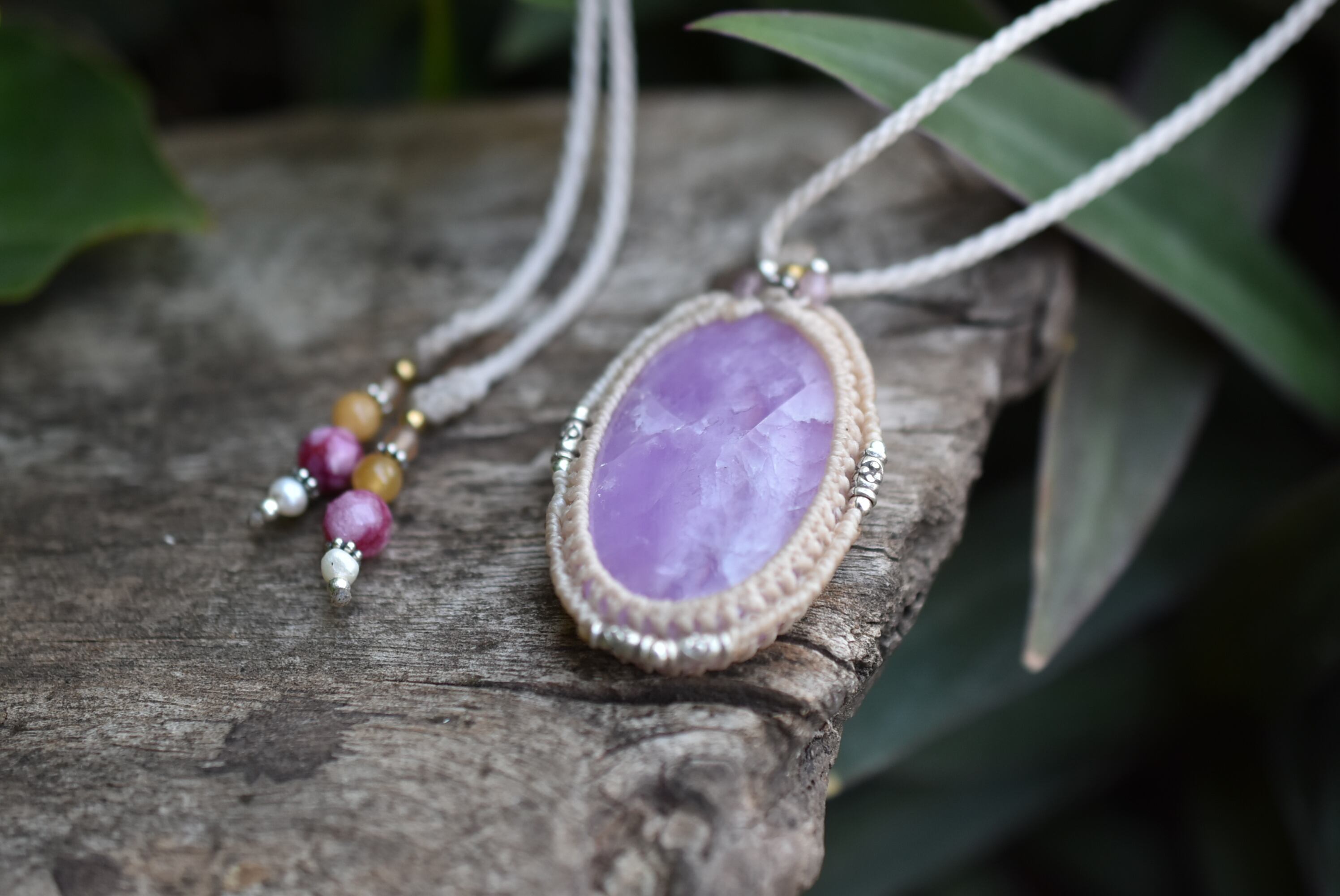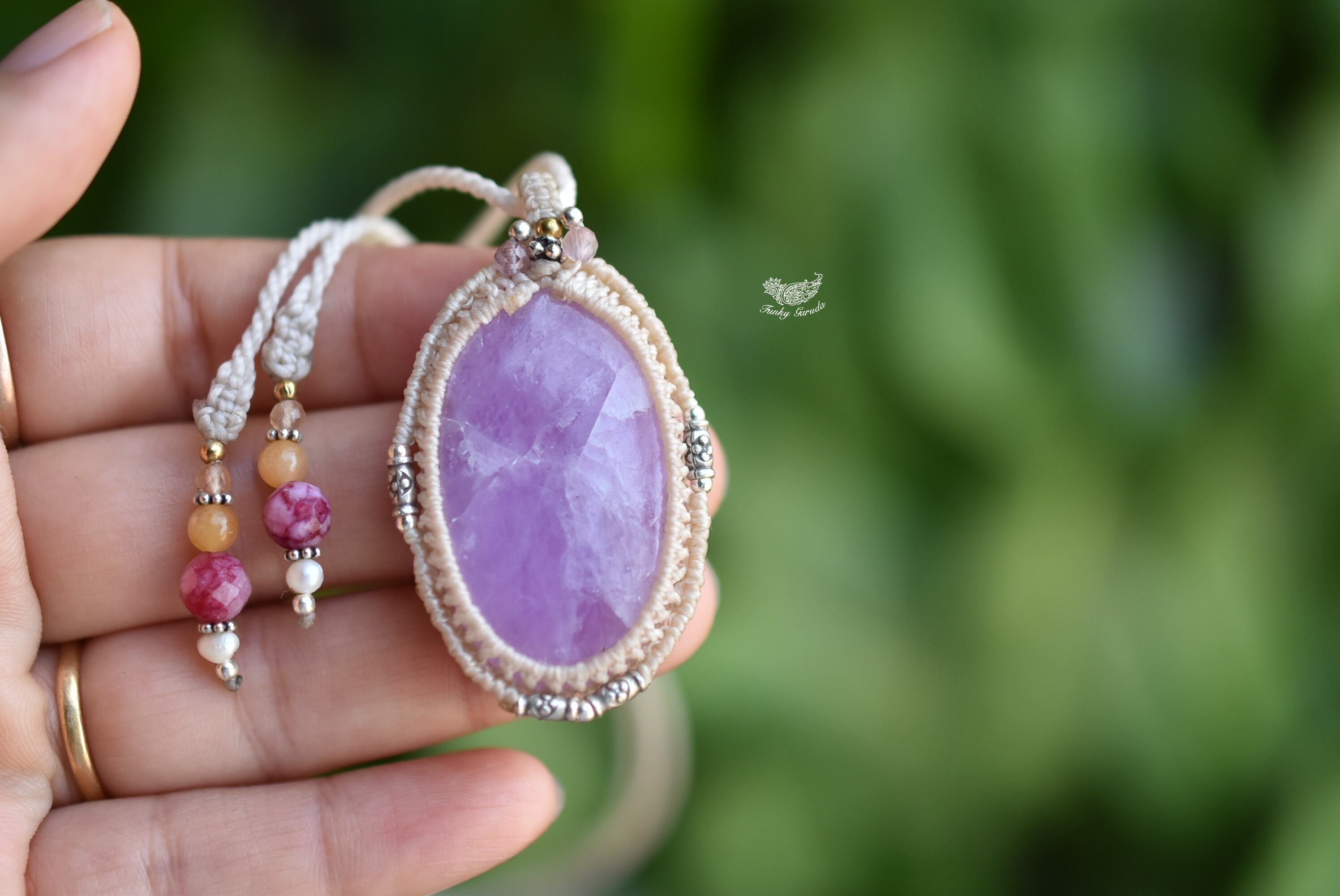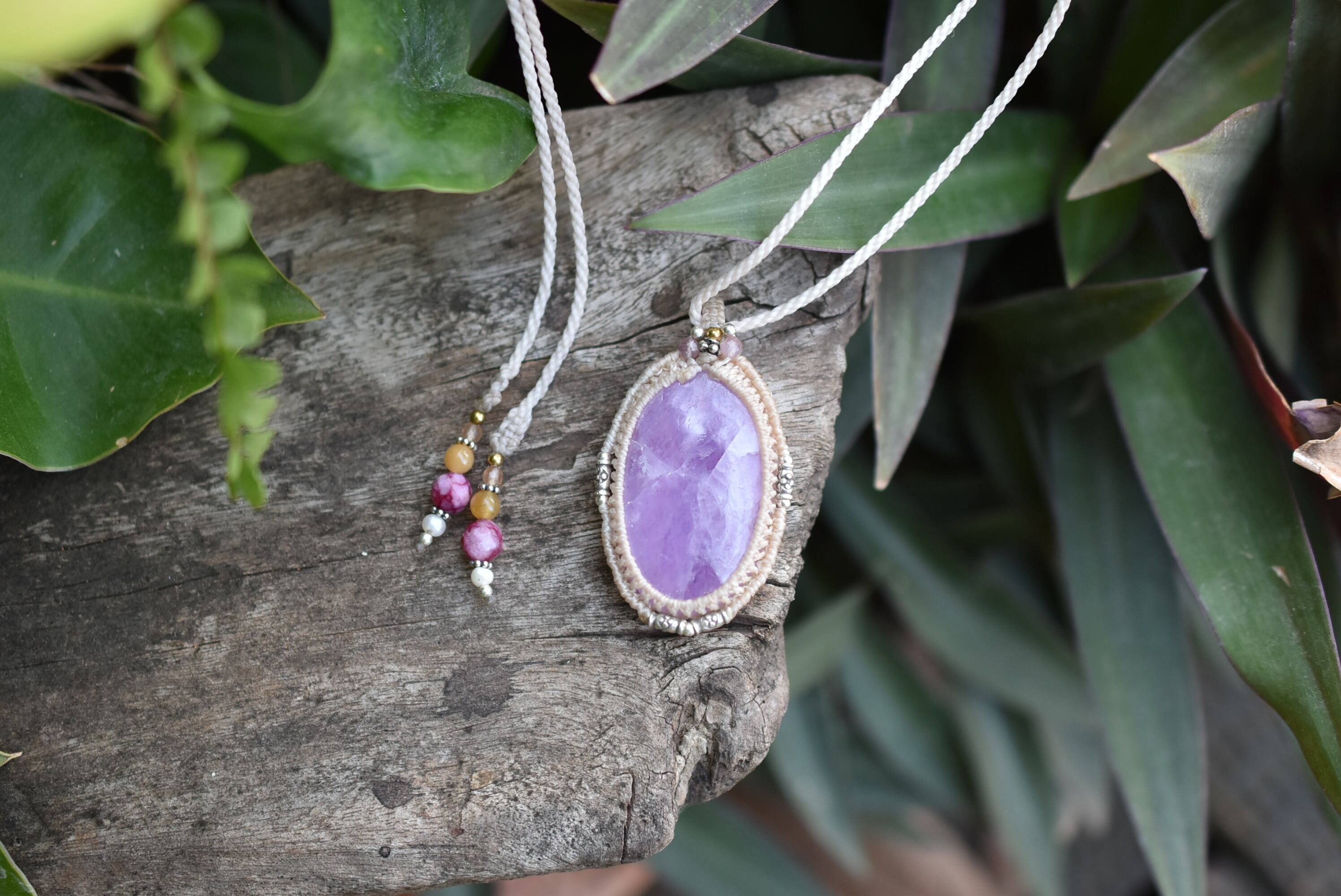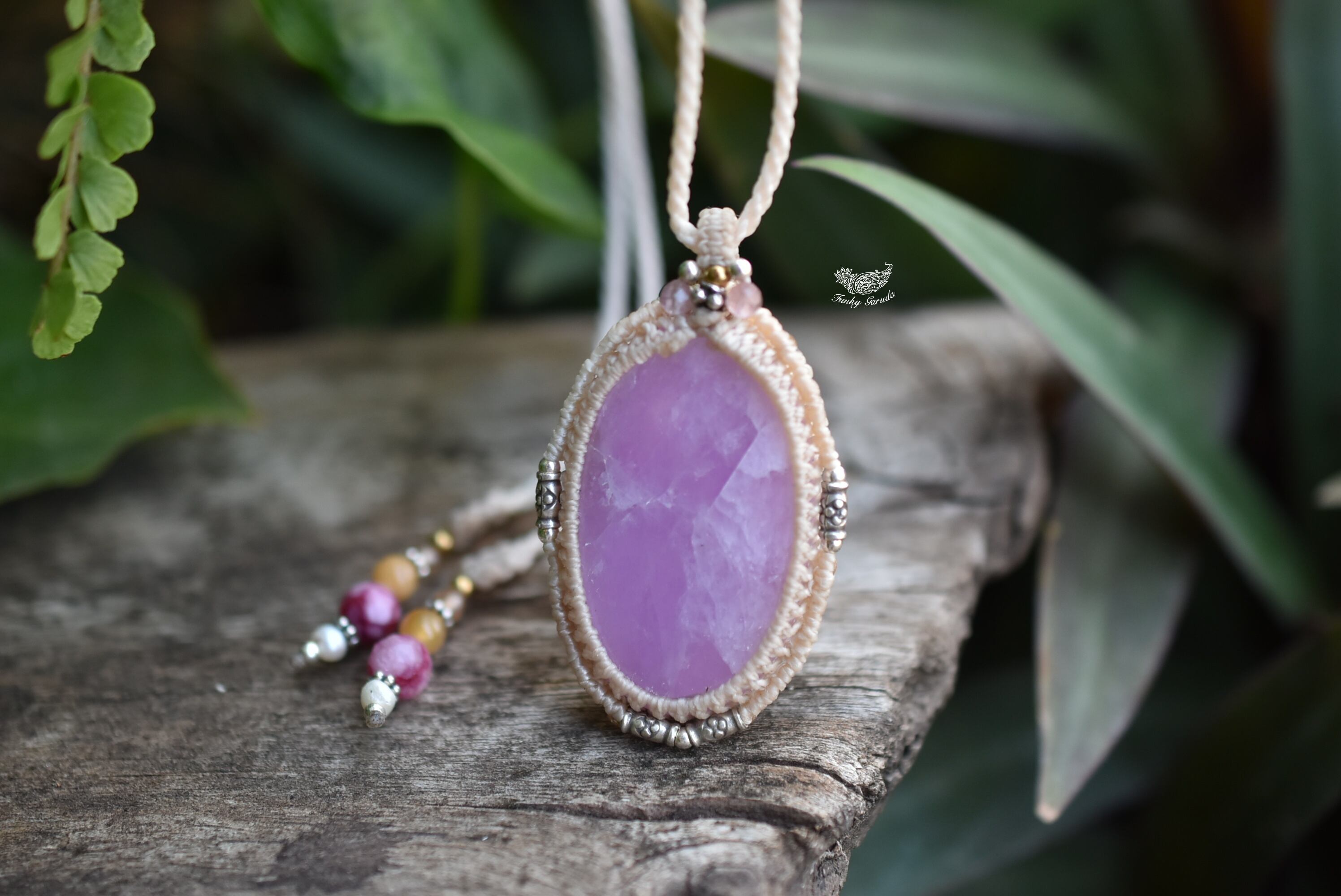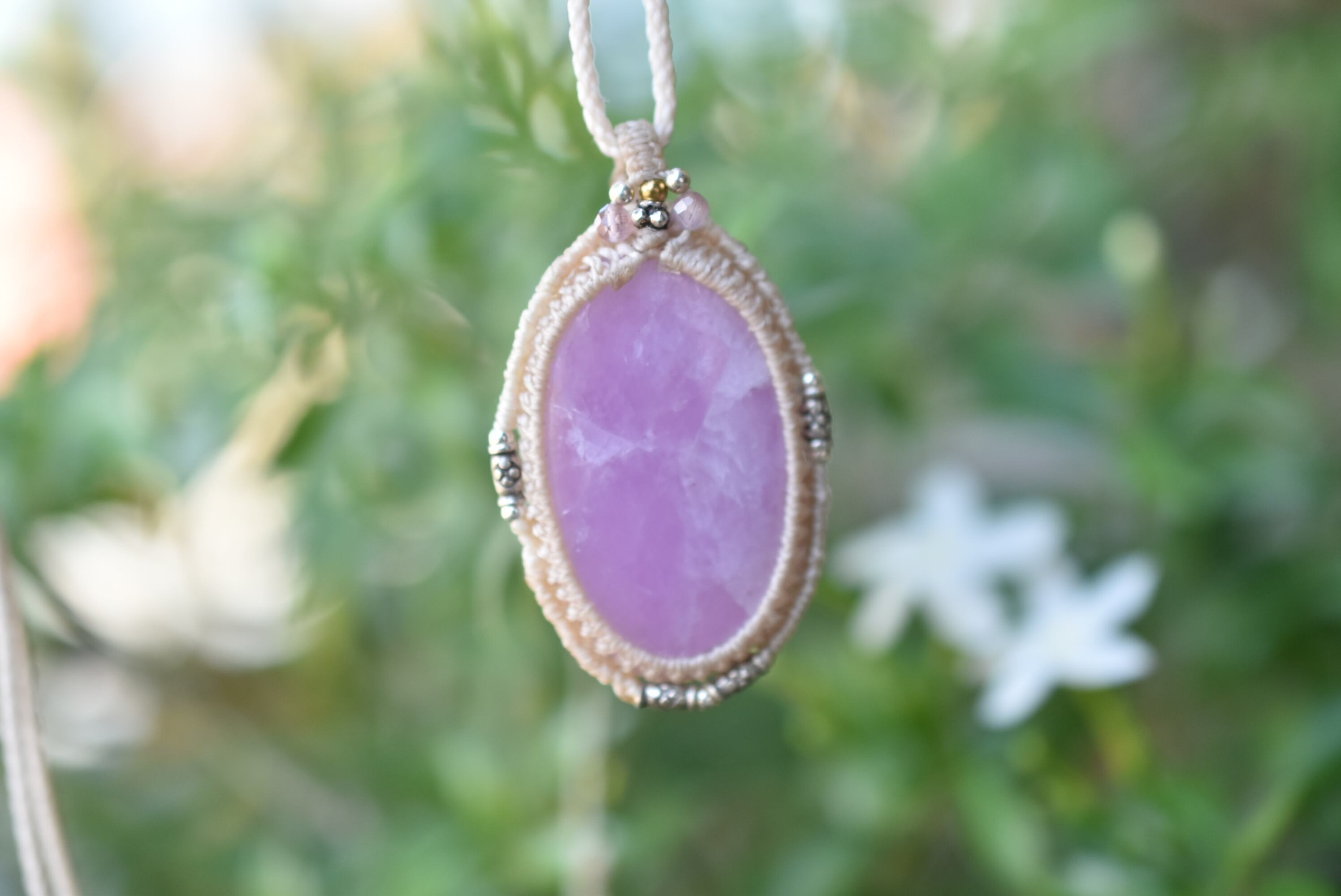 ◆このたびはナチュラルホワイト色の蝋引き糸を使用しマクラメ編み装飾を施しました。