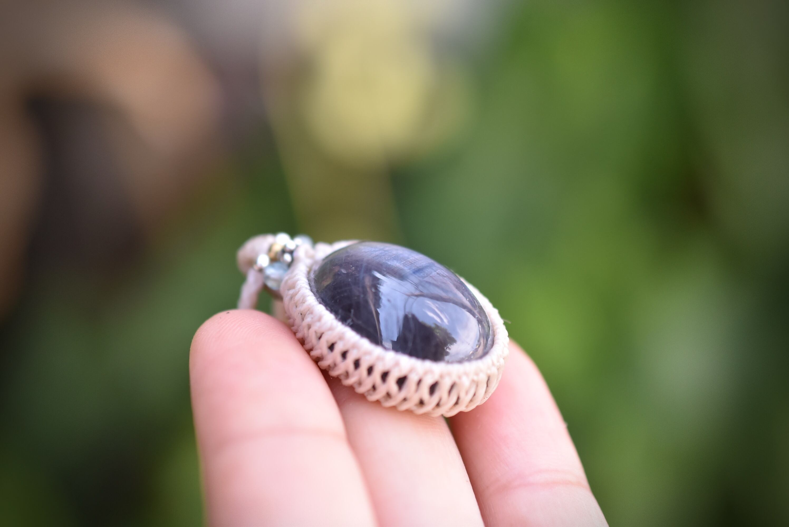 ◆このたびはナチュラルホワイト色の蝋引き糸を使用しマクラメ編み装飾を施しました。