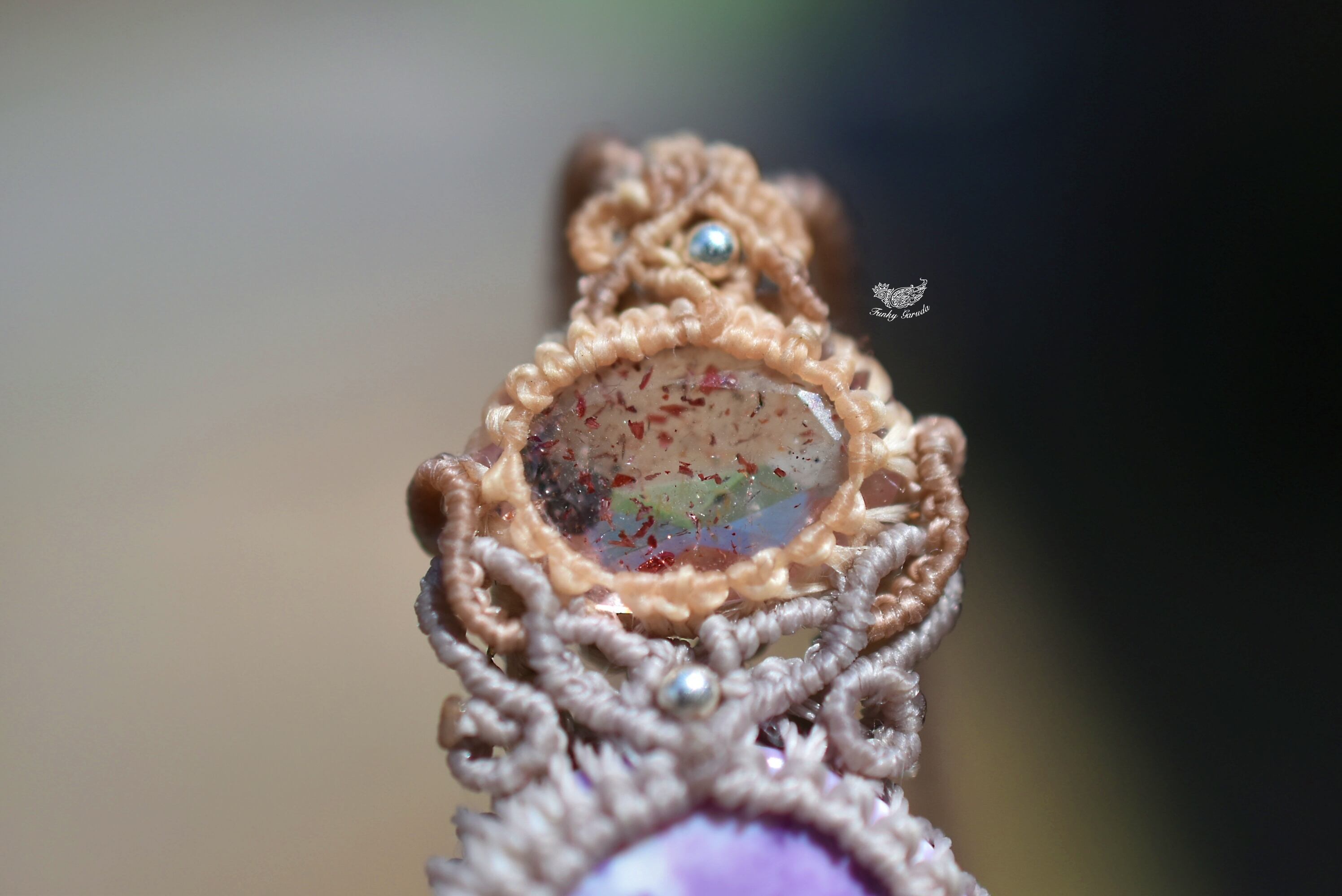 ◆このたびはカフェオレ、キナリ、ヘンプ、キャラメル色の蝋引き糸を使用しマクラメ編み装飾を施しました。