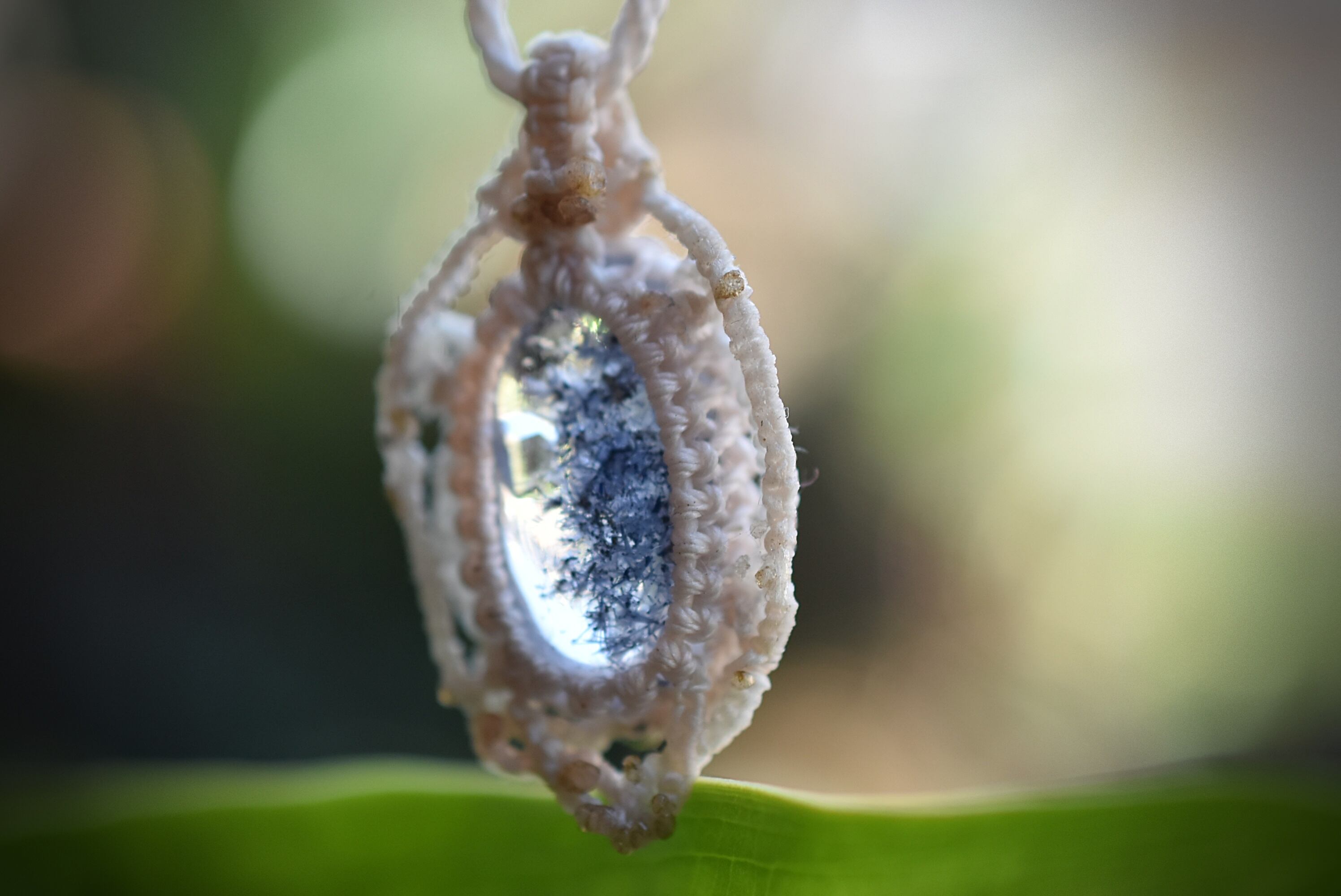 ◆このたびはナチュラルホワイト色の蝋引き糸を使用しマクラメ編み装飾を施しました。