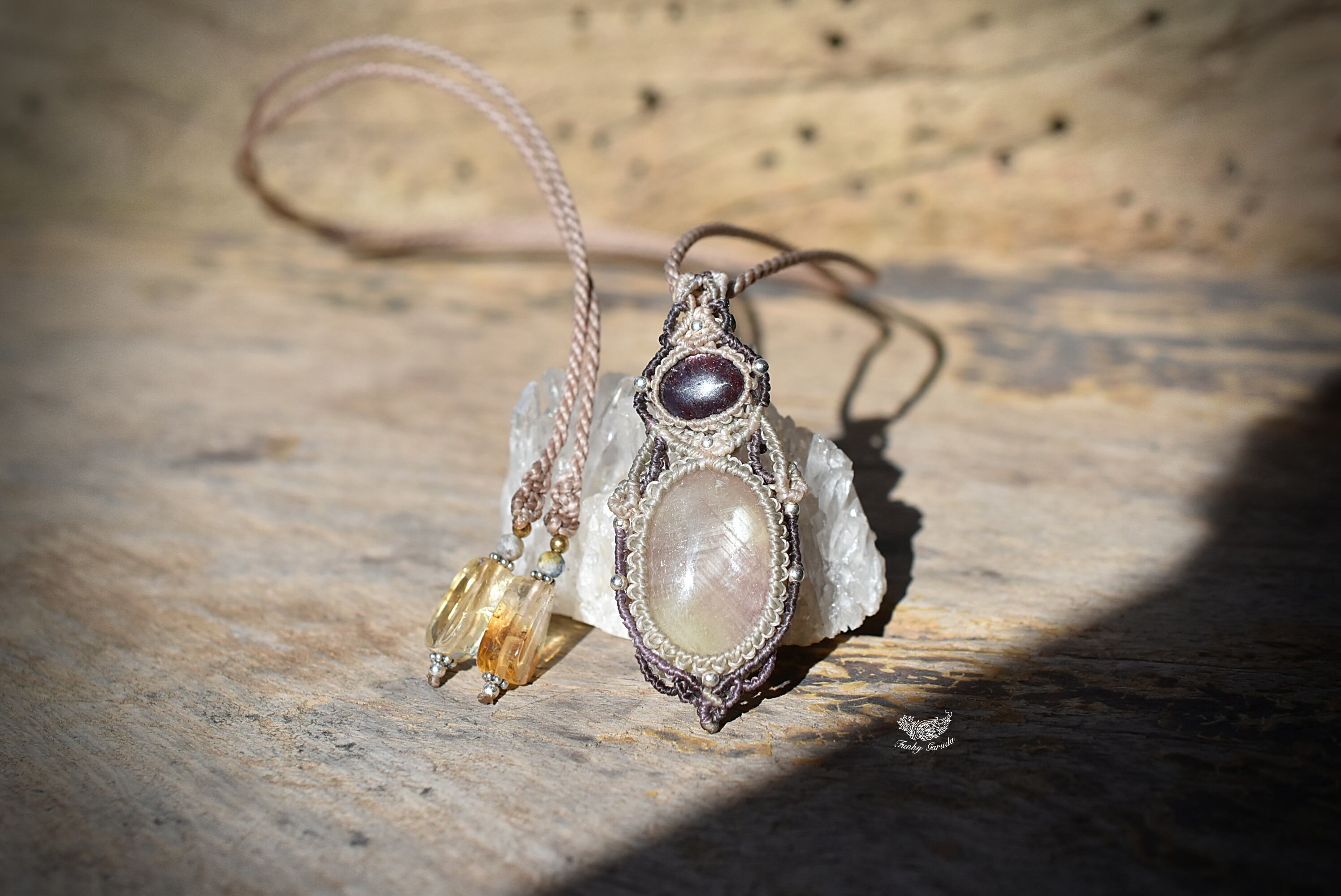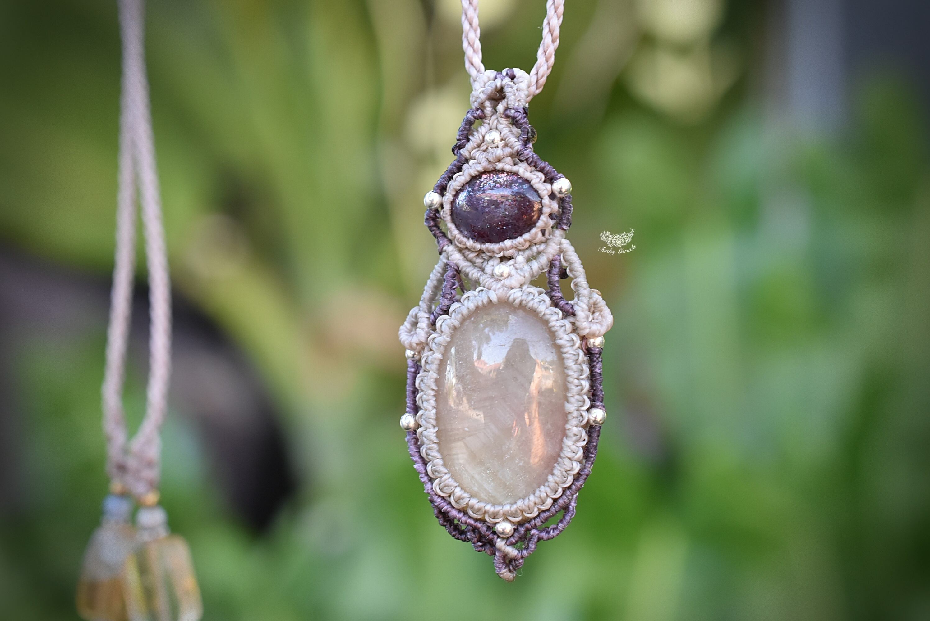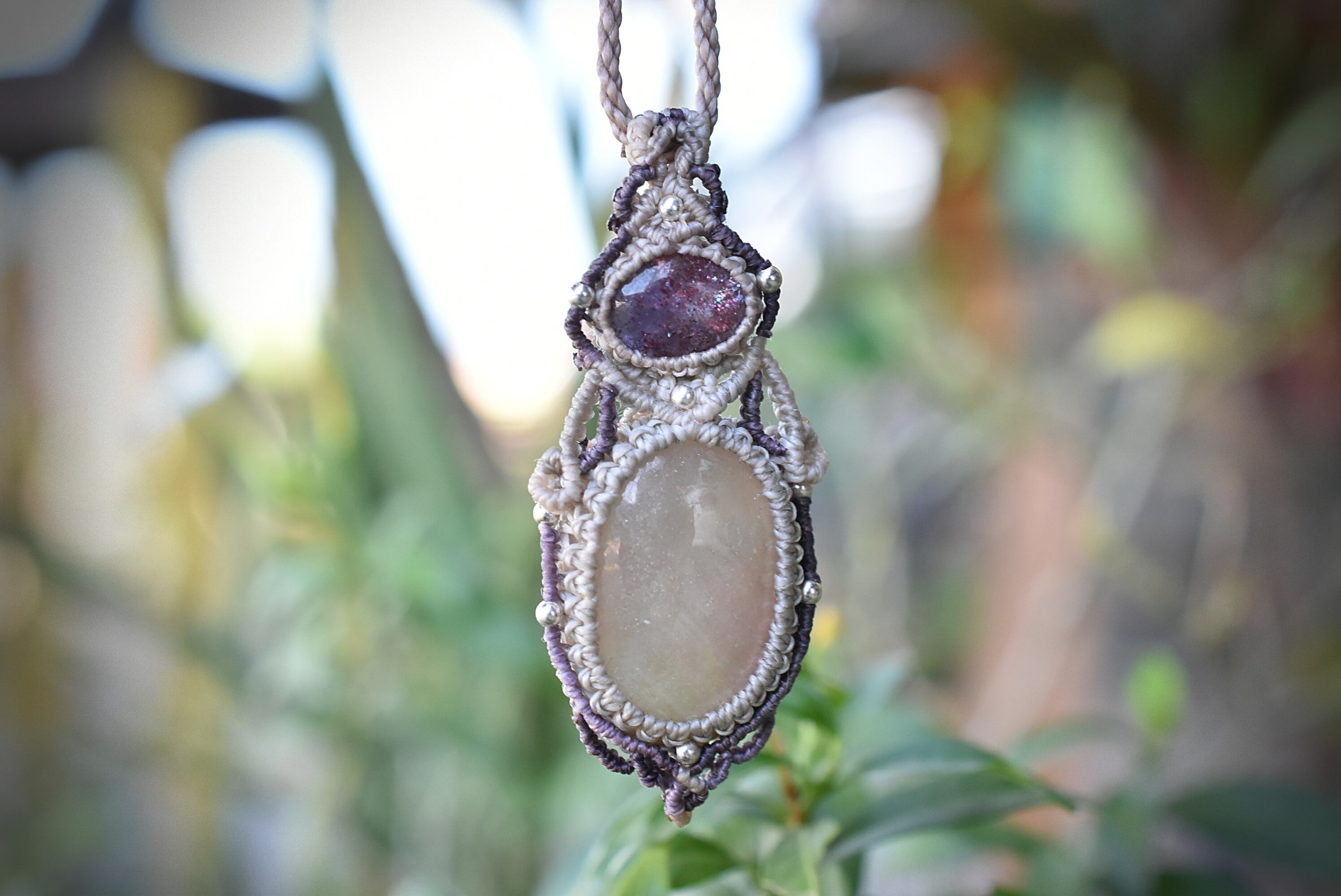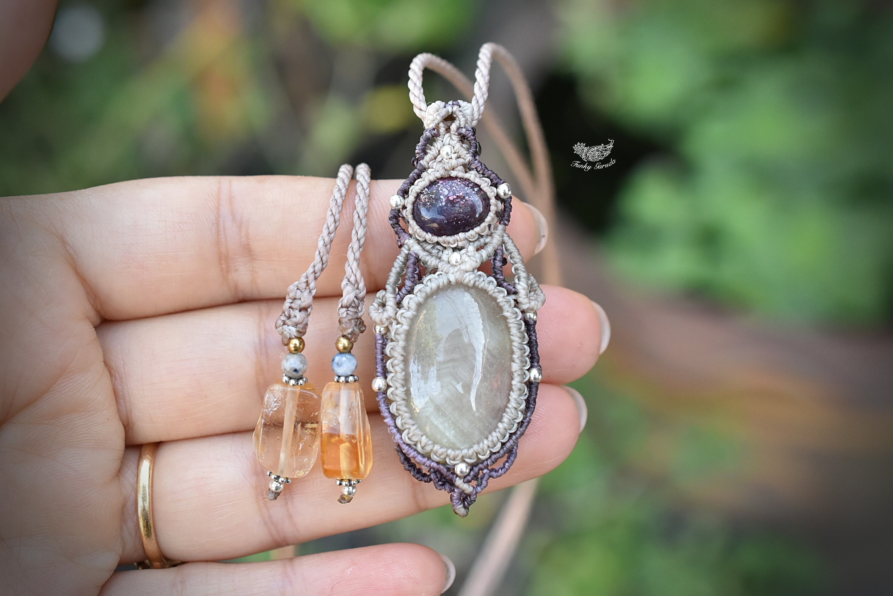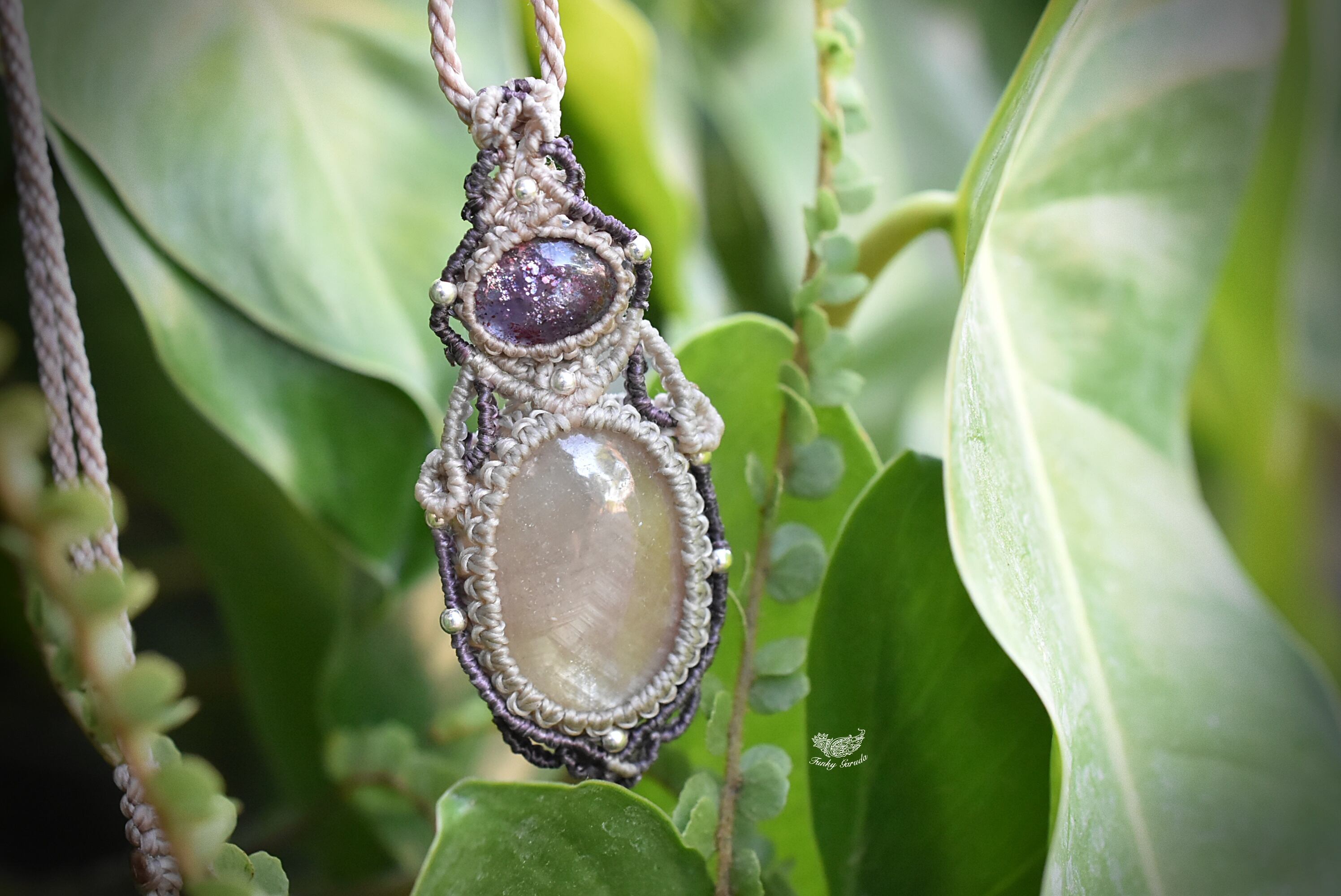 ◆このたびは、キナリ、パープル、ダブグレイ、ナチュラルホワイト、ヘンプ色の蝋引き糸を使用しマクラメ編み装飾を施しました。