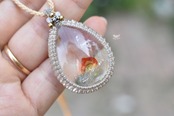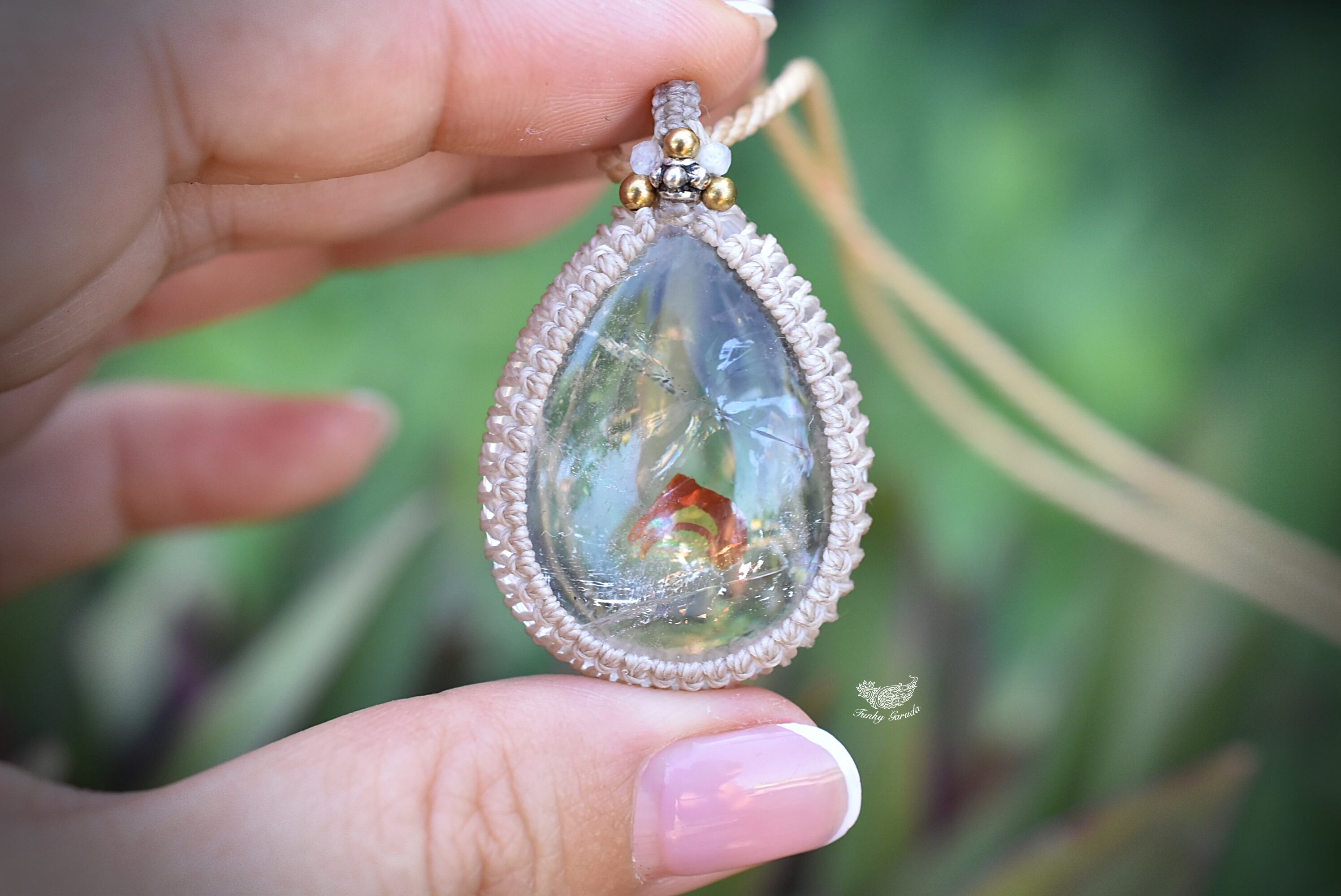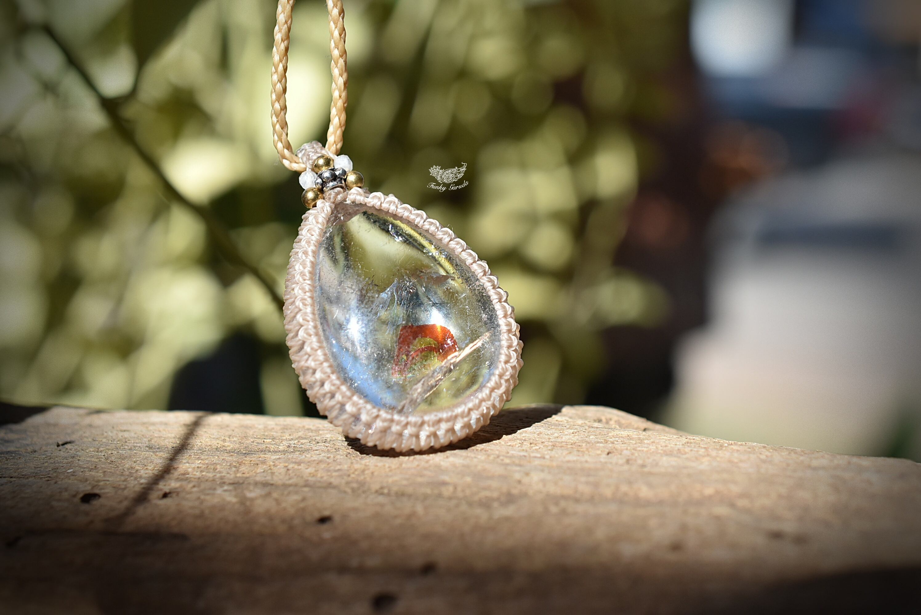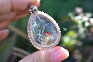 オーロラクォーツは透明な水晶の中に赤や黄色のライモナイト(層状)が見られる水晶です。金属の成分を含んだ水分がクラックに入り込み、その水分が蒸発し、長い年月をかけてフィルム状に再結晶したとても不思議な水晶です。