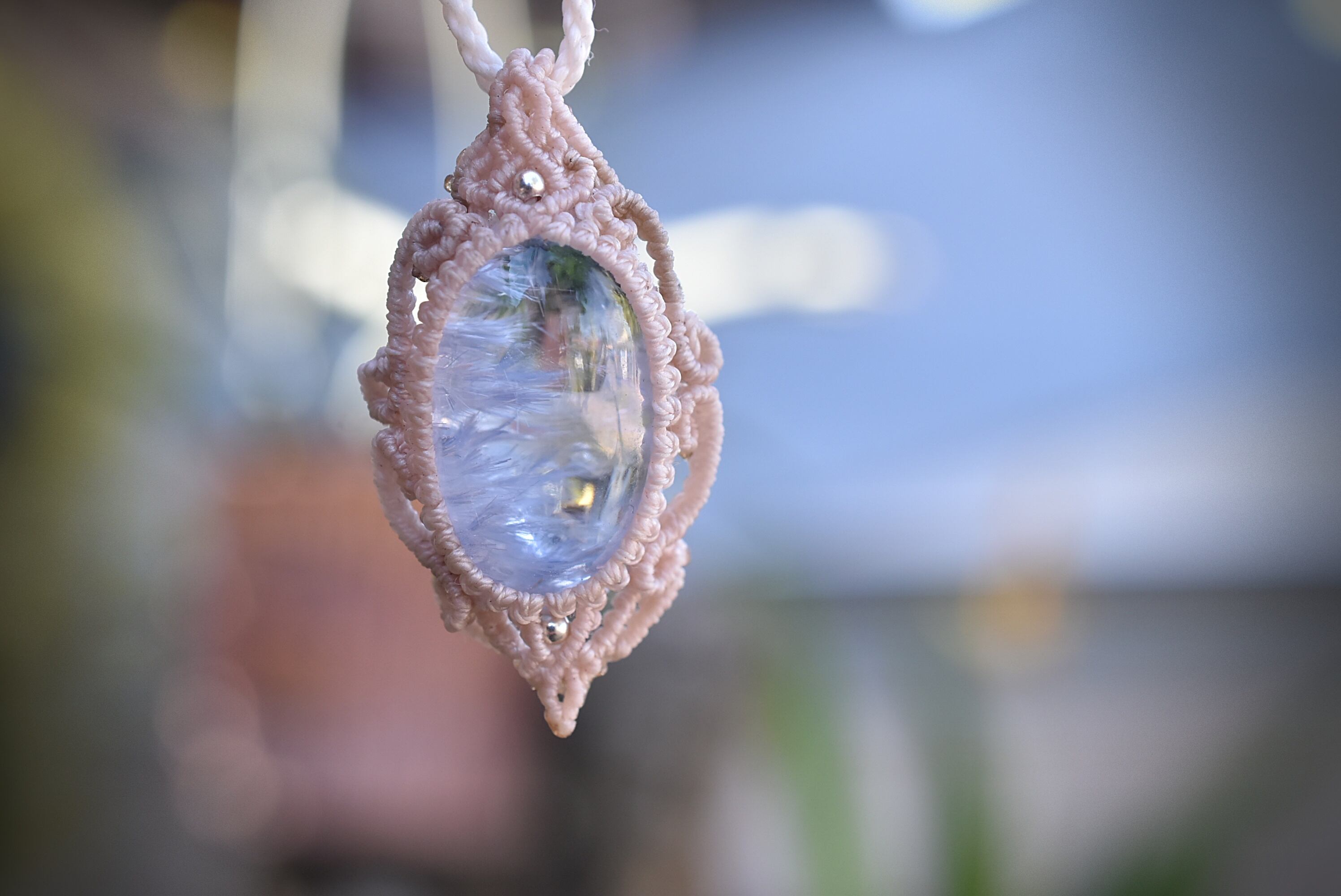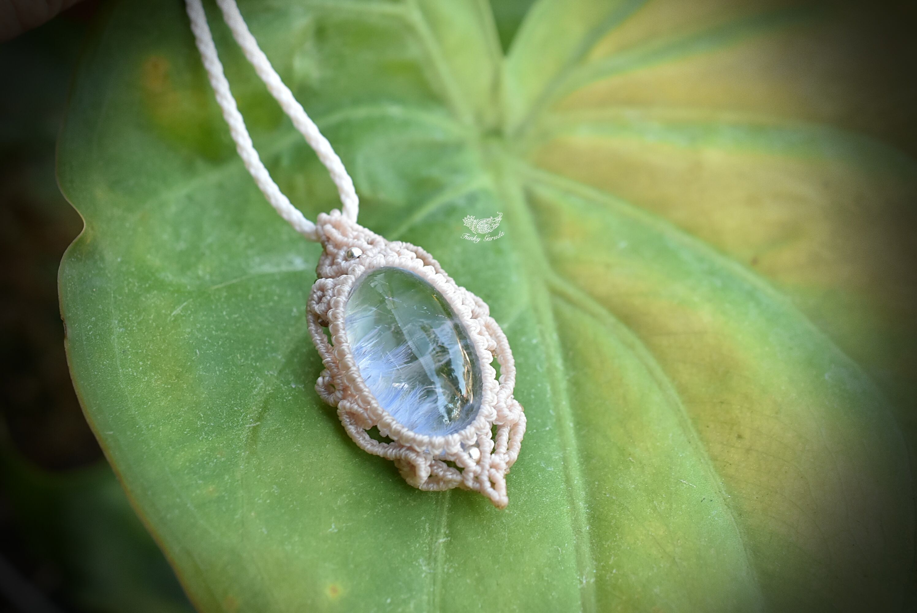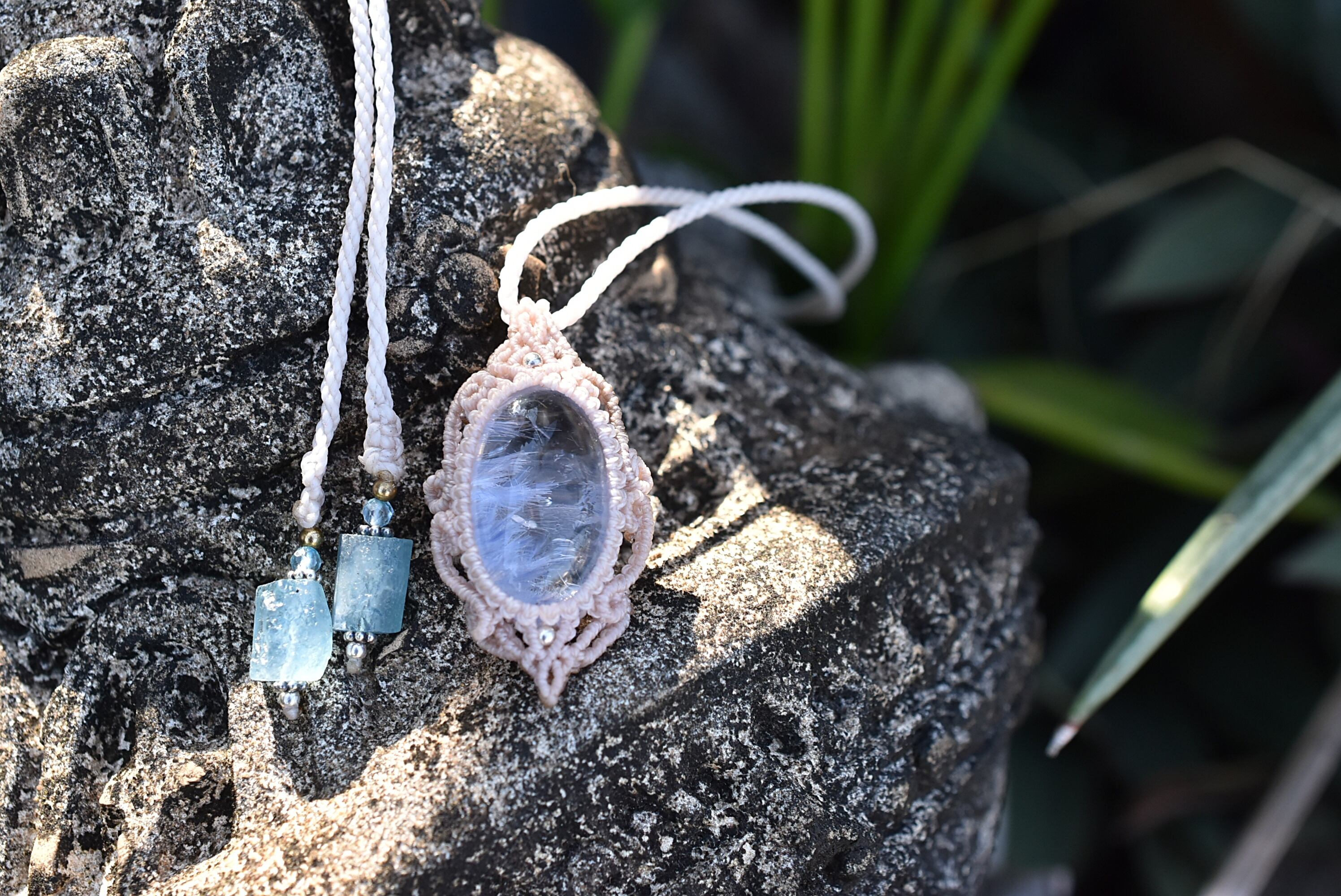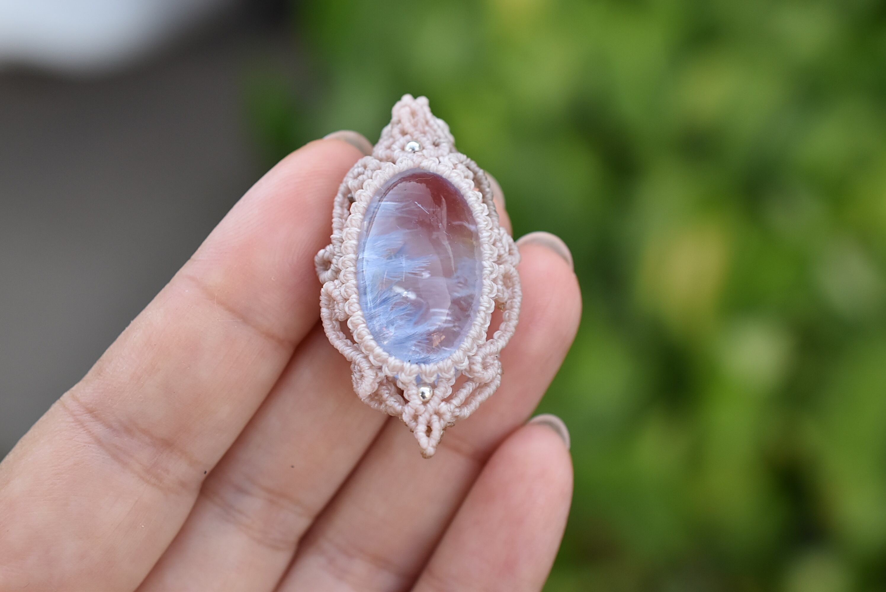 ◆このたびはナチュラルホワイト、ヘンプ色の蝋引き糸を使用しマクラメ編み装飾を施しました。