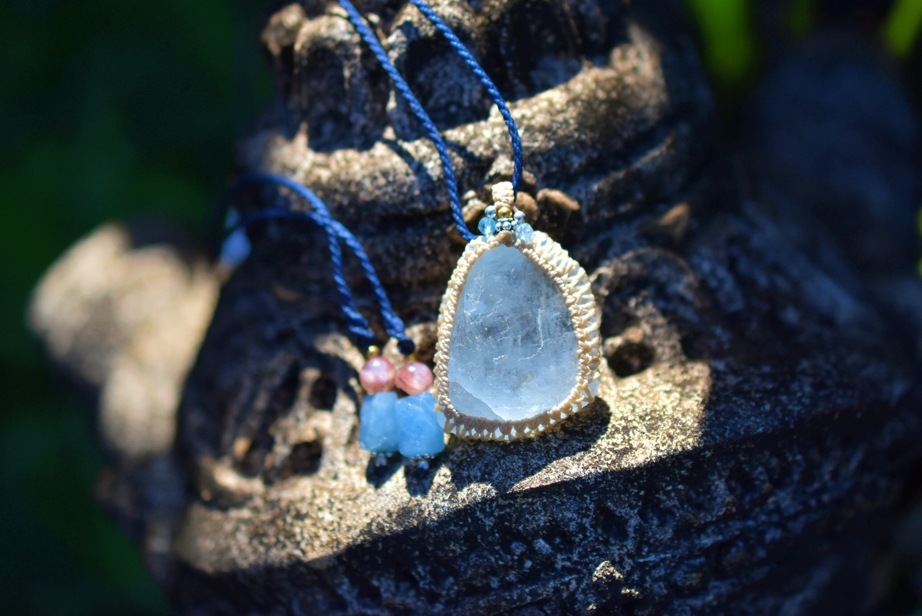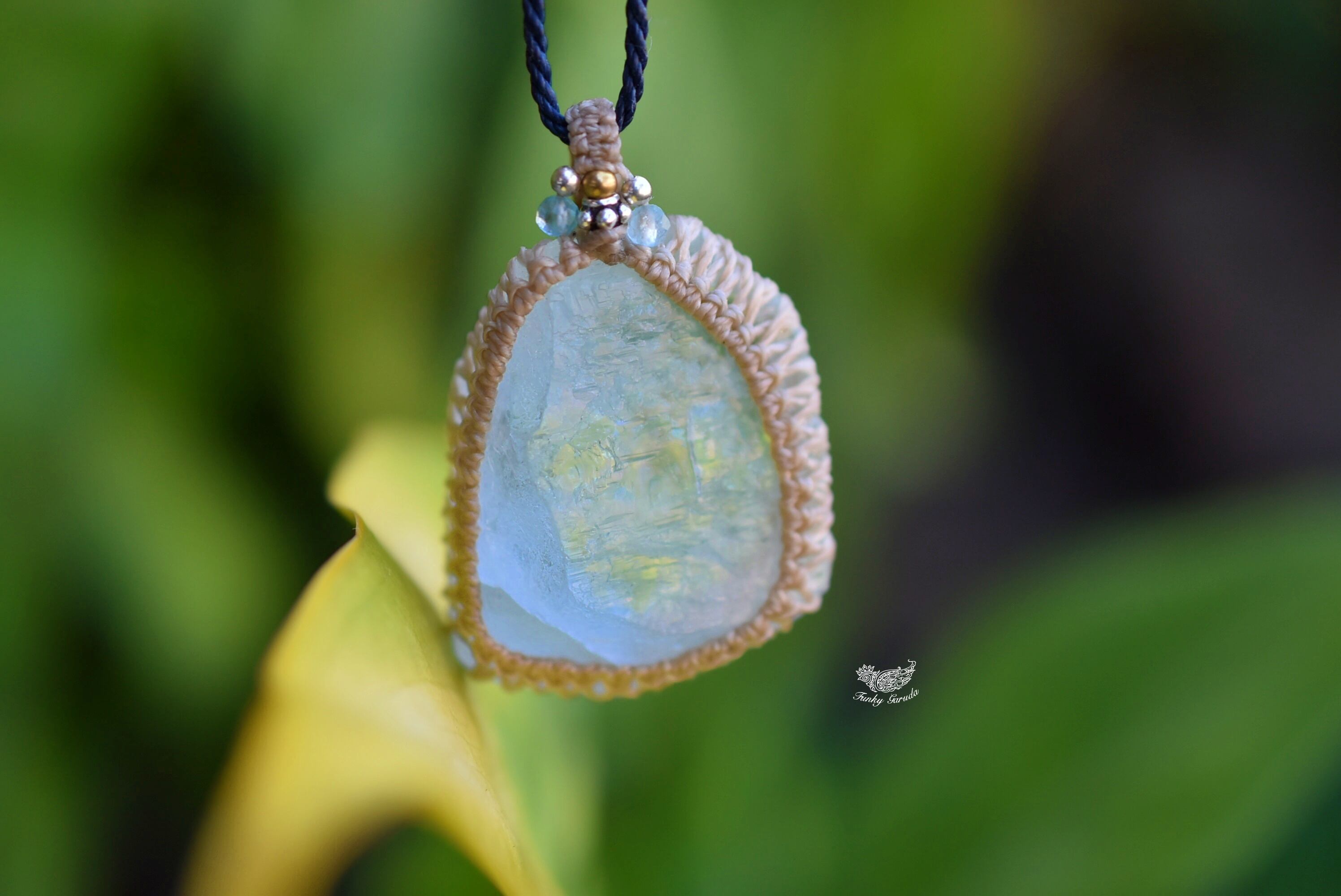 透明感ある原石そのままの形を囲み編み込みにてマクラメ編み