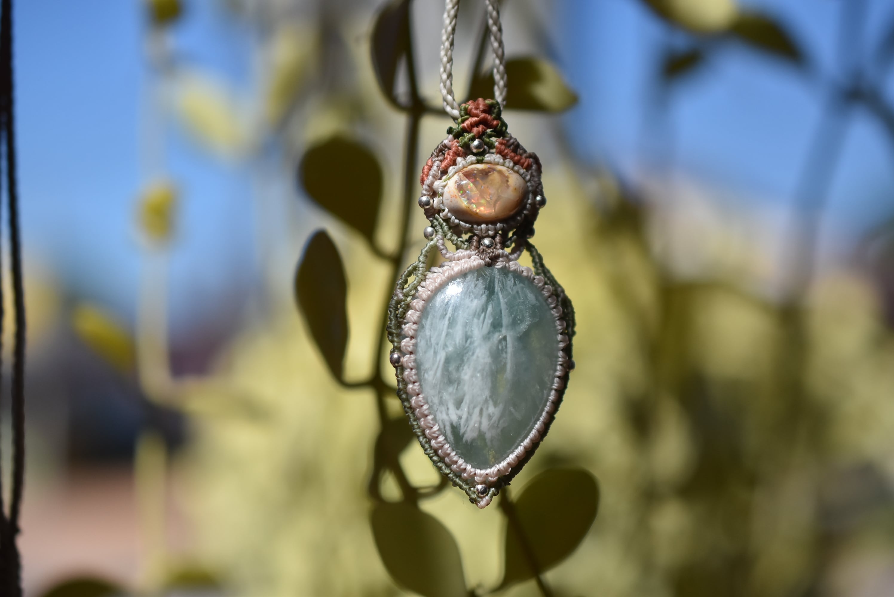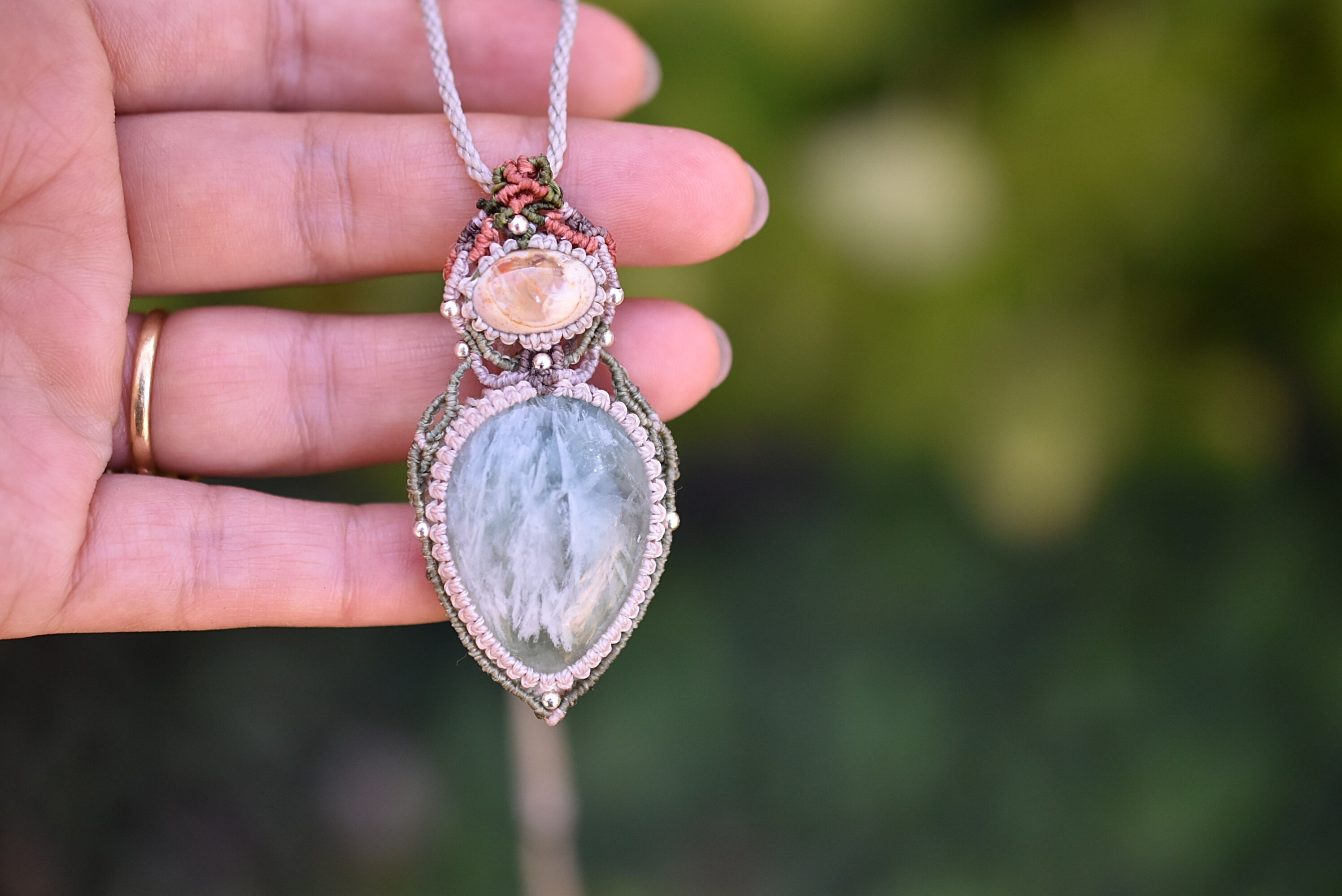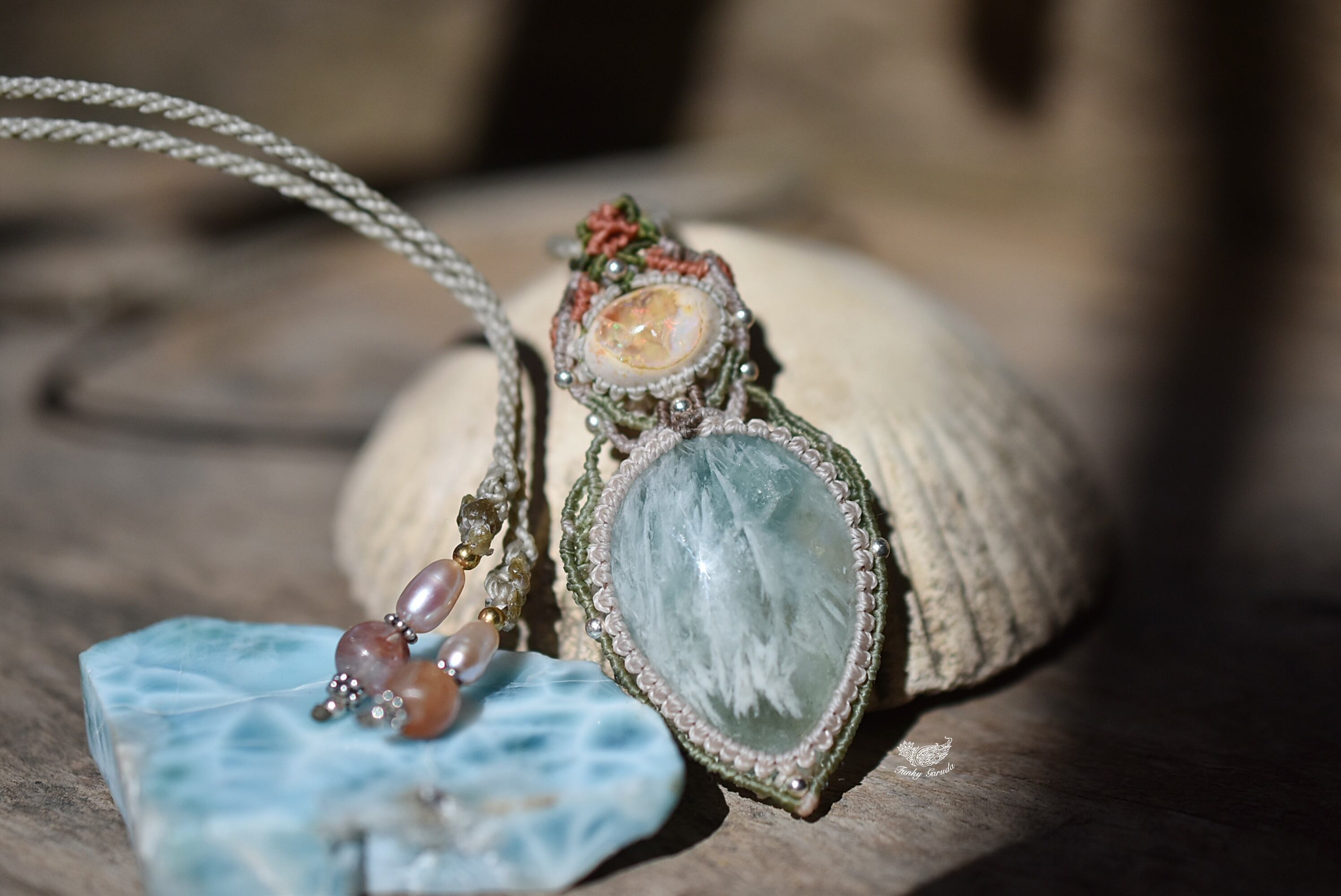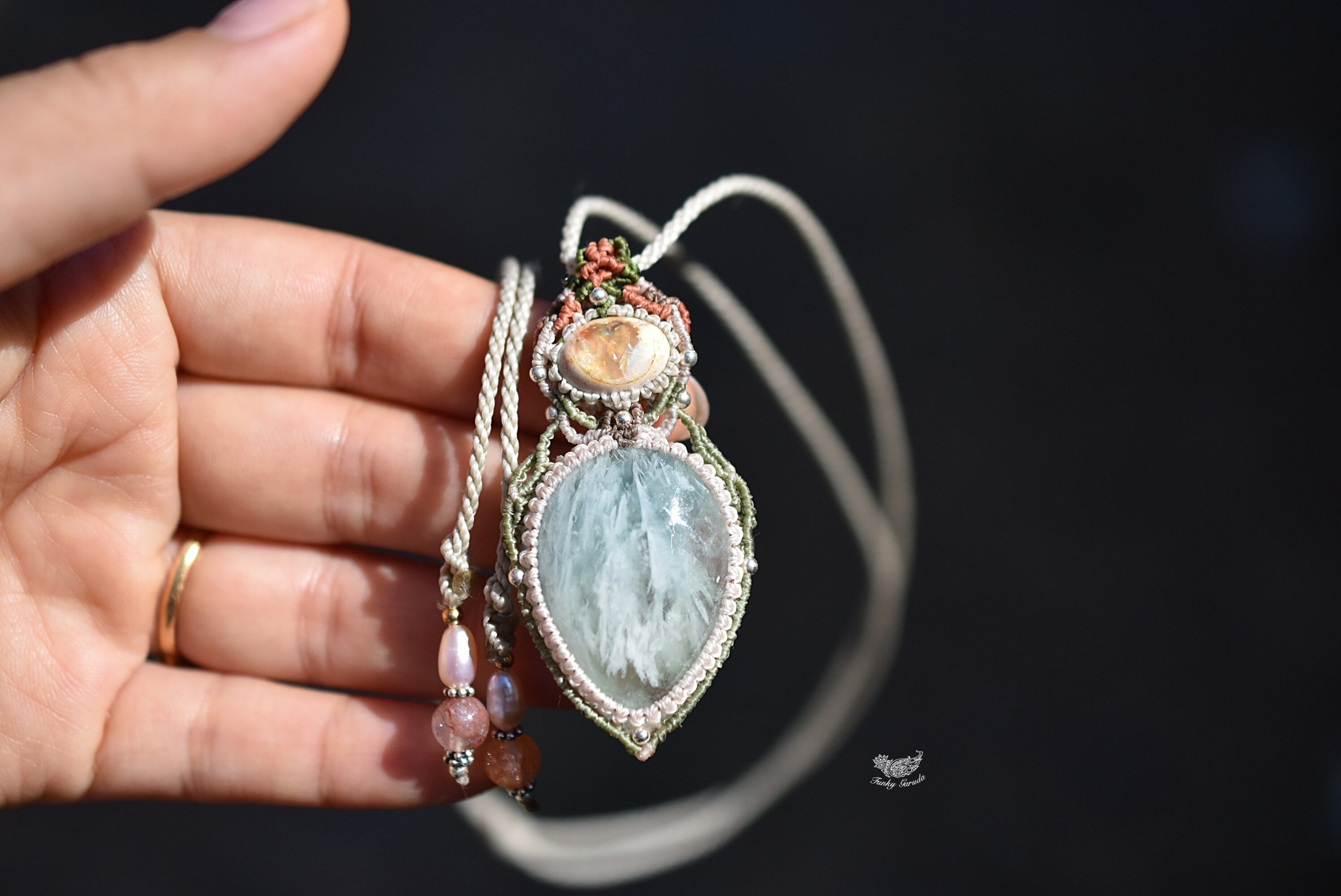 柿色の湖★カンテラオパール エンジェルフェザーフローライト マクラメネックレス1022