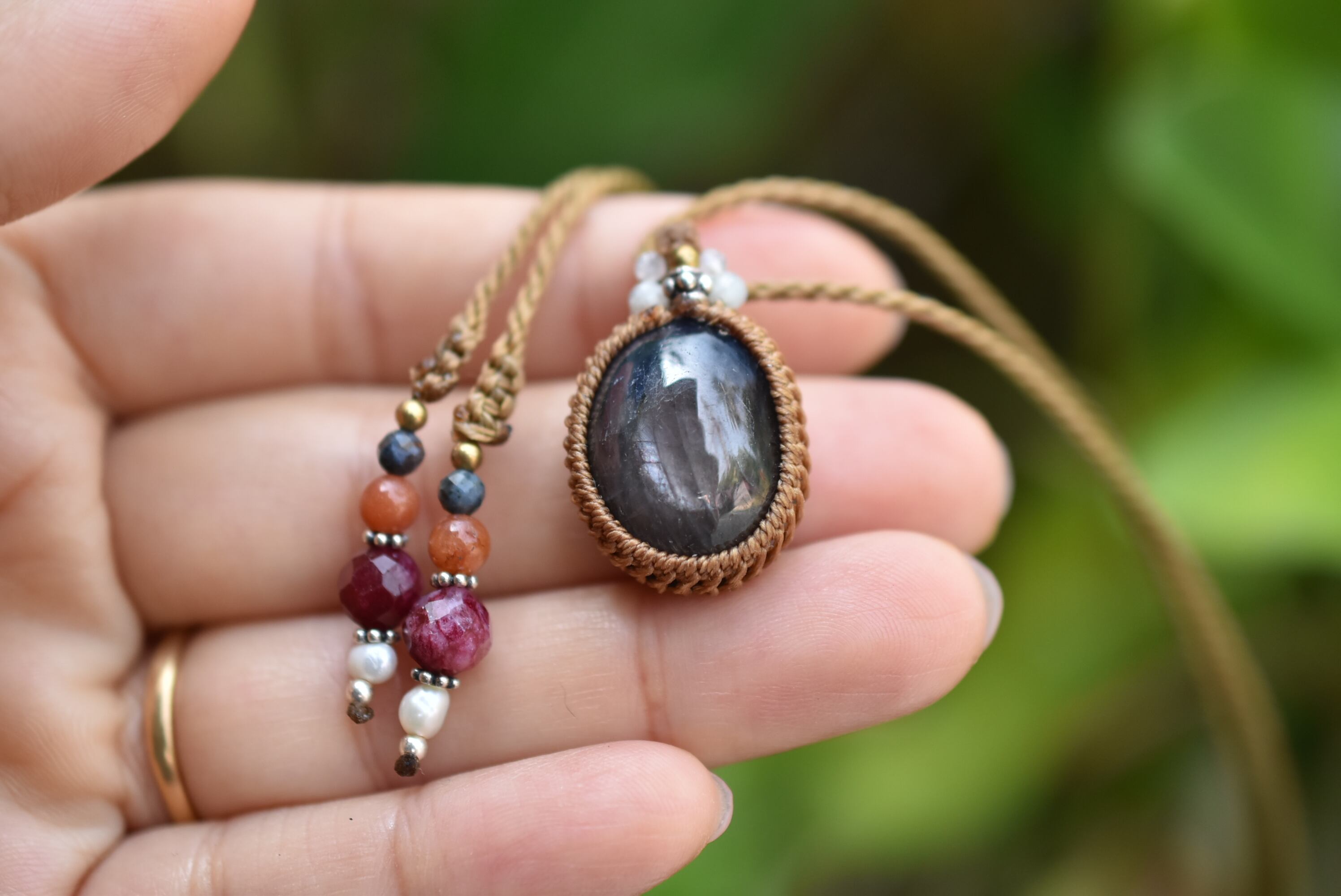 ◆このたびはゴールドブラウン色の蝋引き糸を使用しマクラメ編み装飾を施しました。