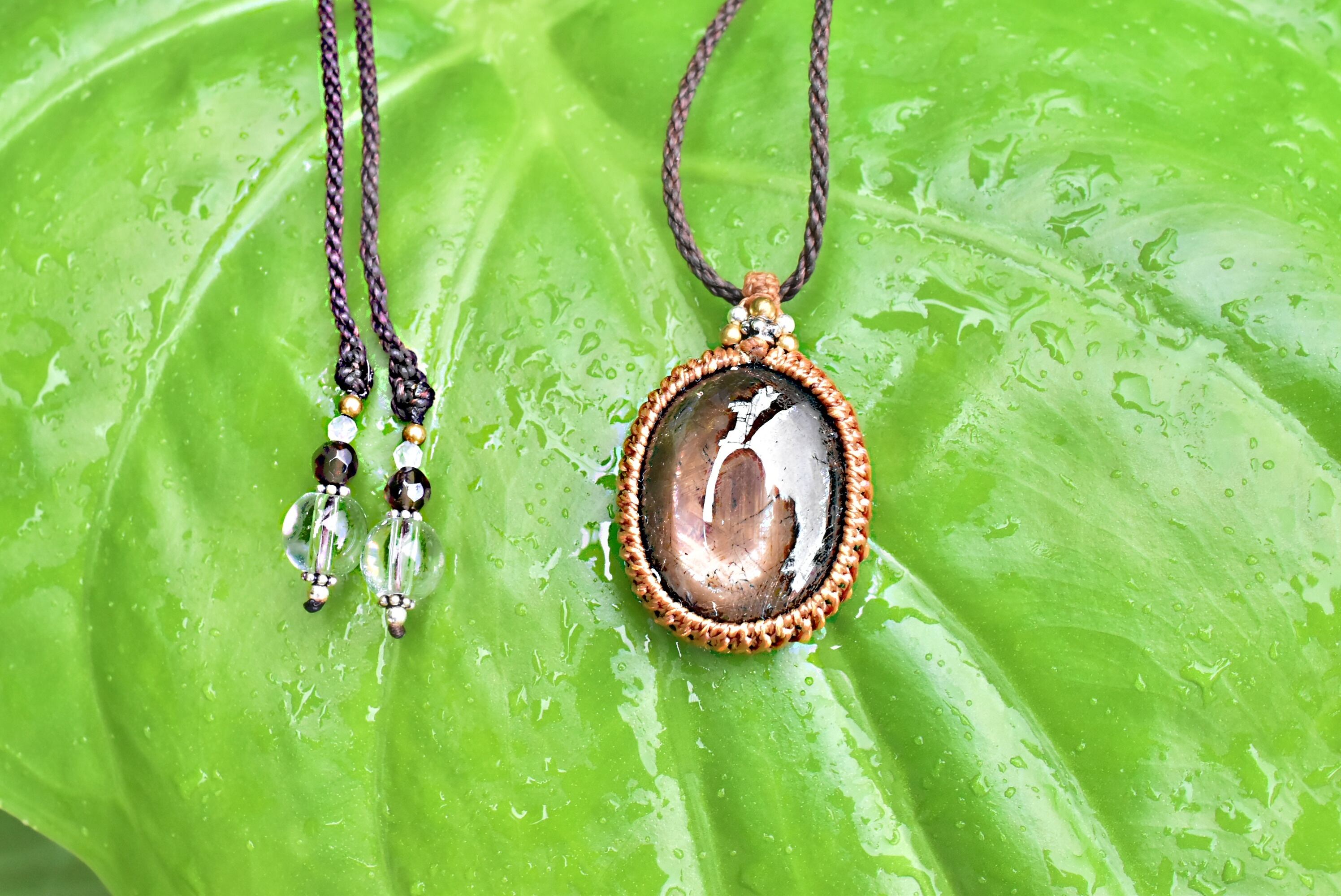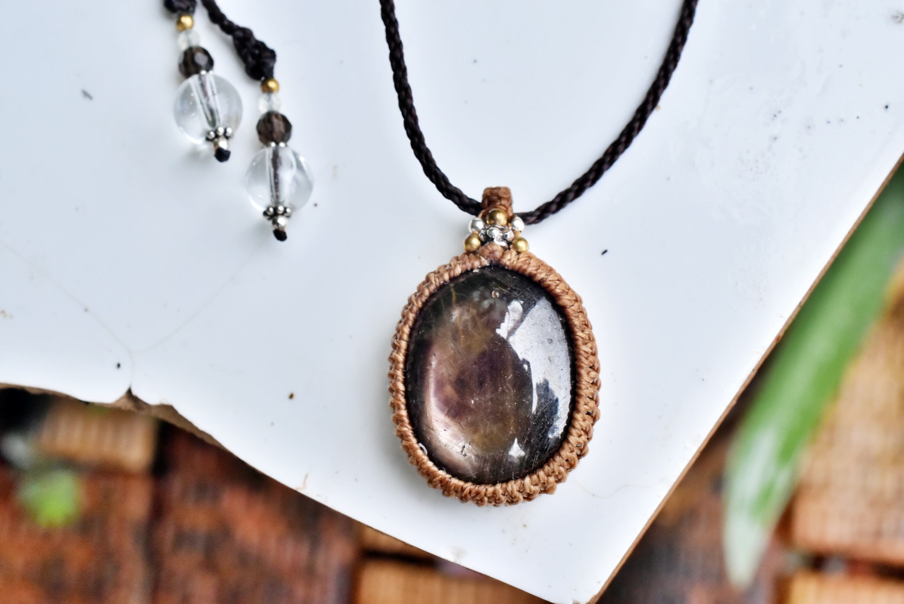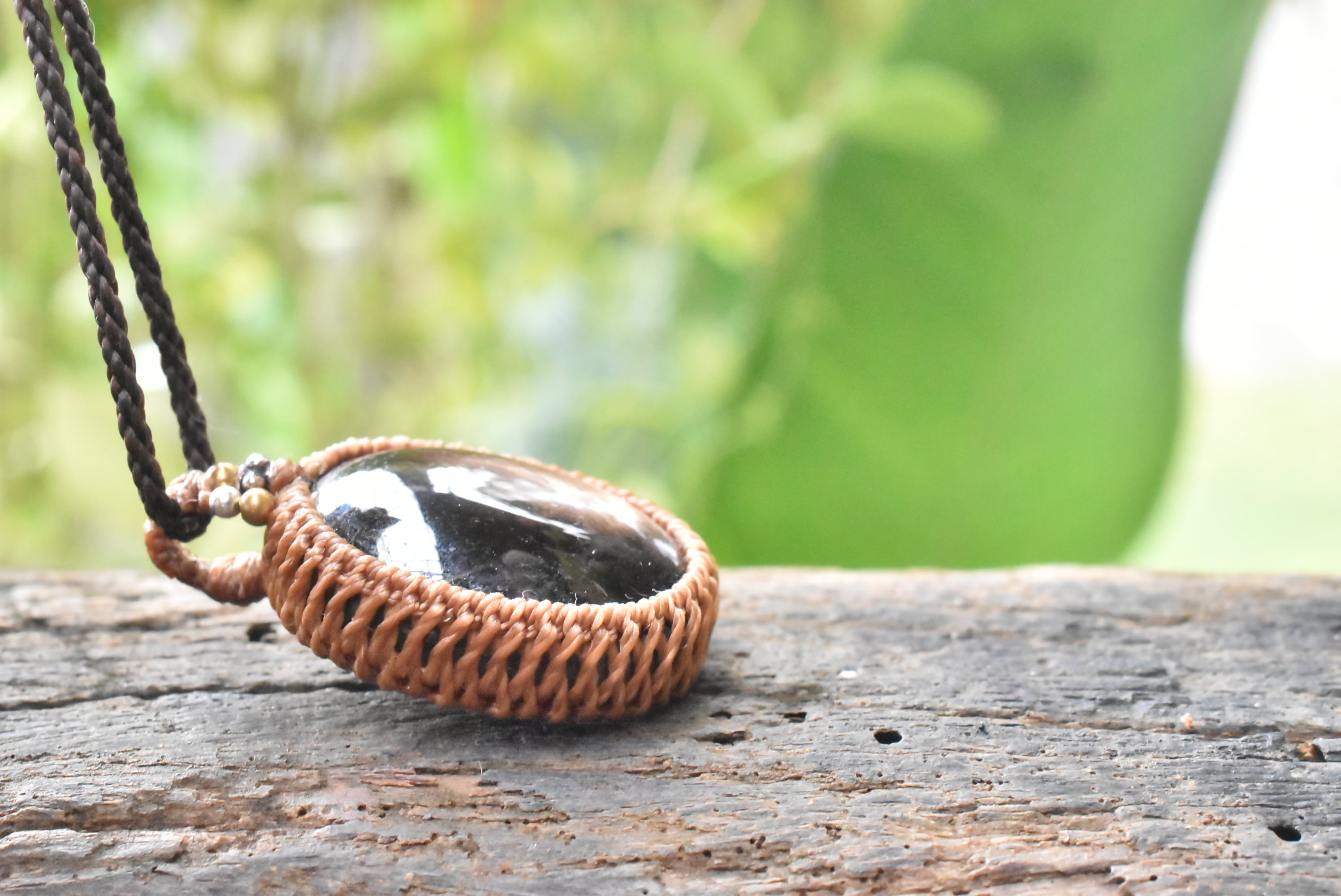 ◆このたびはコーヒーブラウン、ダークブラウン色の蝋引き糸を使用しマクラメ編み装飾を施しました。