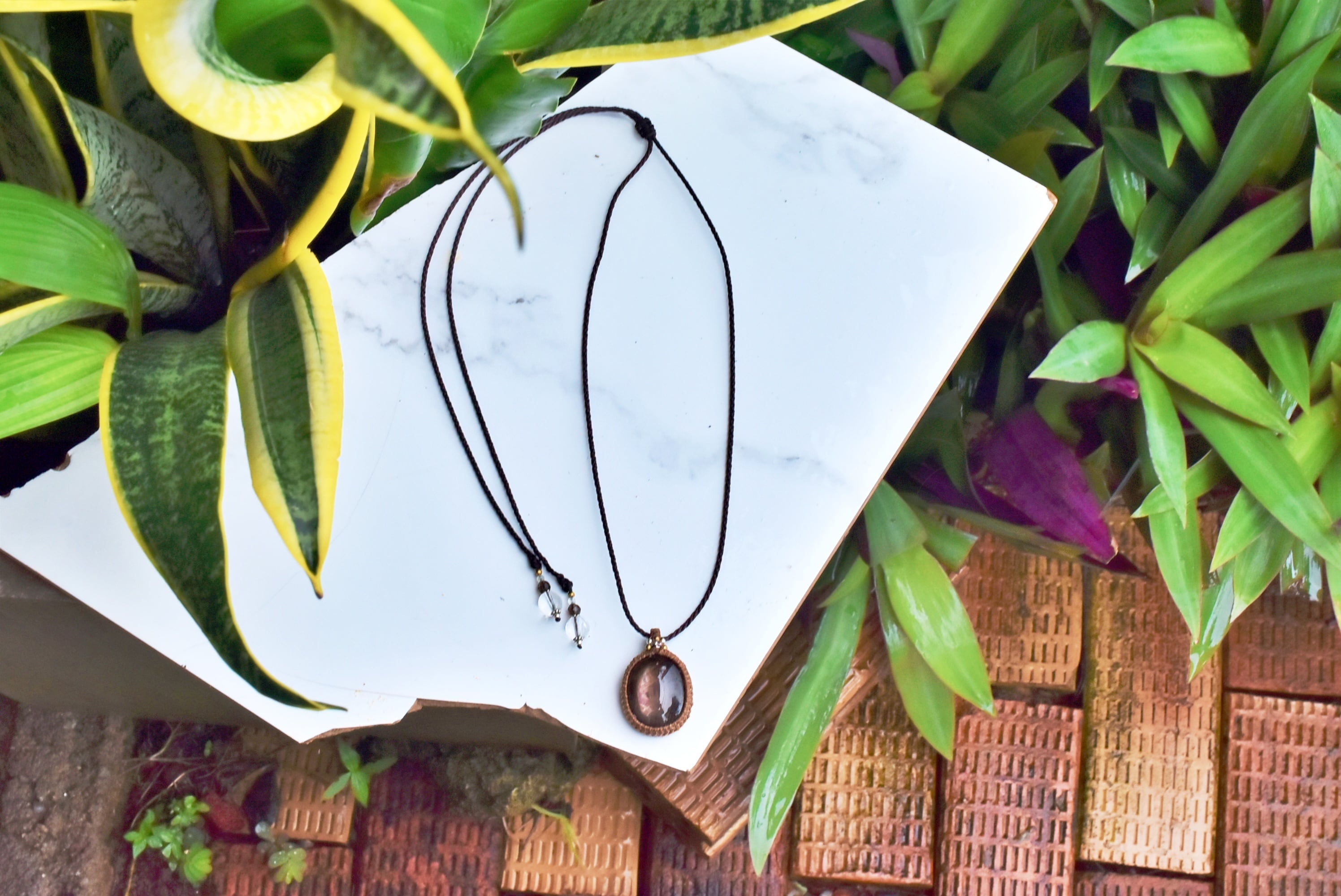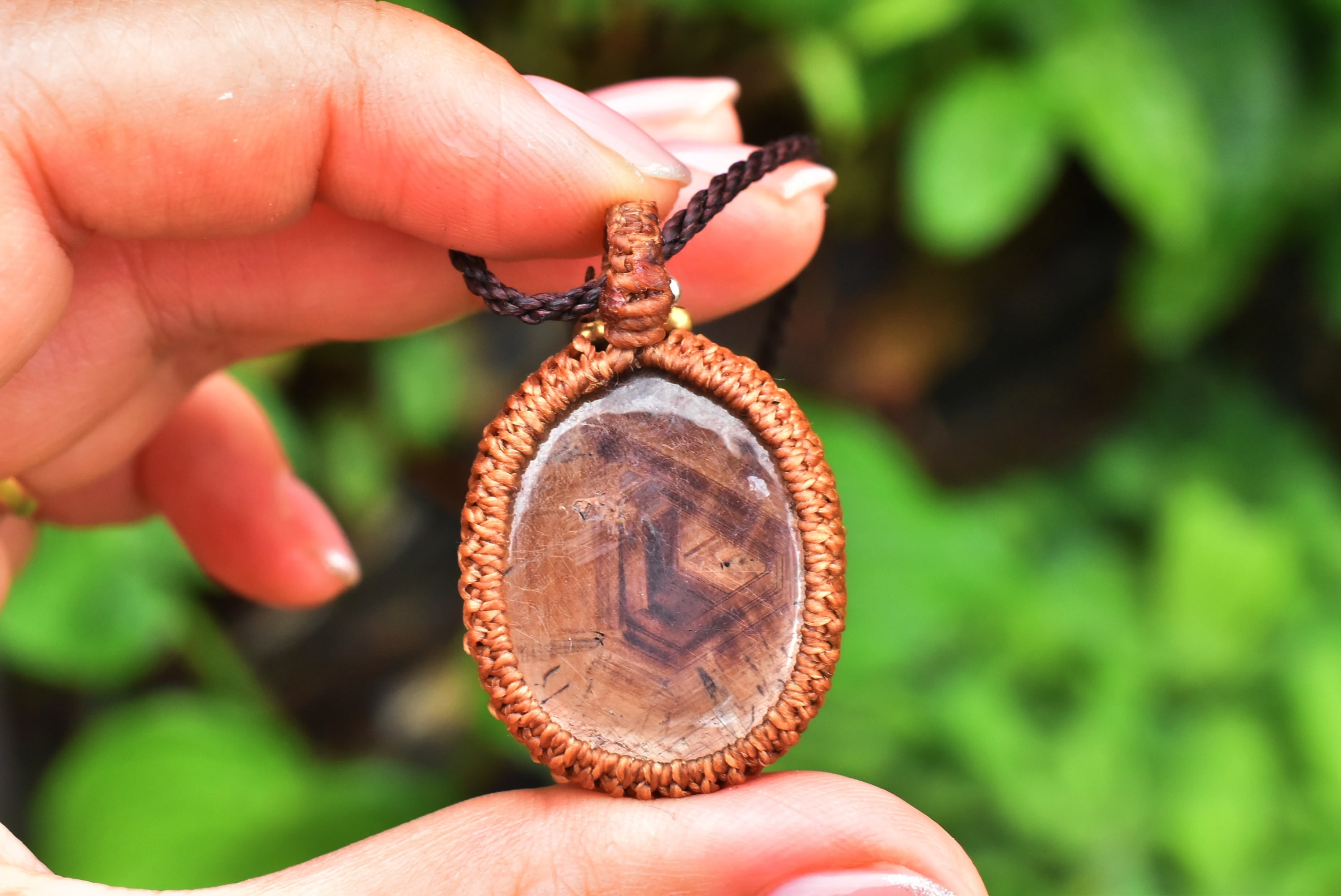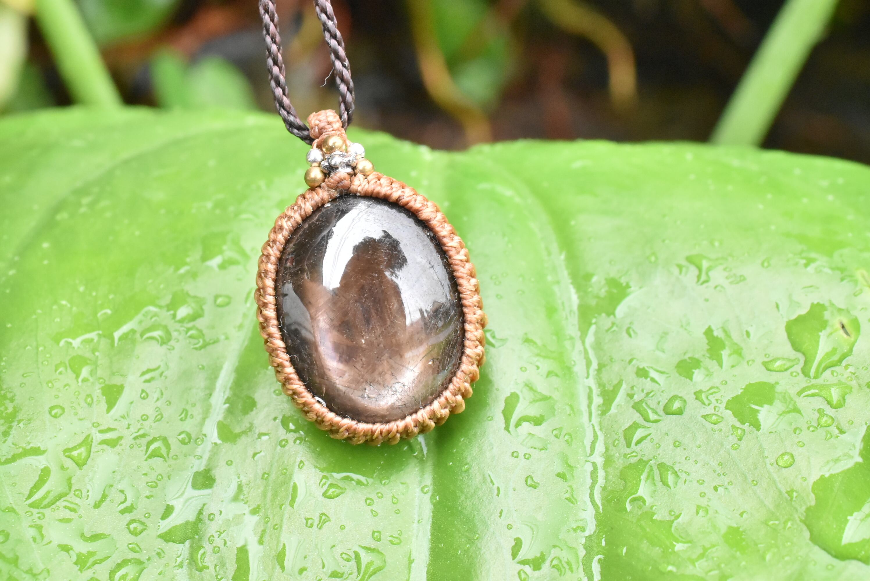 ◆このたびはコーヒーブラウン、ダークブラウン色の蝋引き糸を使用しマクラメ編み装飾を施しました。