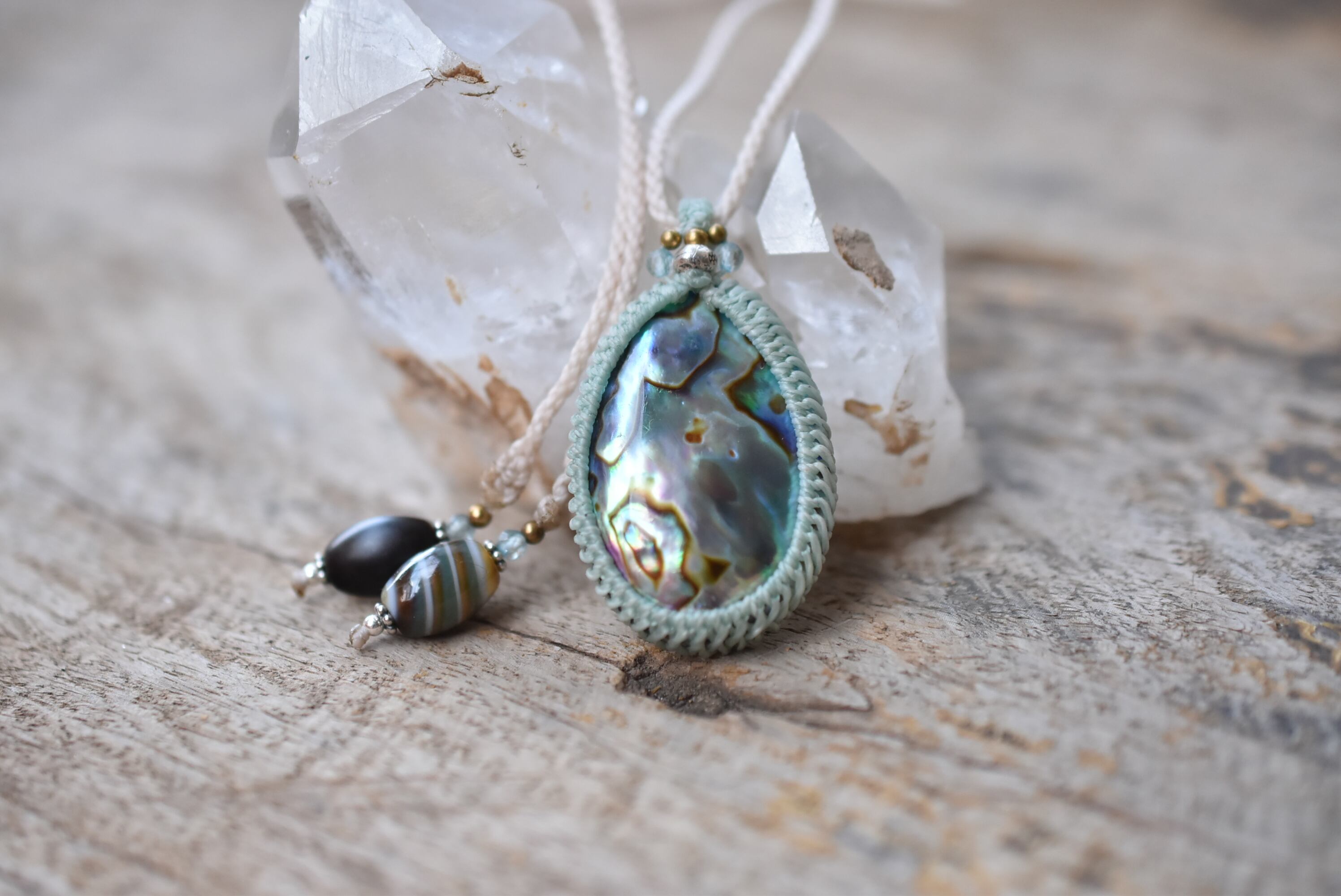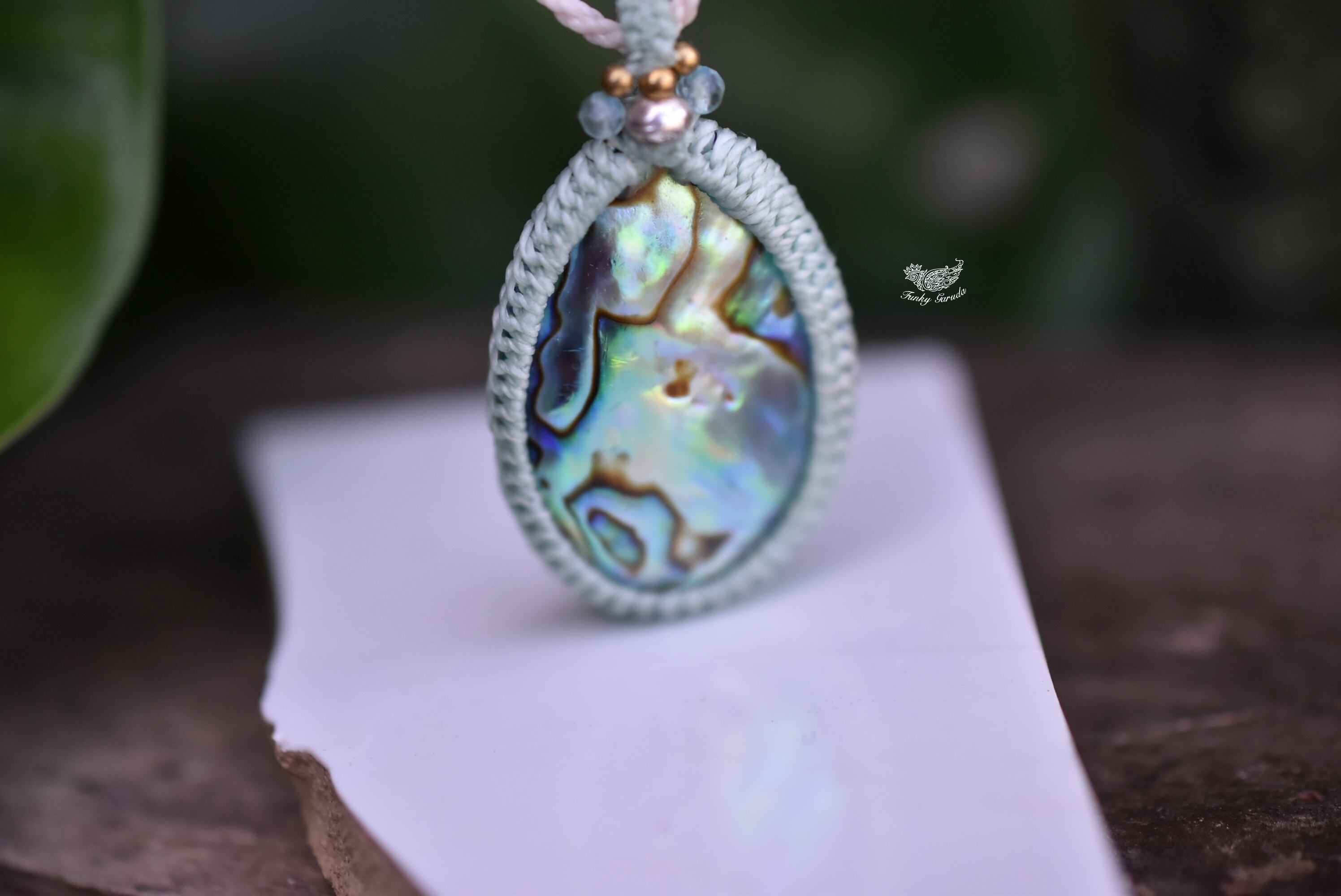 ◆このたびはミント、ナチュラルホワイト色の蝋引き糸を使用しマクラメ編み装飾を施しました。