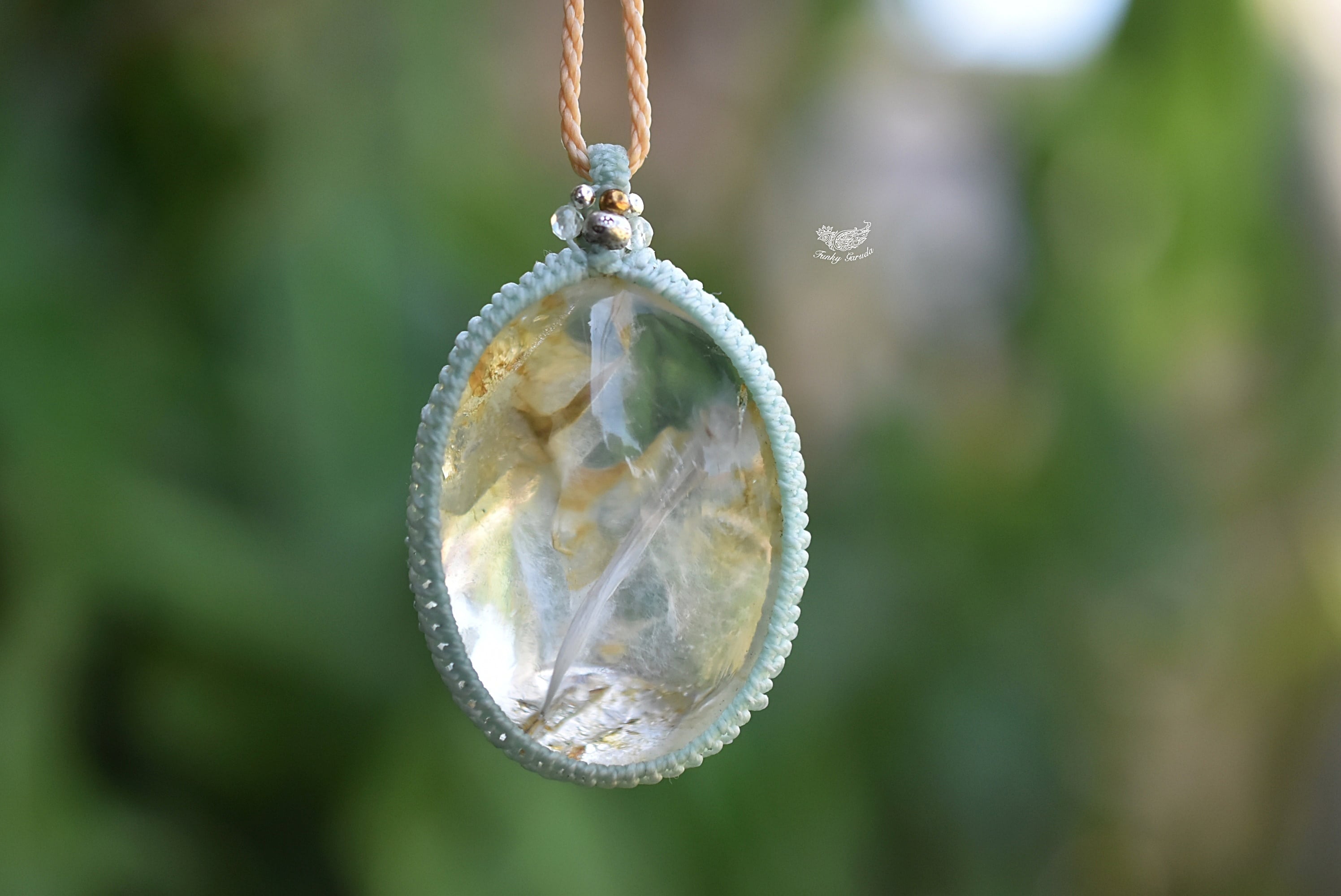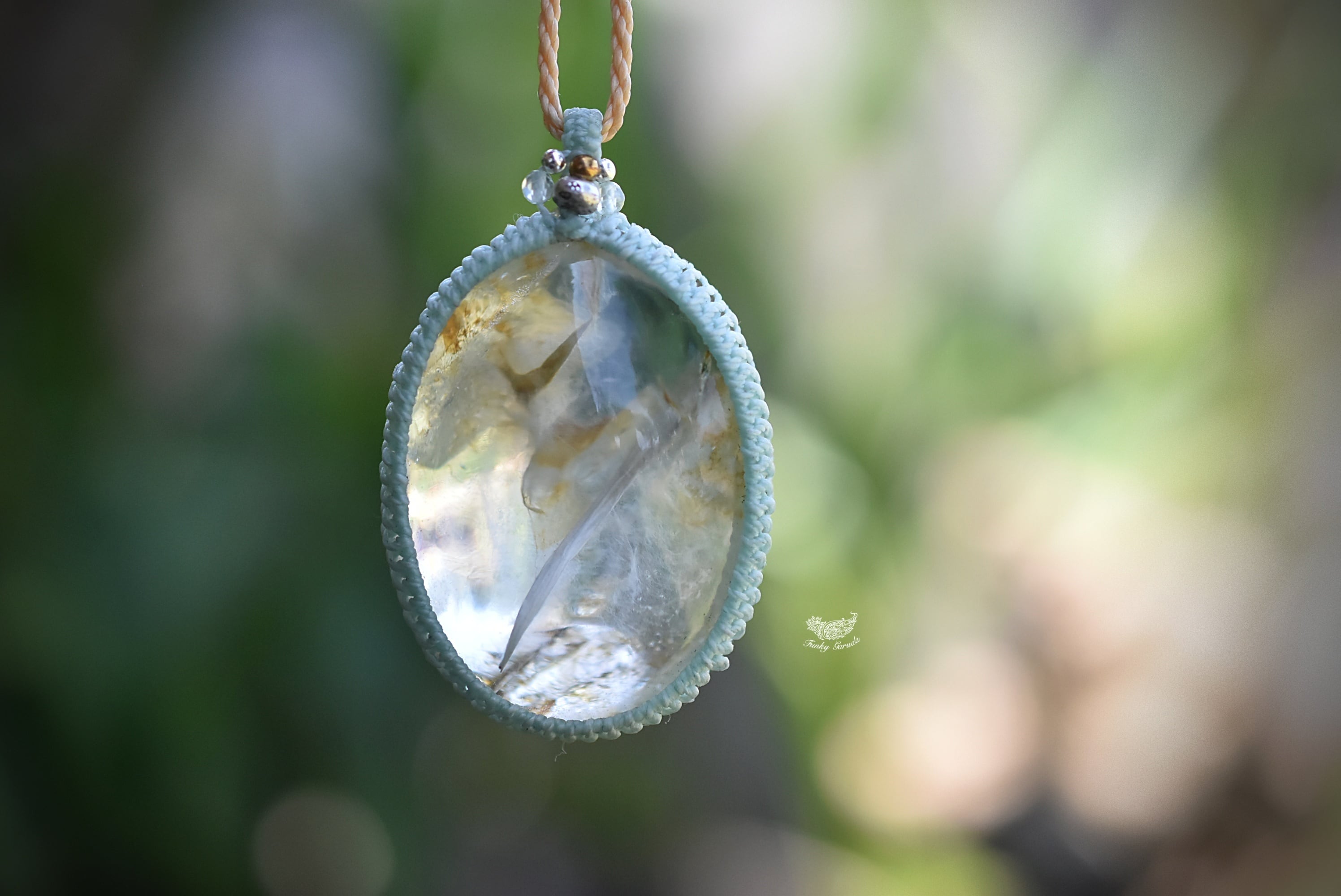 ◆このたびはミント、キャラメル色の蝋引き糸を使用しマクラメ編み装飾を施しました。