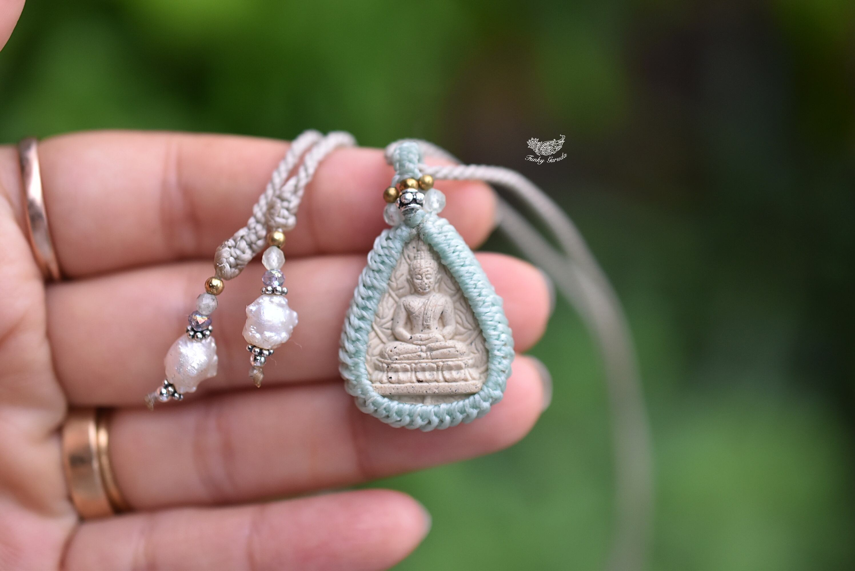 ◆このたびはミント、ナチュラルホワイト色の蝋引き糸を使用しマクラメ編み装飾を施しました。