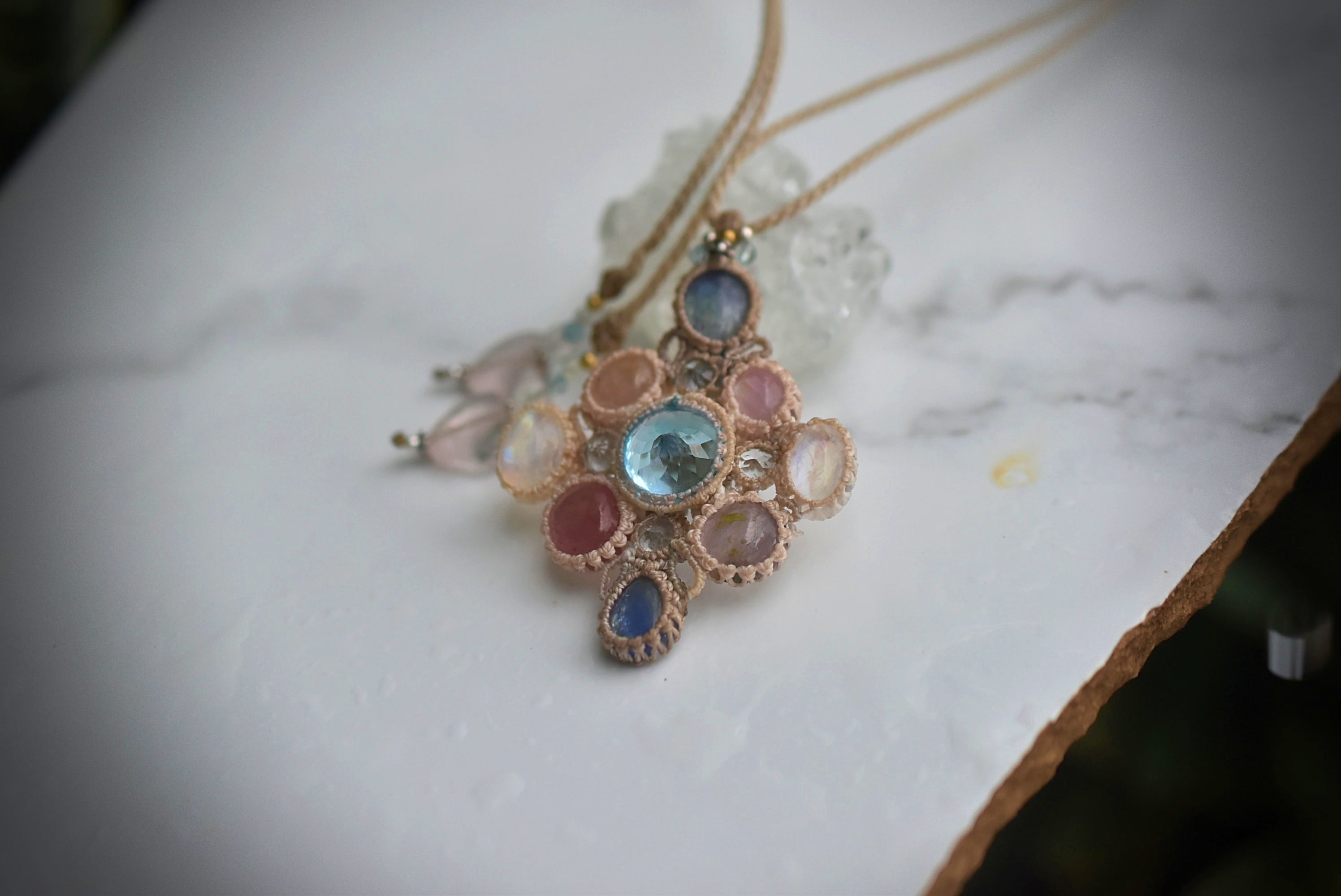 ◆このたびは、ナチュラルホワイト、カフェオレ色の蝋引き糸を使用しマクラメ編み装飾を施しました。
