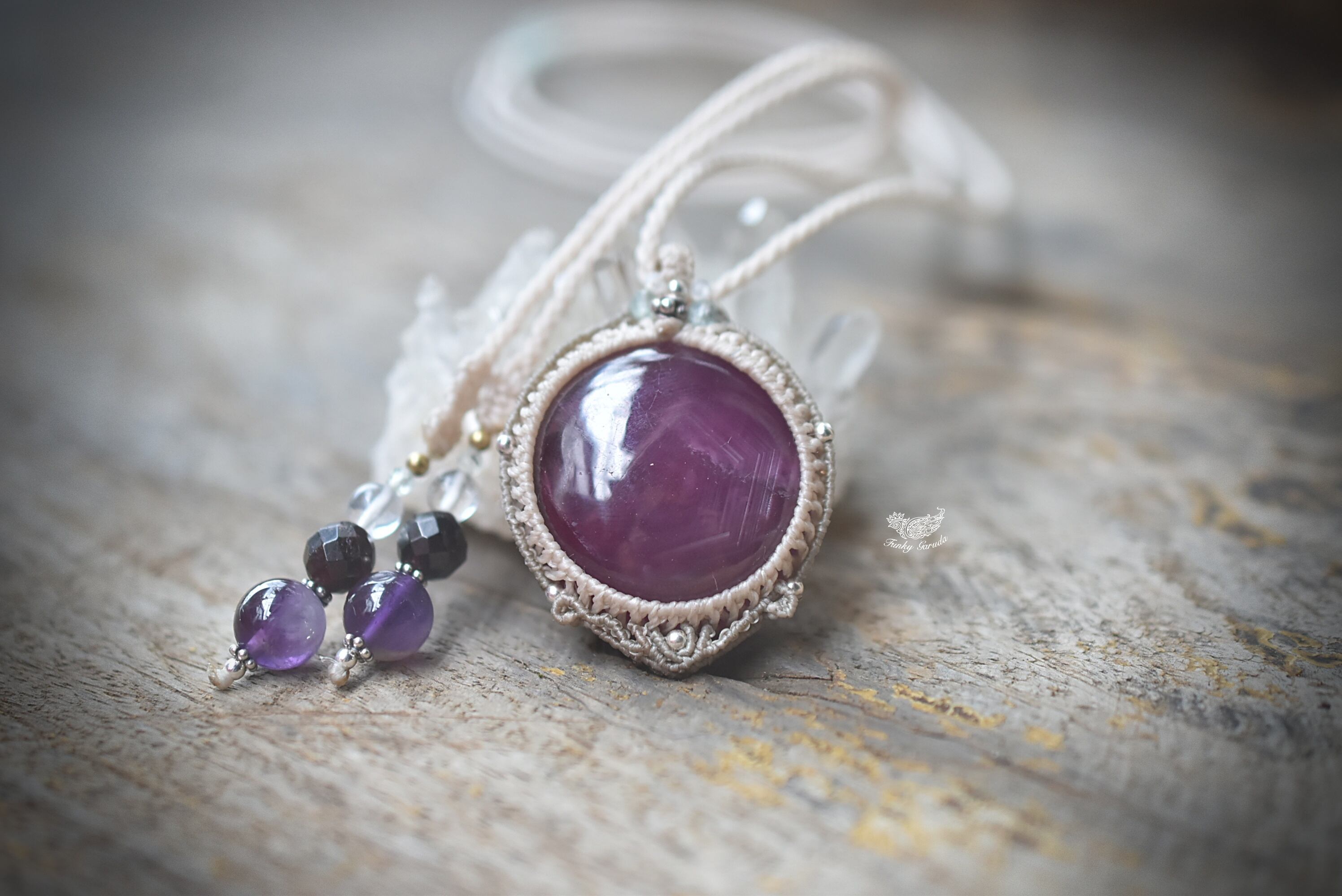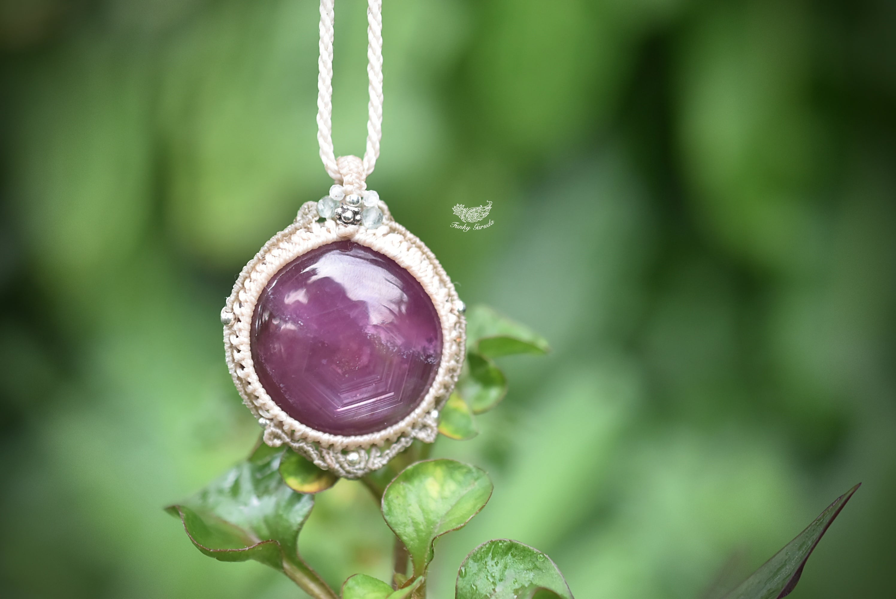 ◆このたびはカフェオレ・ナチュラルホワイト色の蝋引き糸を使用しマクラメ編み装飾を施しました。