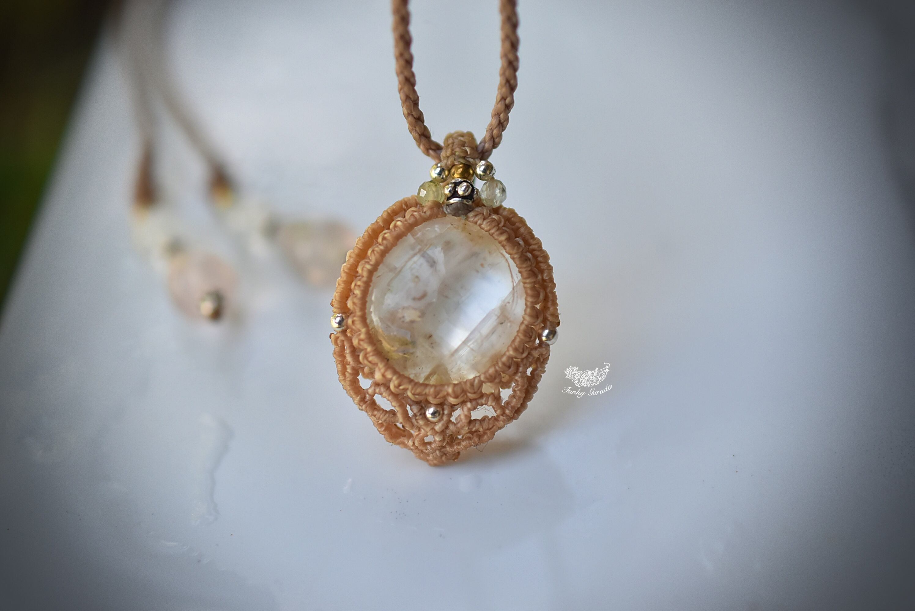 ◆このたびはキャラメル、カフェオレ色の蝋引き糸を使用しマクラメ編み装飾を施しました。
