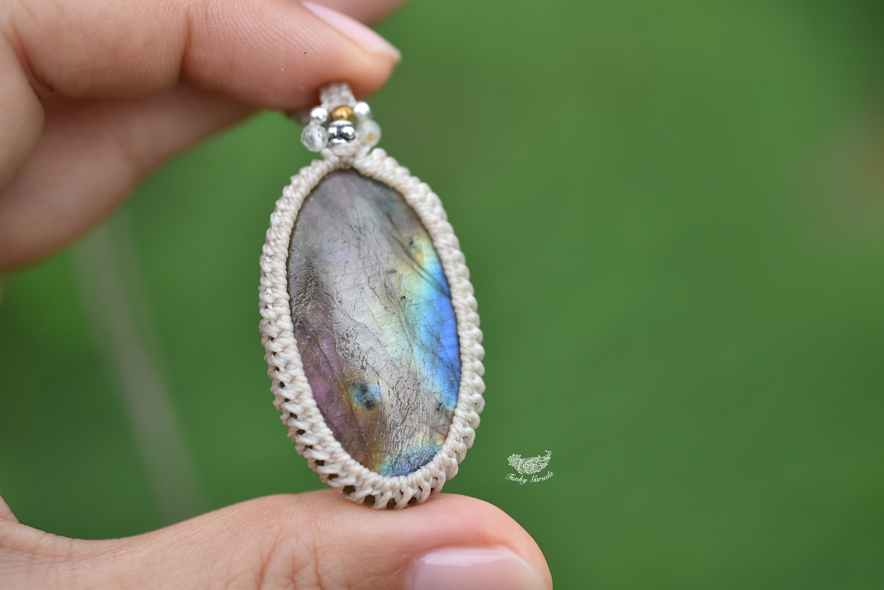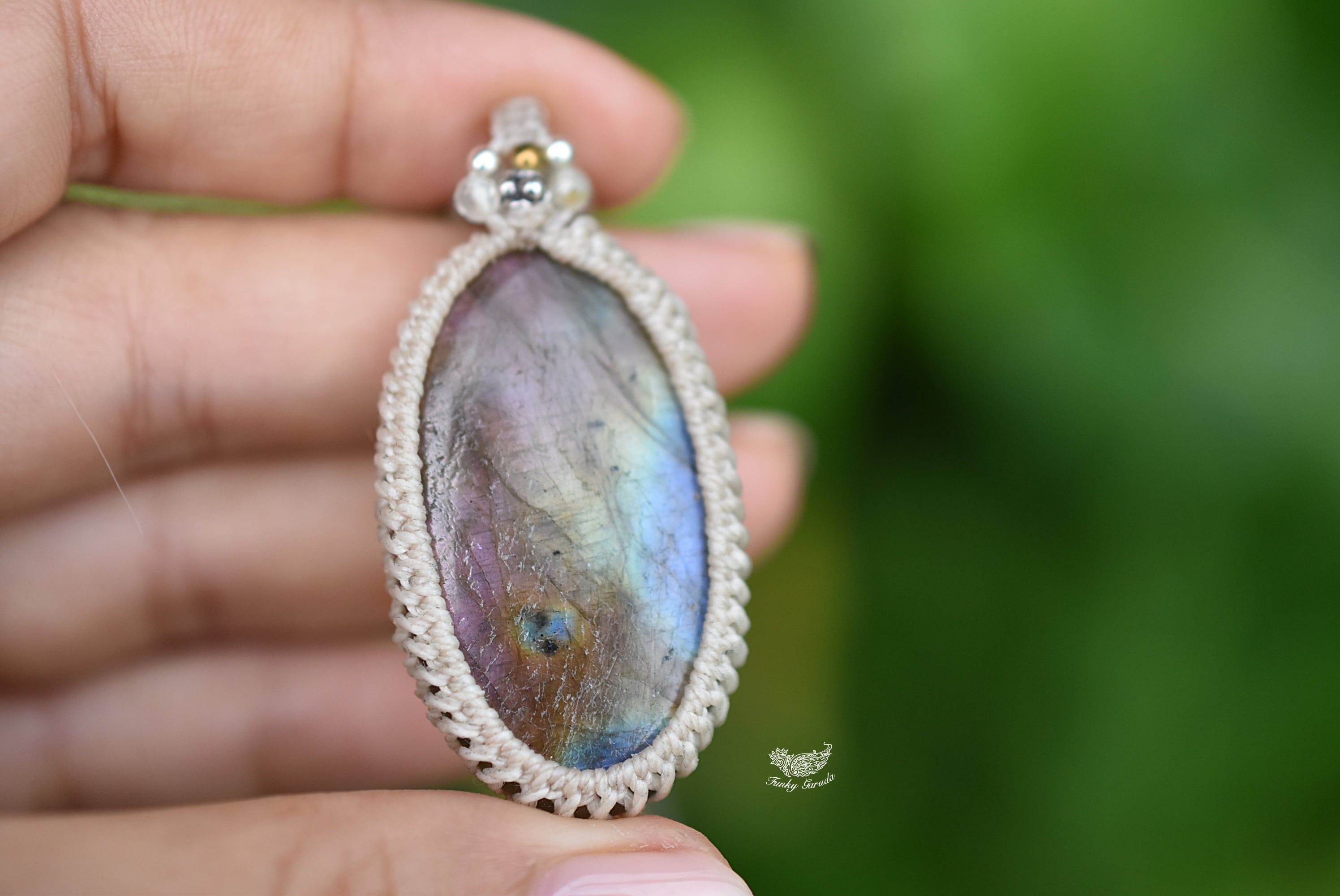 ◆このたびはナチュラルホワイト色の蝋引き糸を使用しマクラメ編み装飾を施しました。