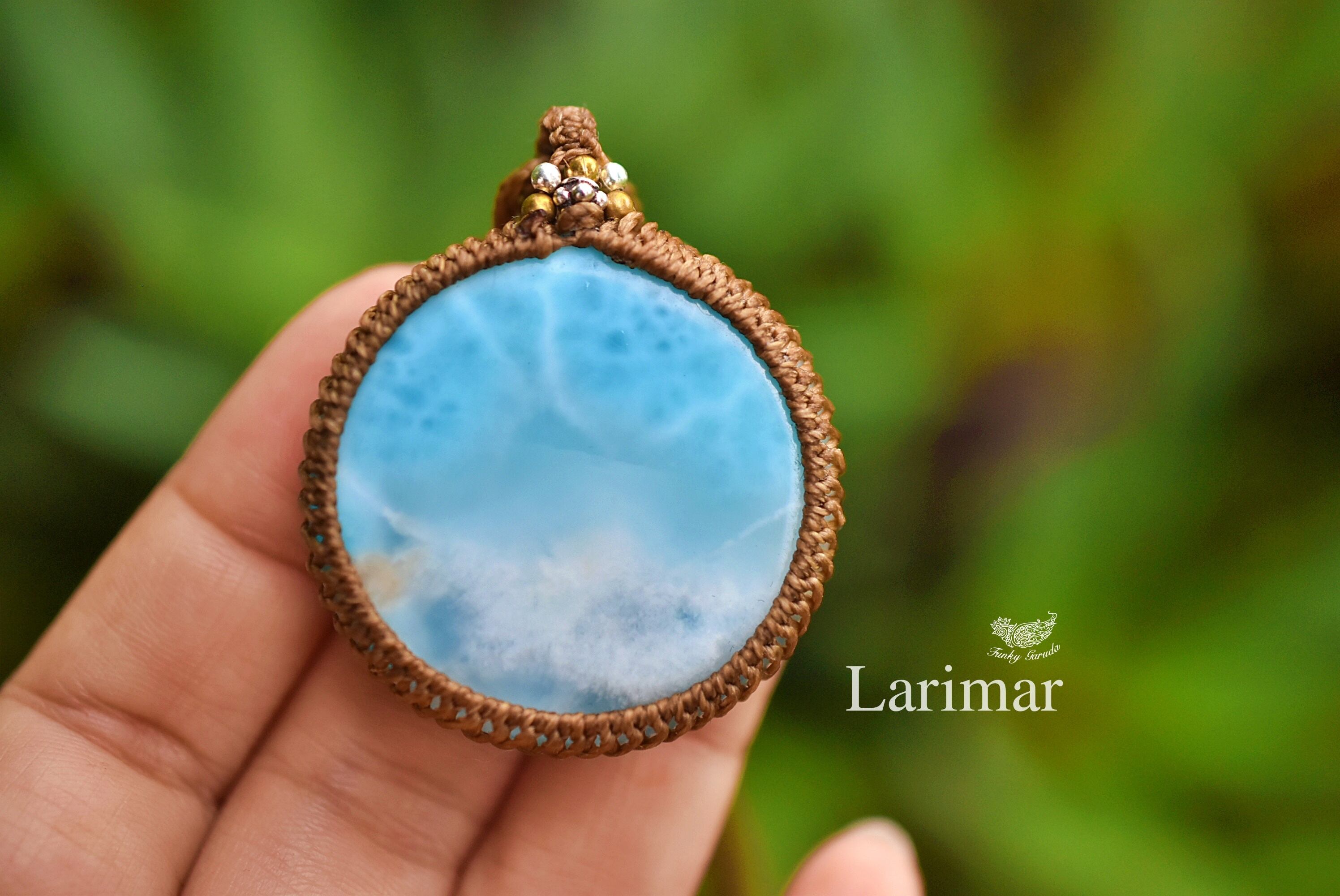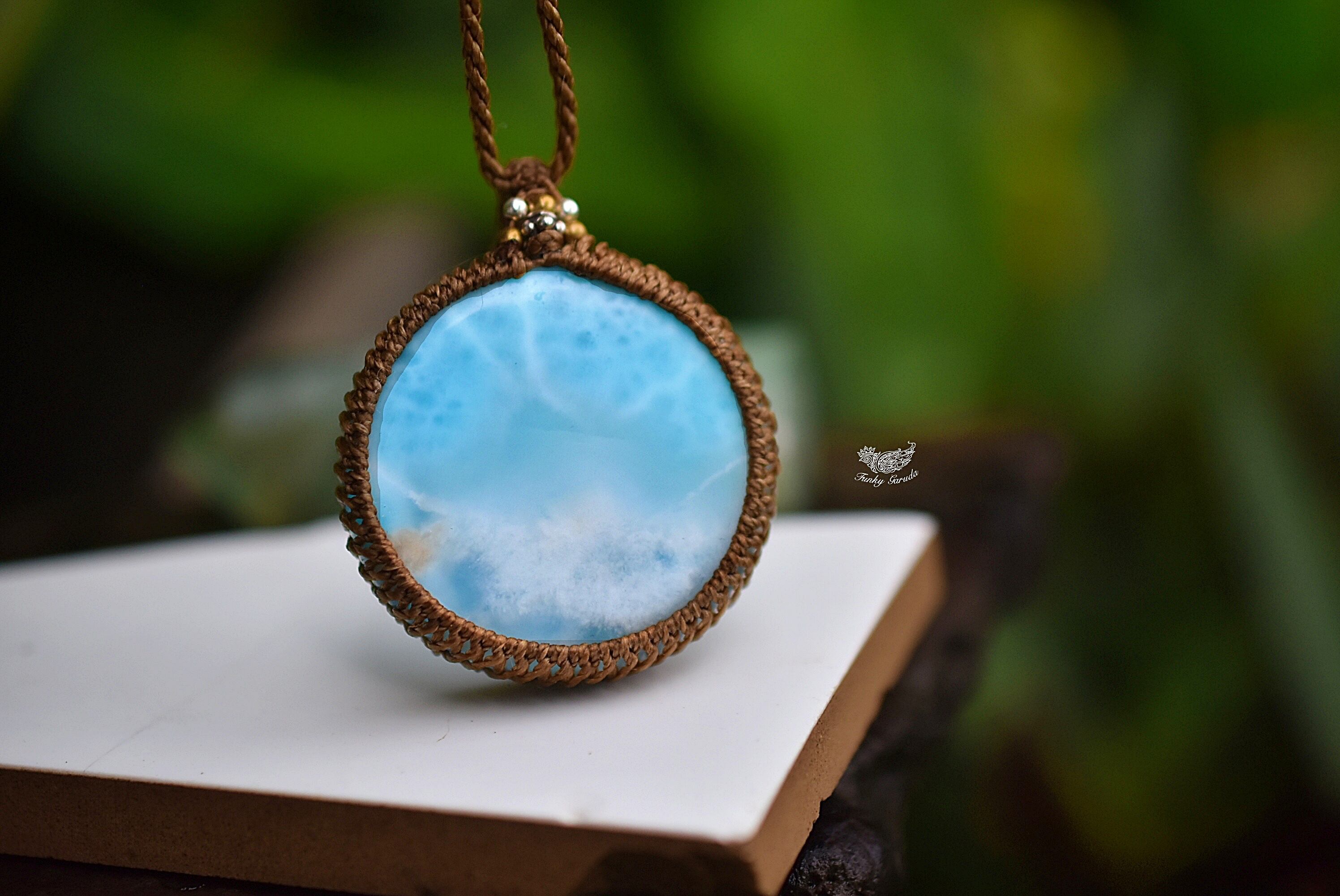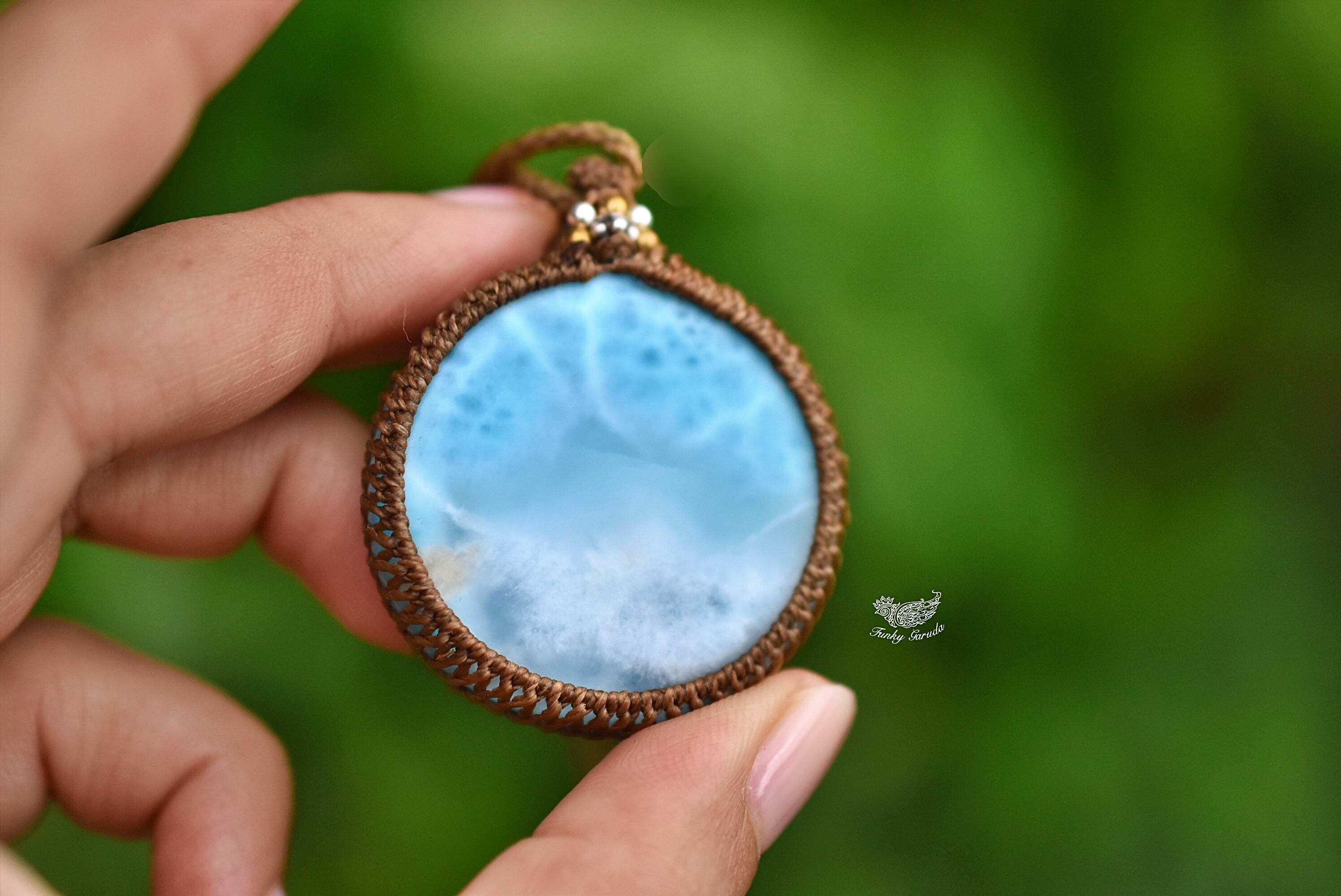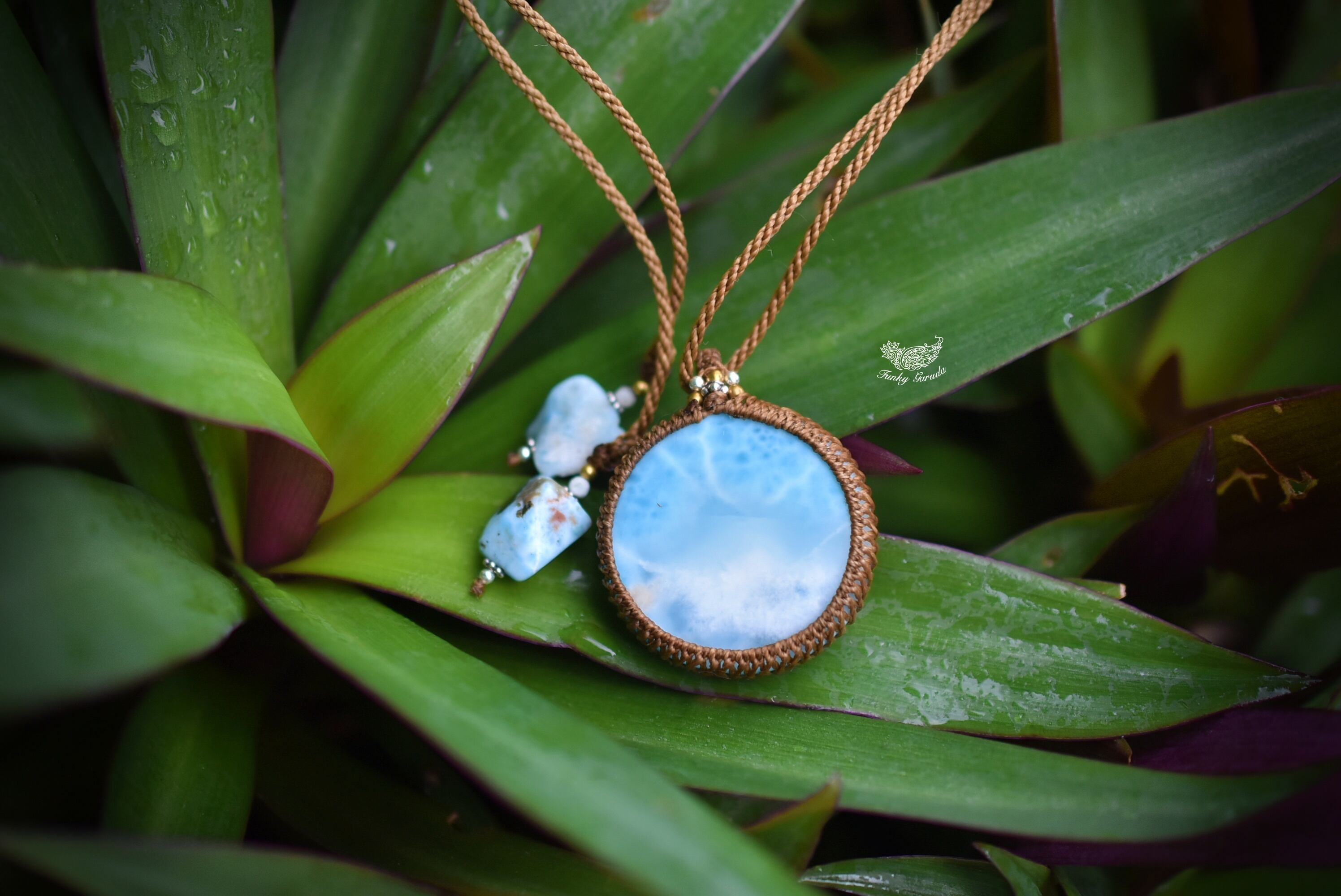 ◆このたびはゴールドブラウン色の蝋引き糸を使用しマクラメ編み装飾を施しました。