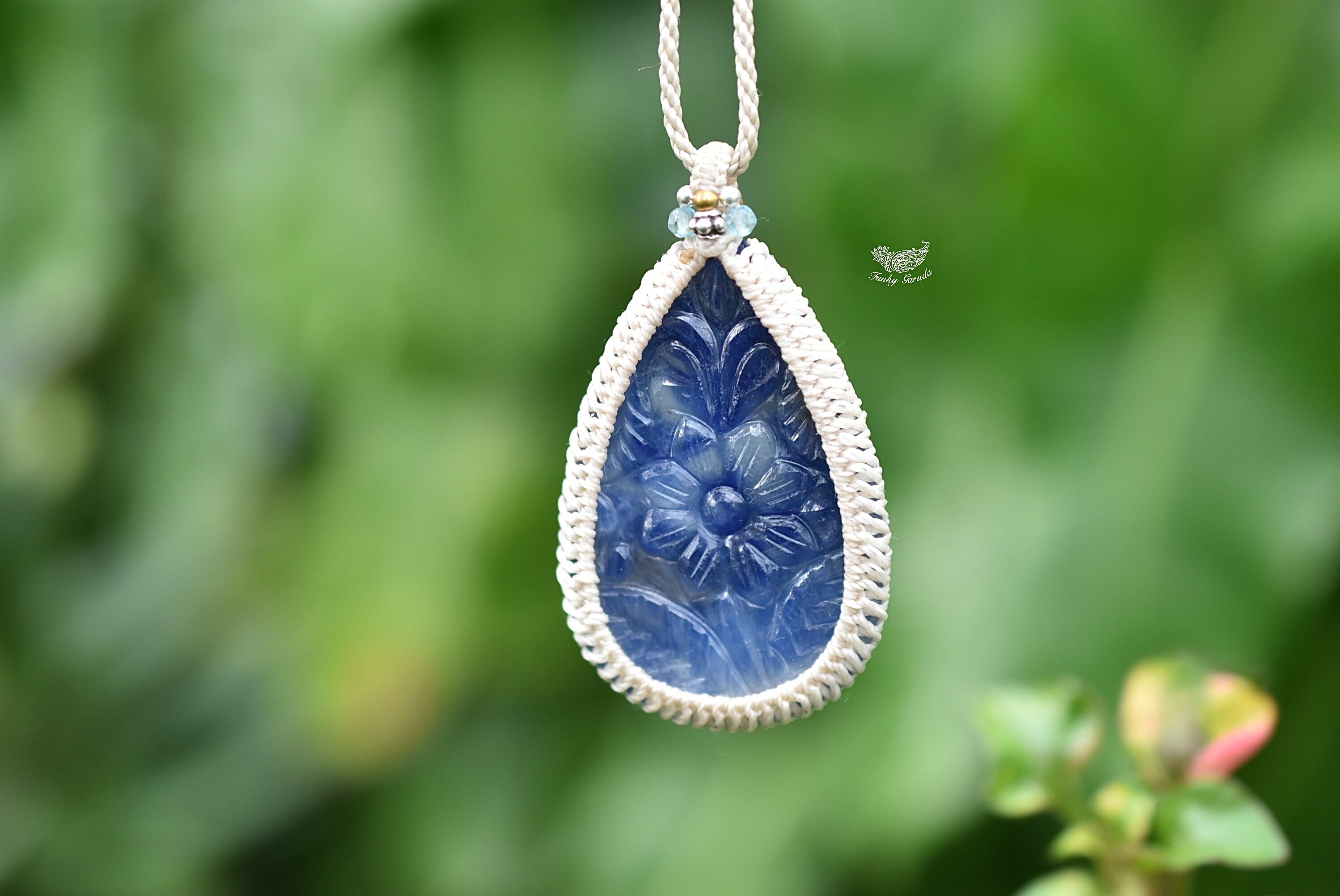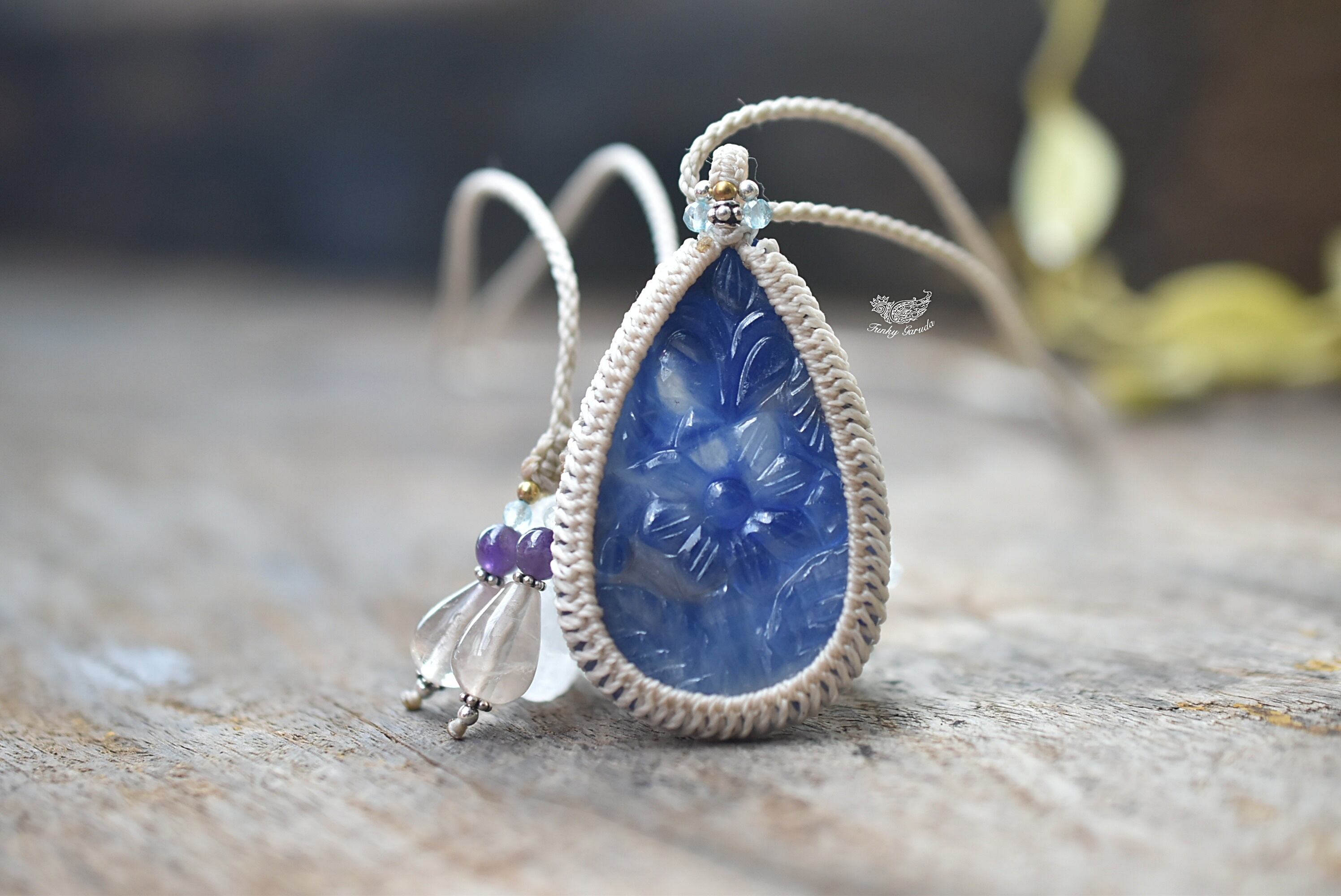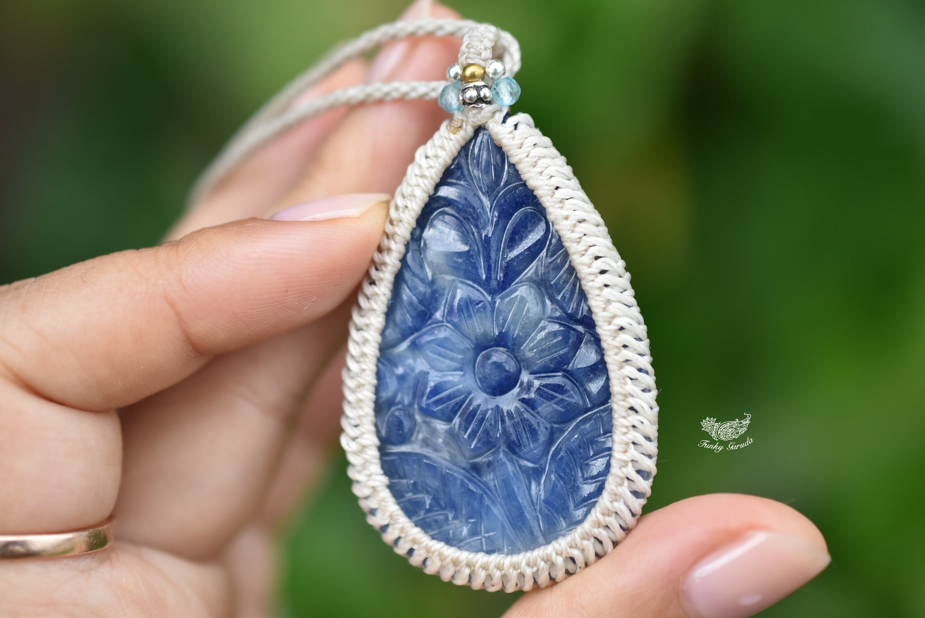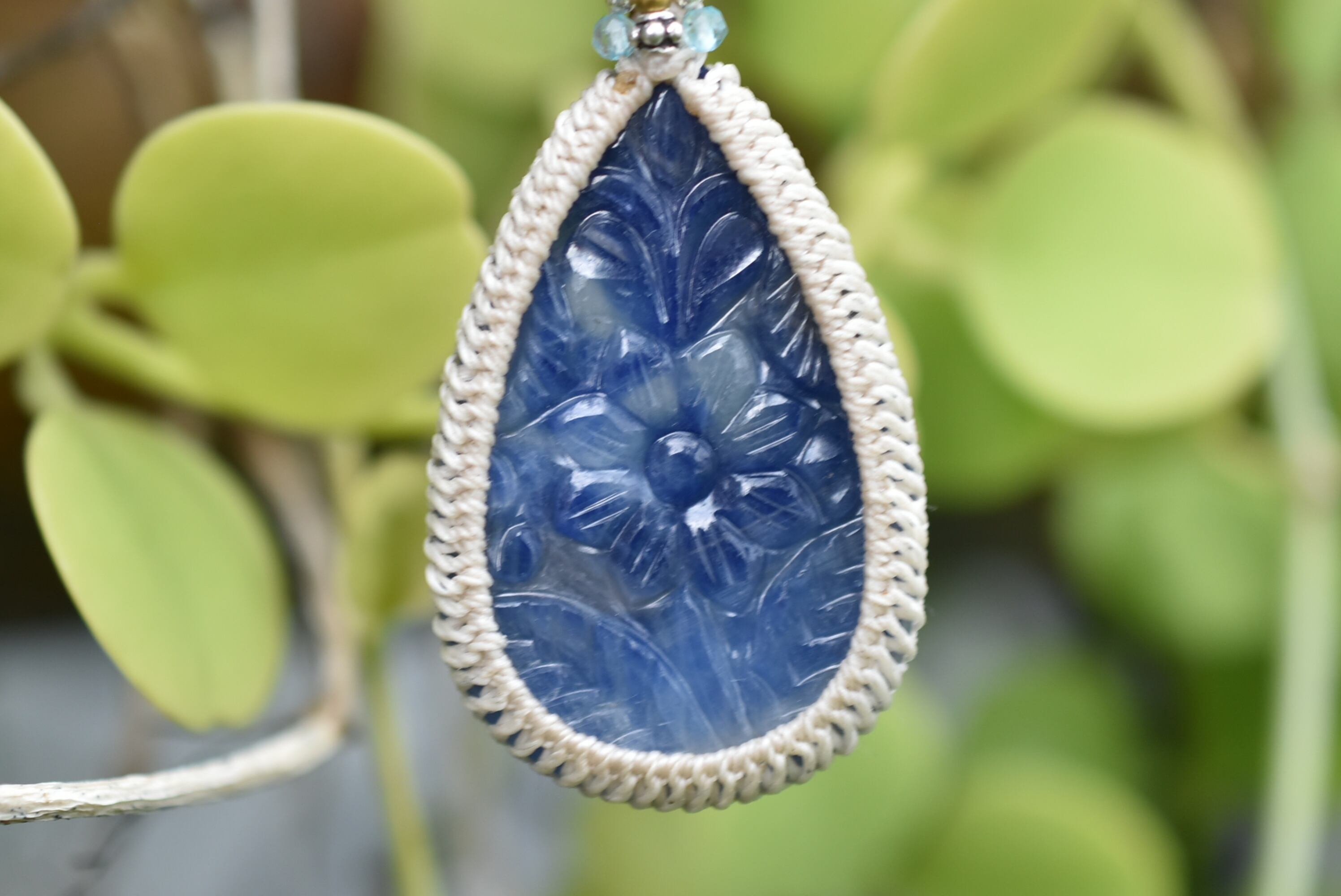 大粒★手仕事花彫刻★blue sapphire マクラメネックレス1107