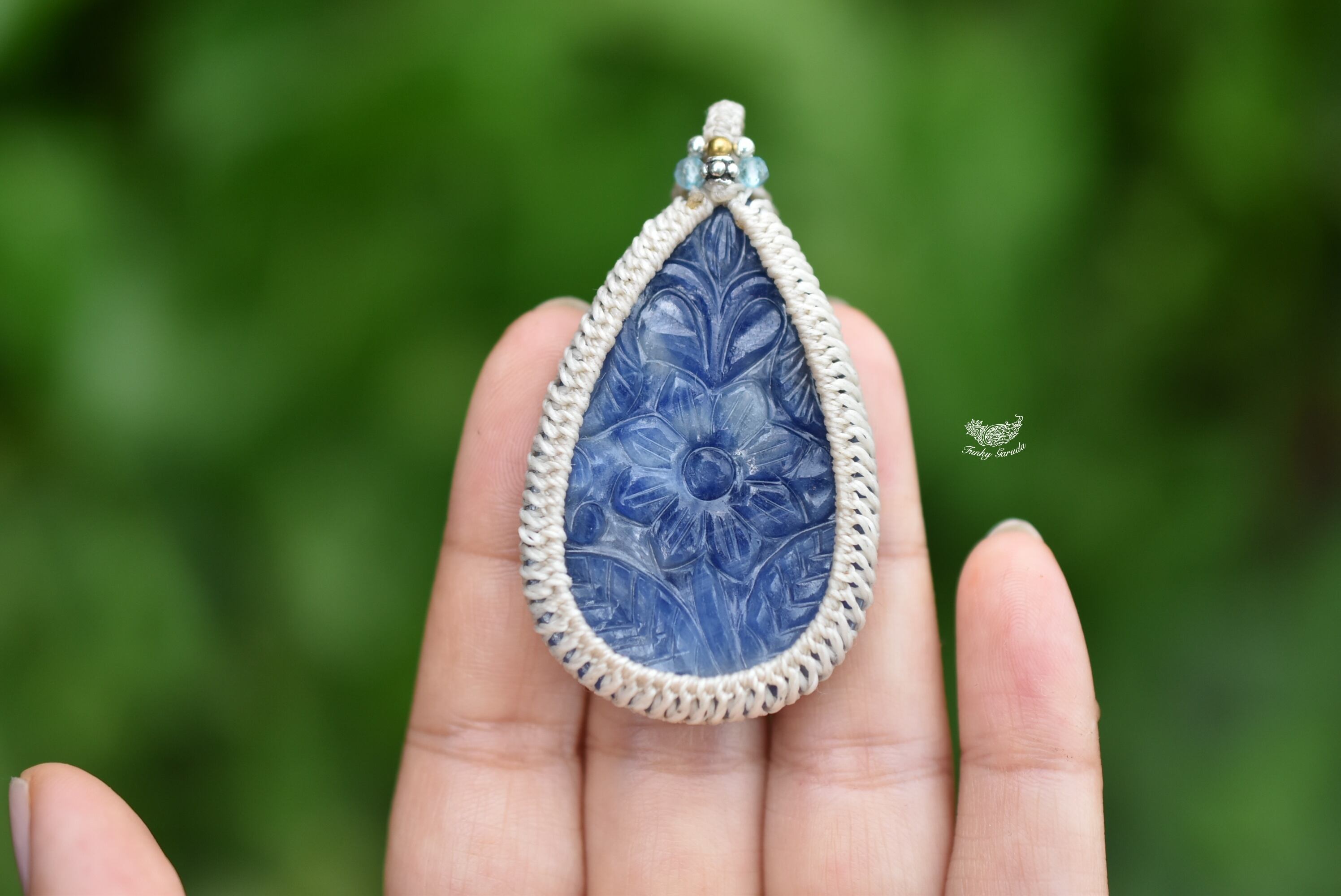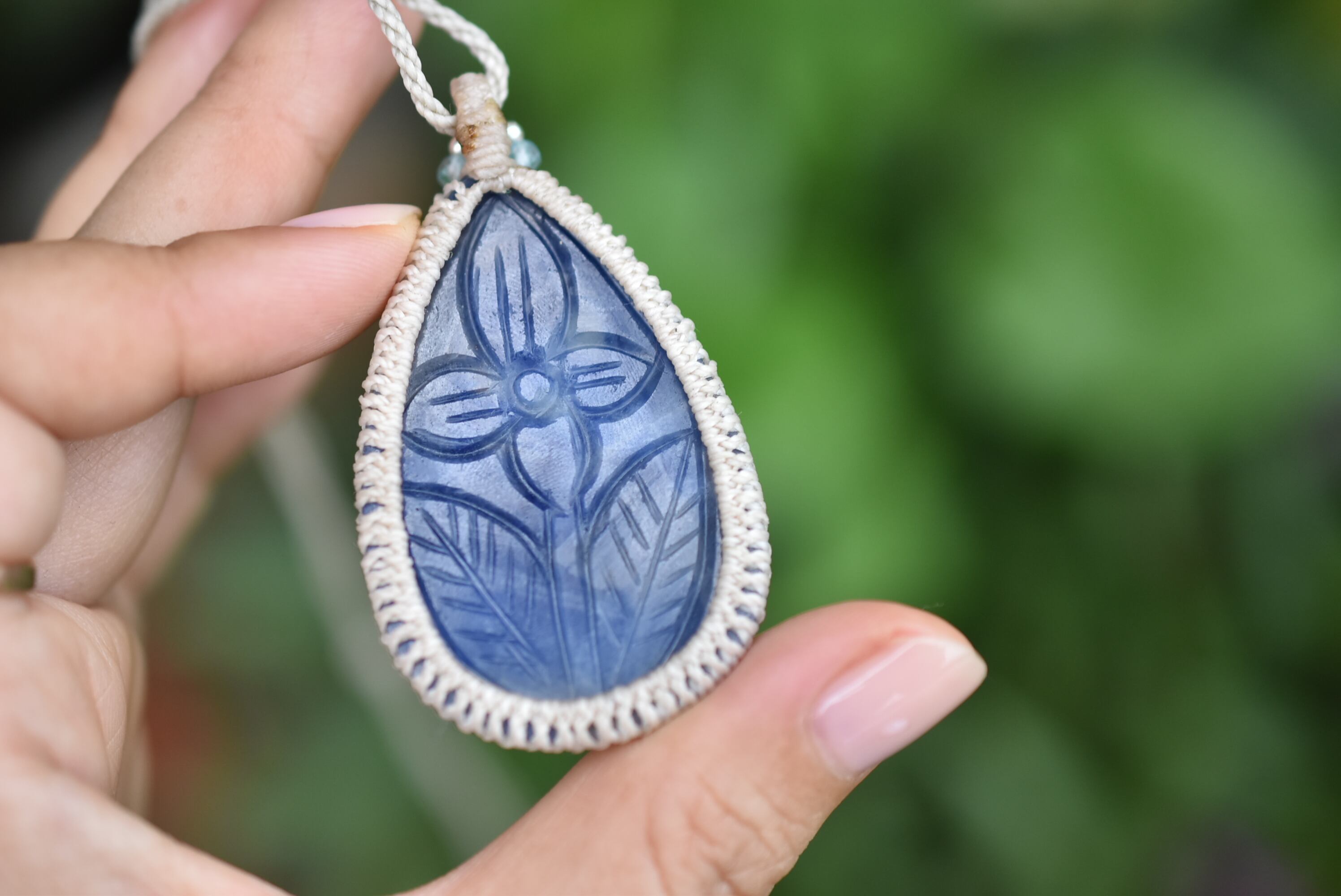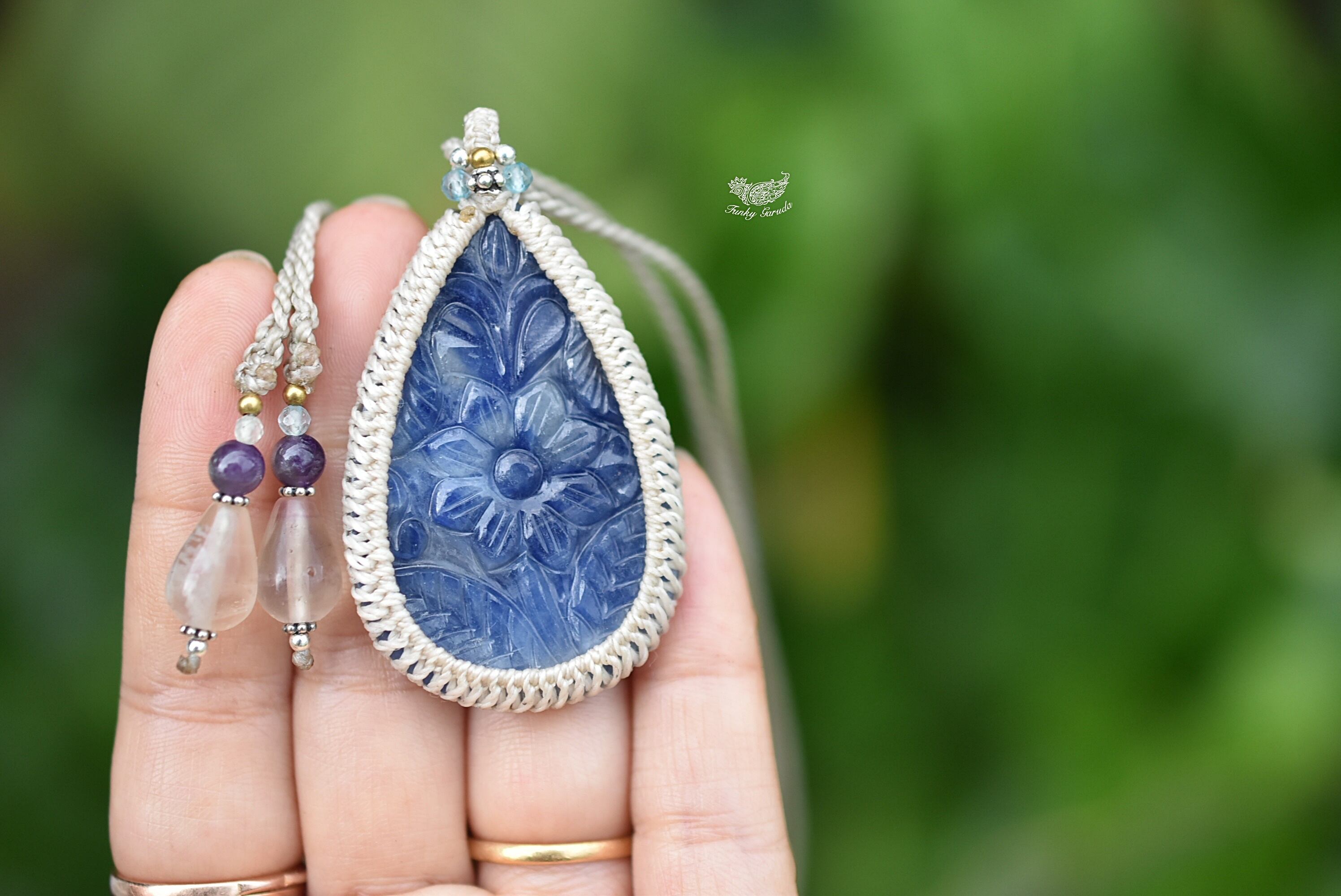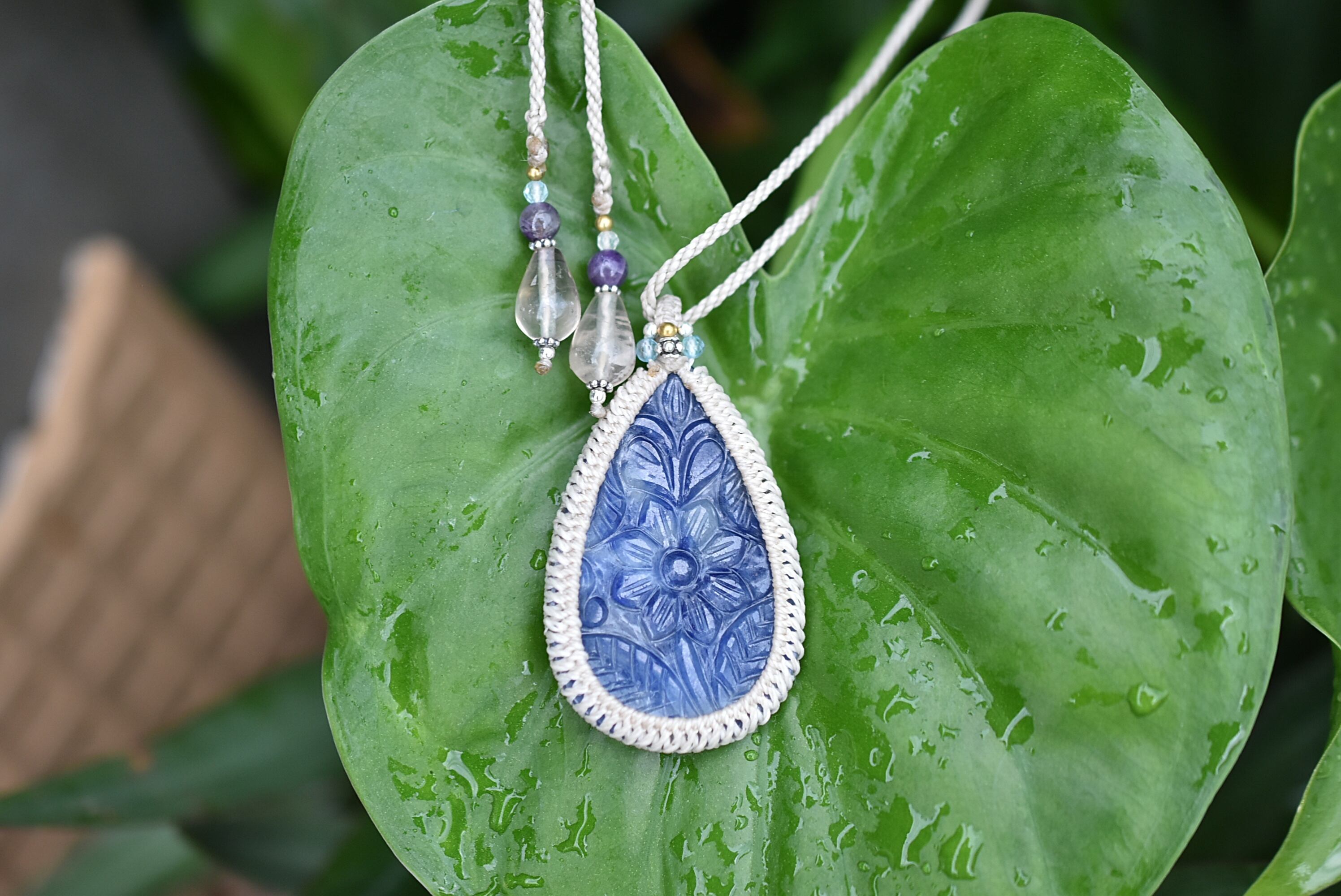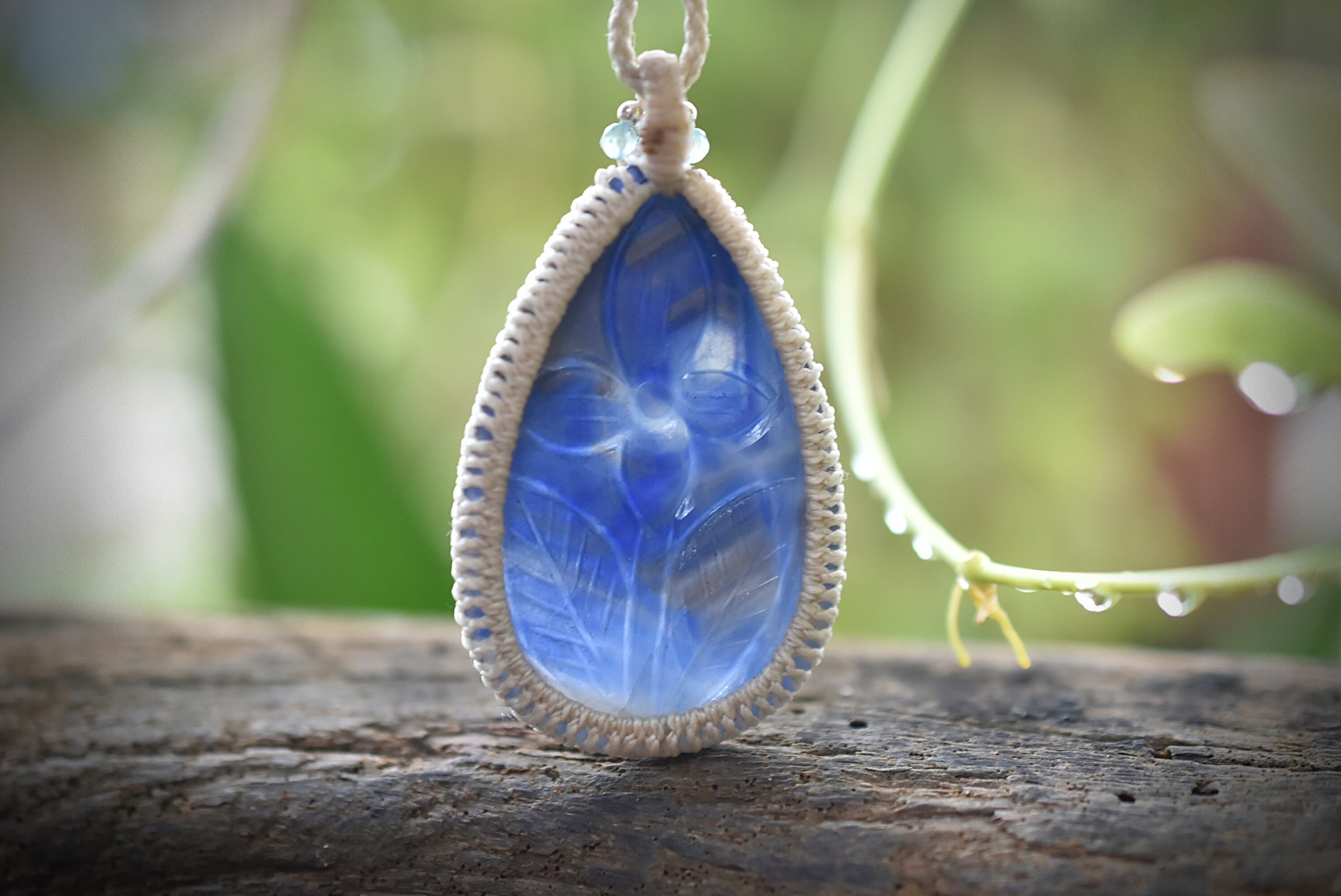 大粒★手仕事花彫刻★blue sapphire マクラメネックレス1107