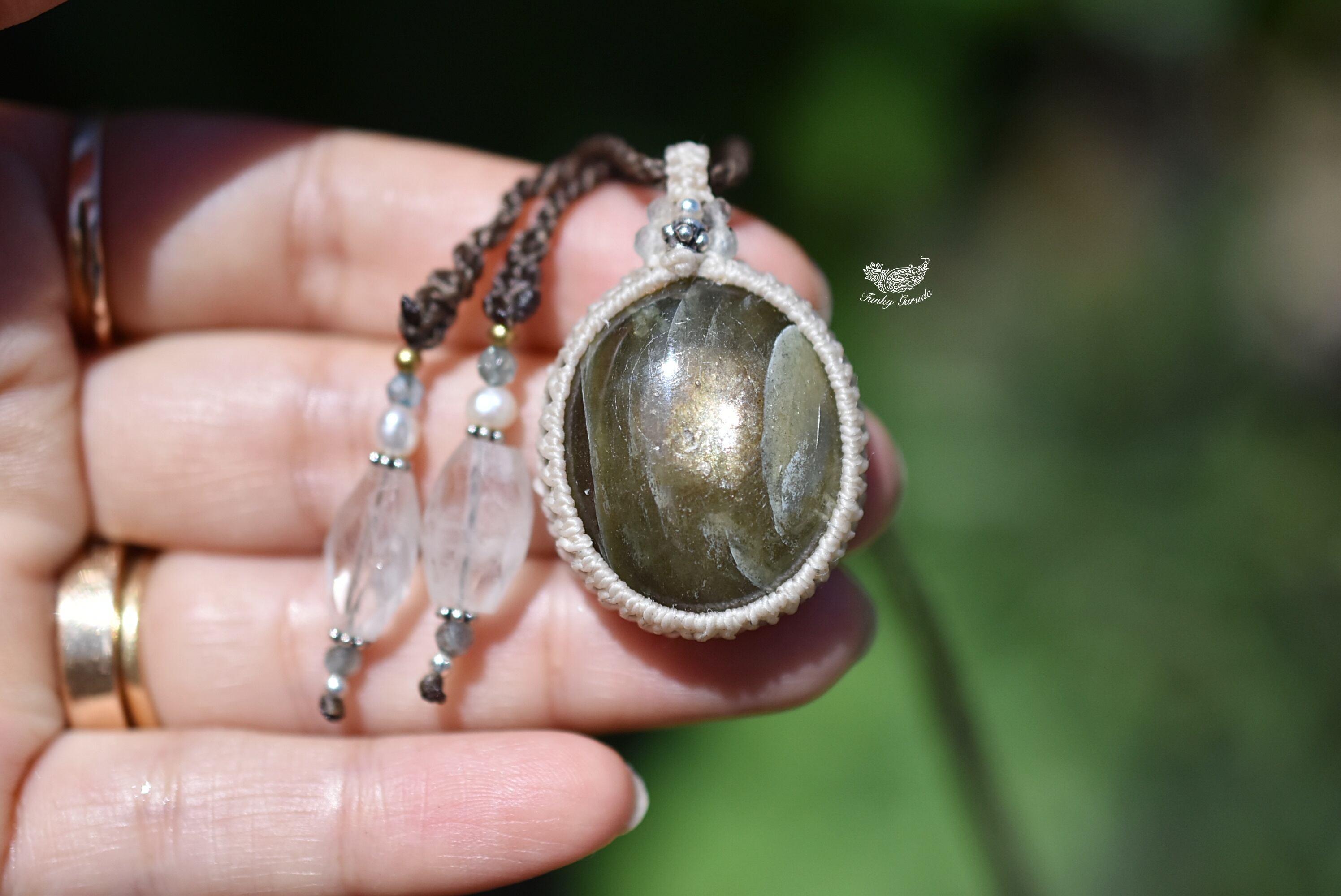 ◆このたびはオリーブ、ナチュラルホワイト色の蝋引き糸を使用しマクラメ編み装飾を施しました。