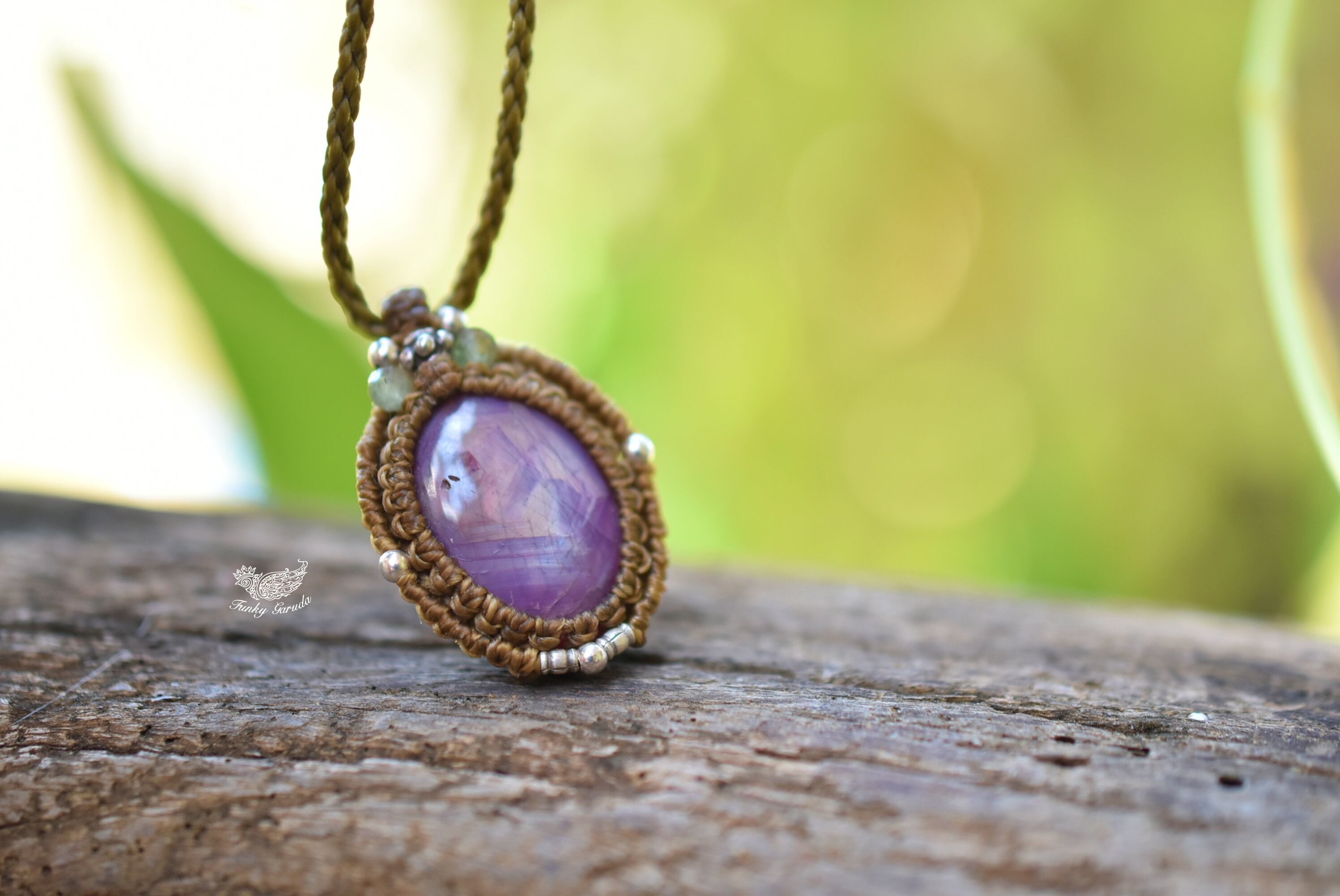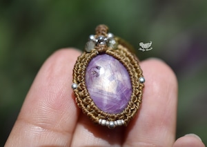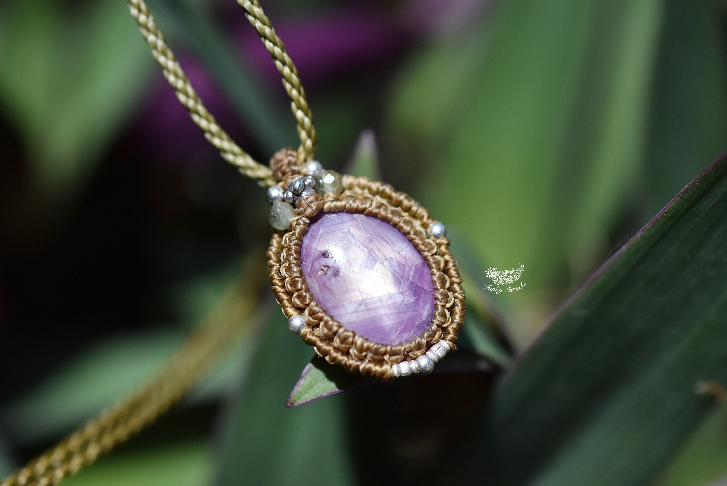 ◆このたびはゴールドブラウン色の蝋引き糸を使用しマクラメ編み装飾を施しました。