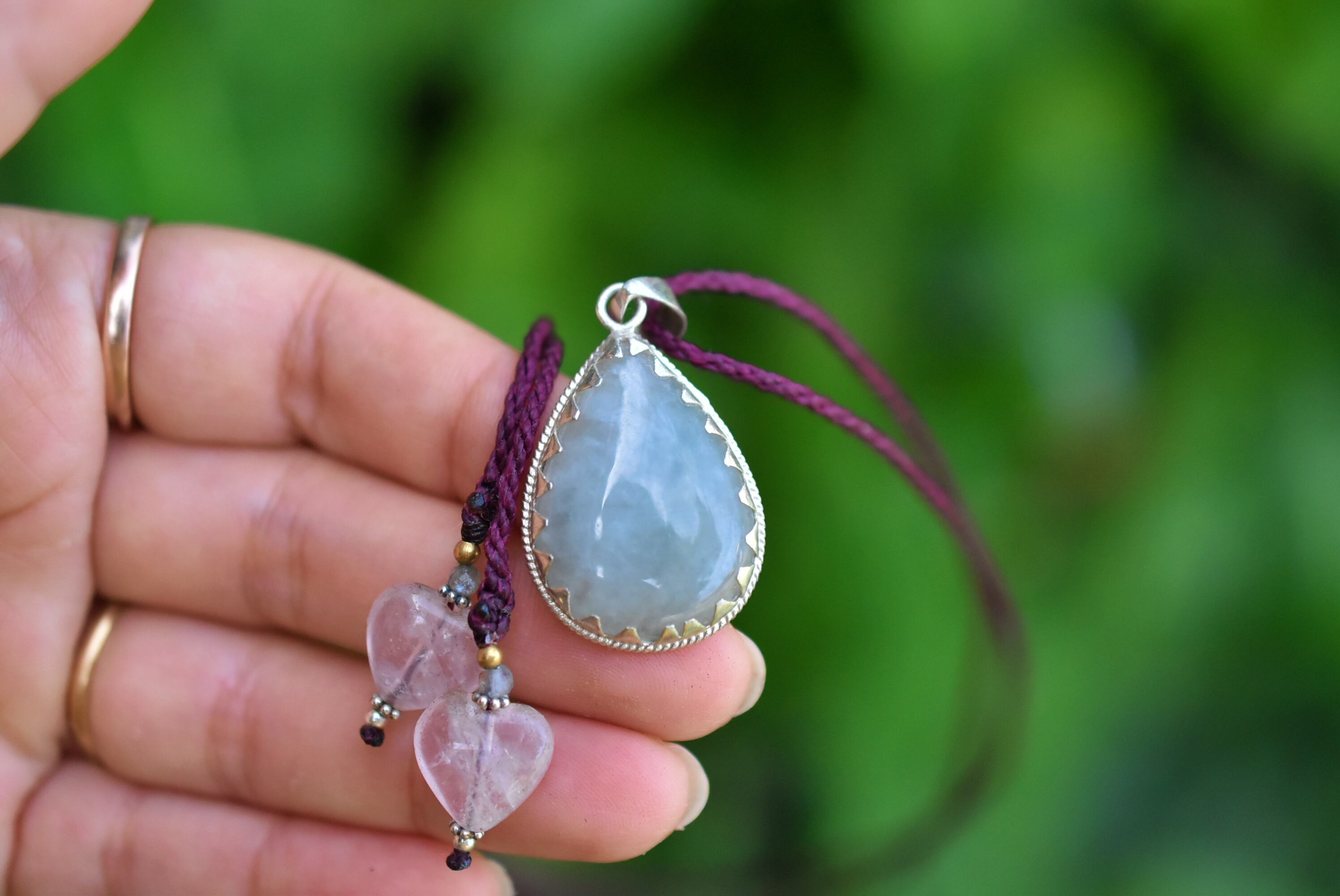 ◆このたびは首紐部分にボルドー色の蝋引き糸を使用しマクラメ編み装飾を施しました。
