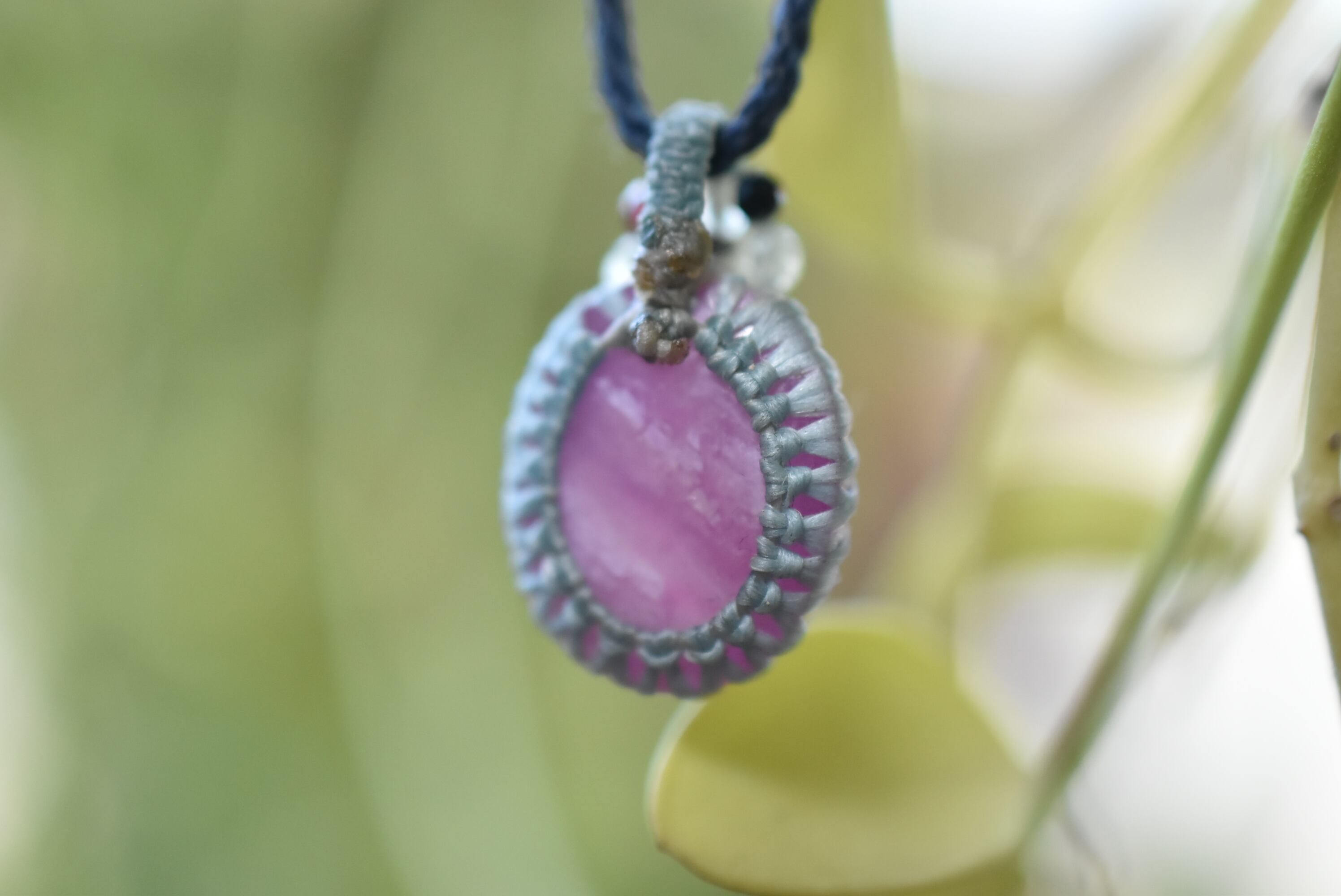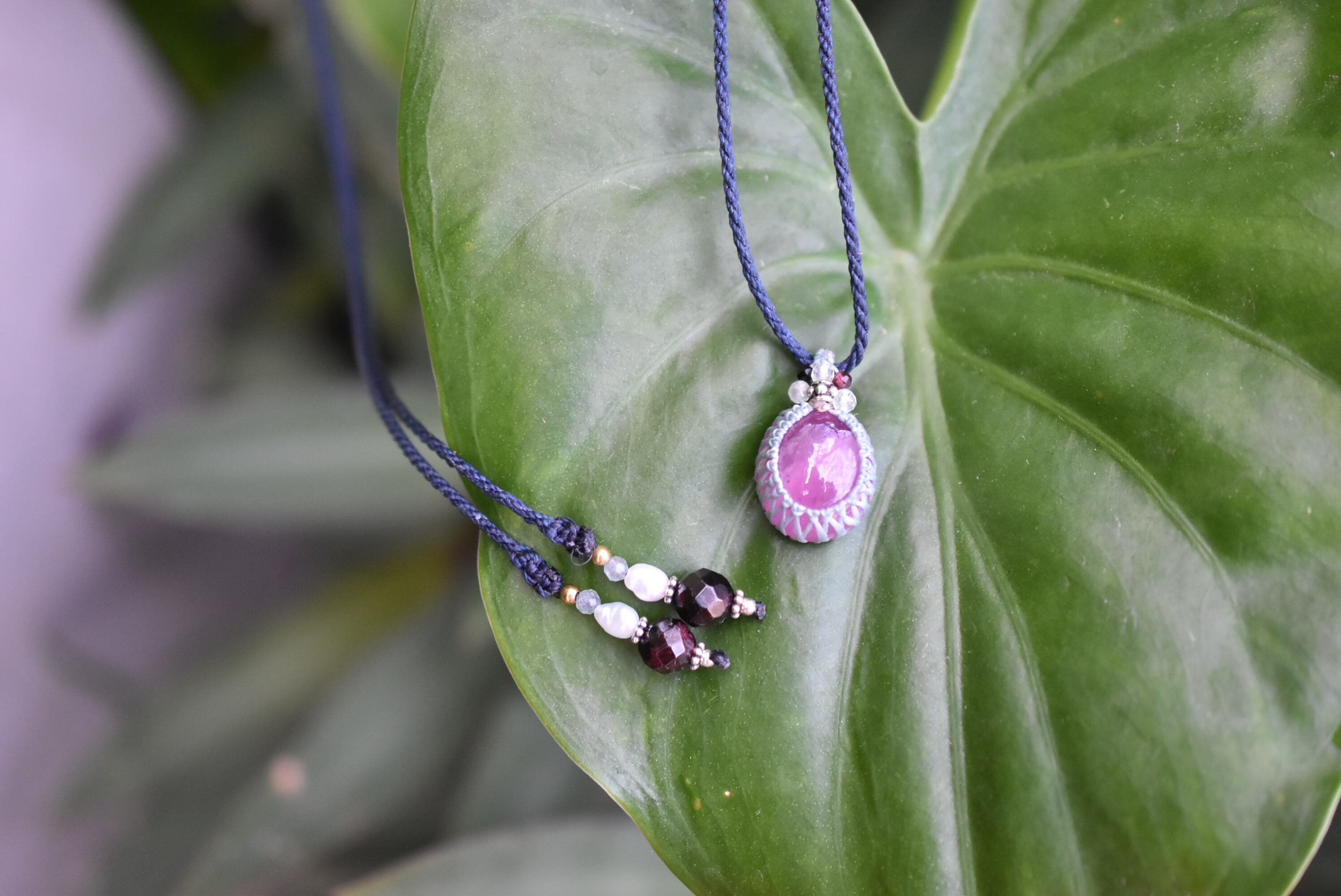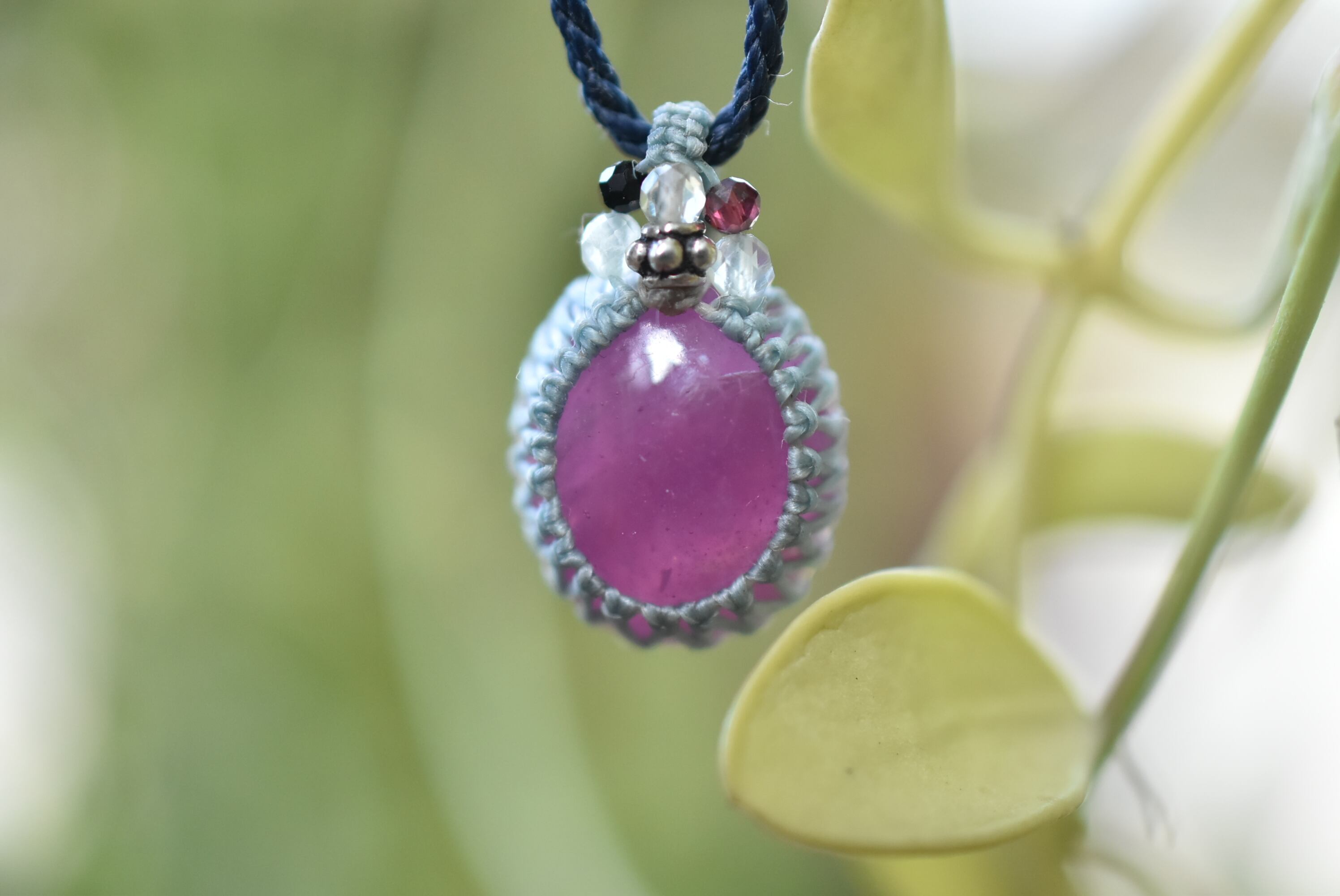◆このたびはミント、インディゴ色の蝋引き糸を使用しマクラメ編み装飾を施しました。