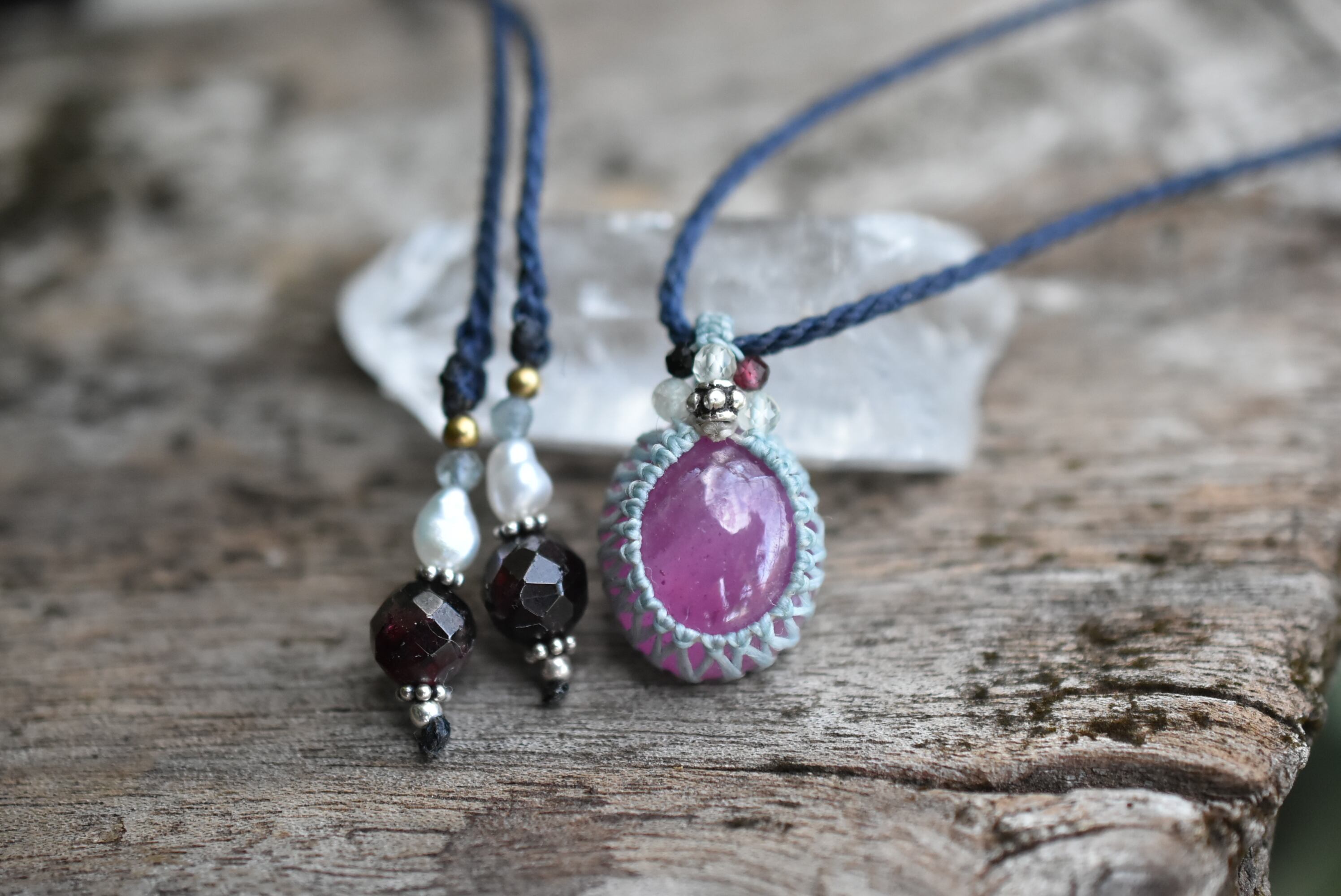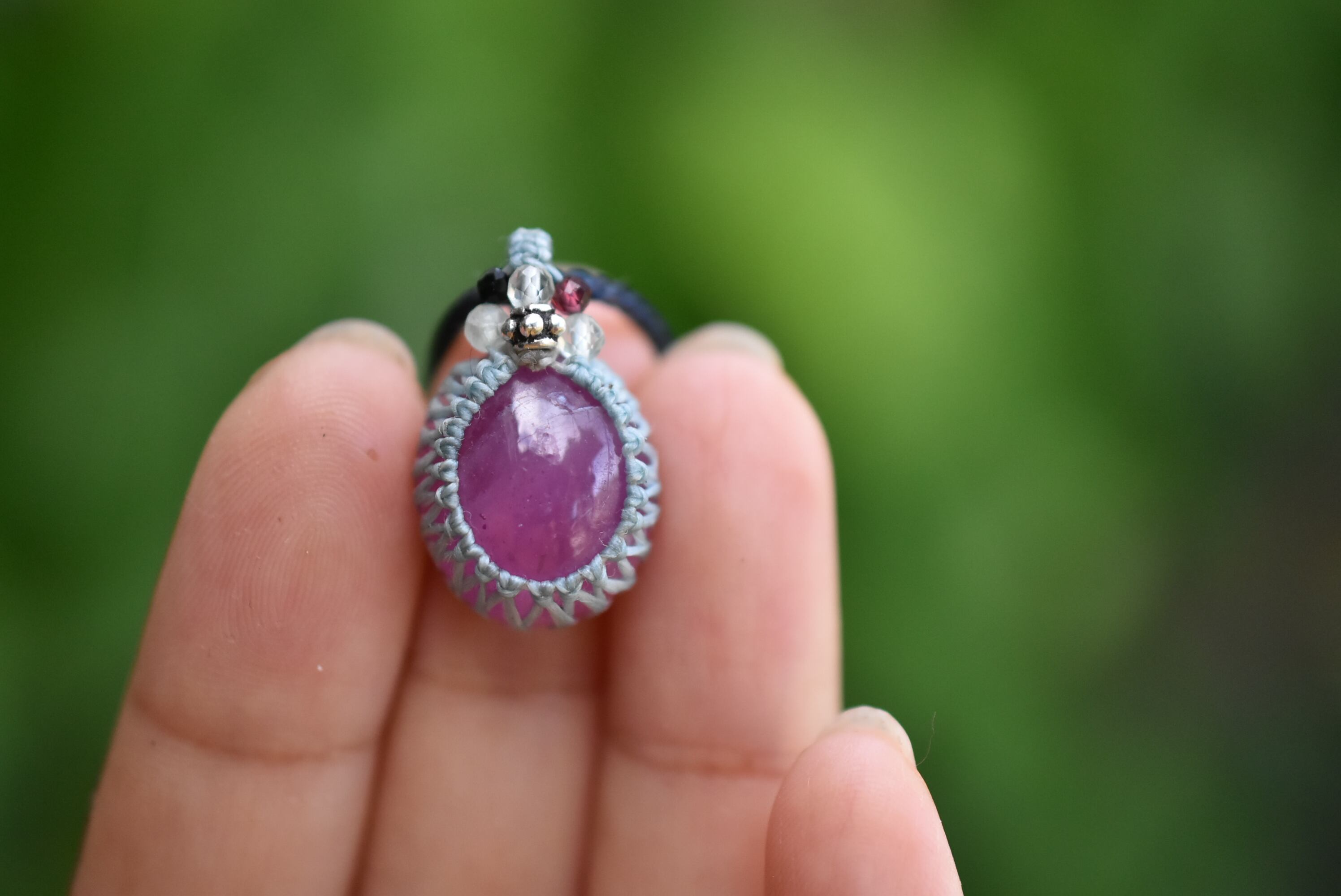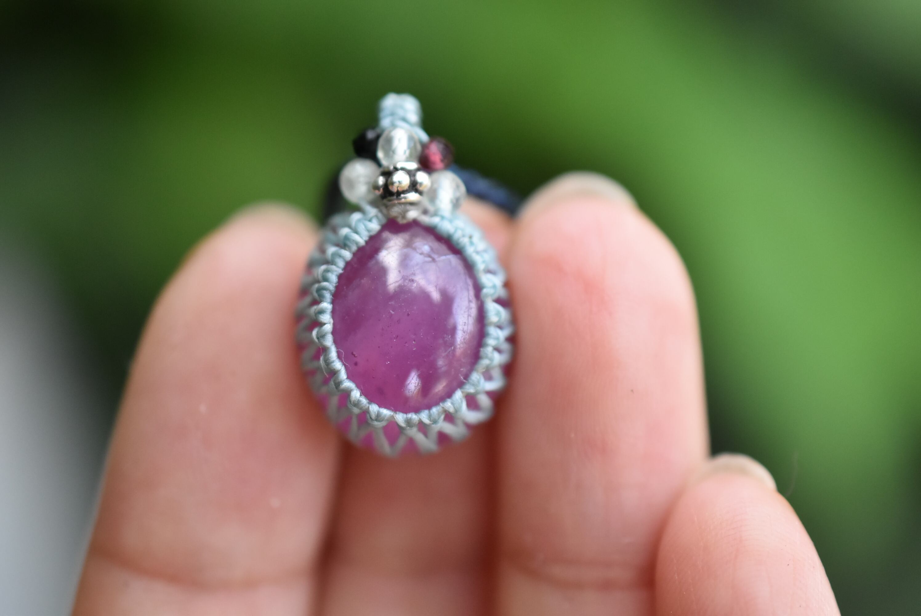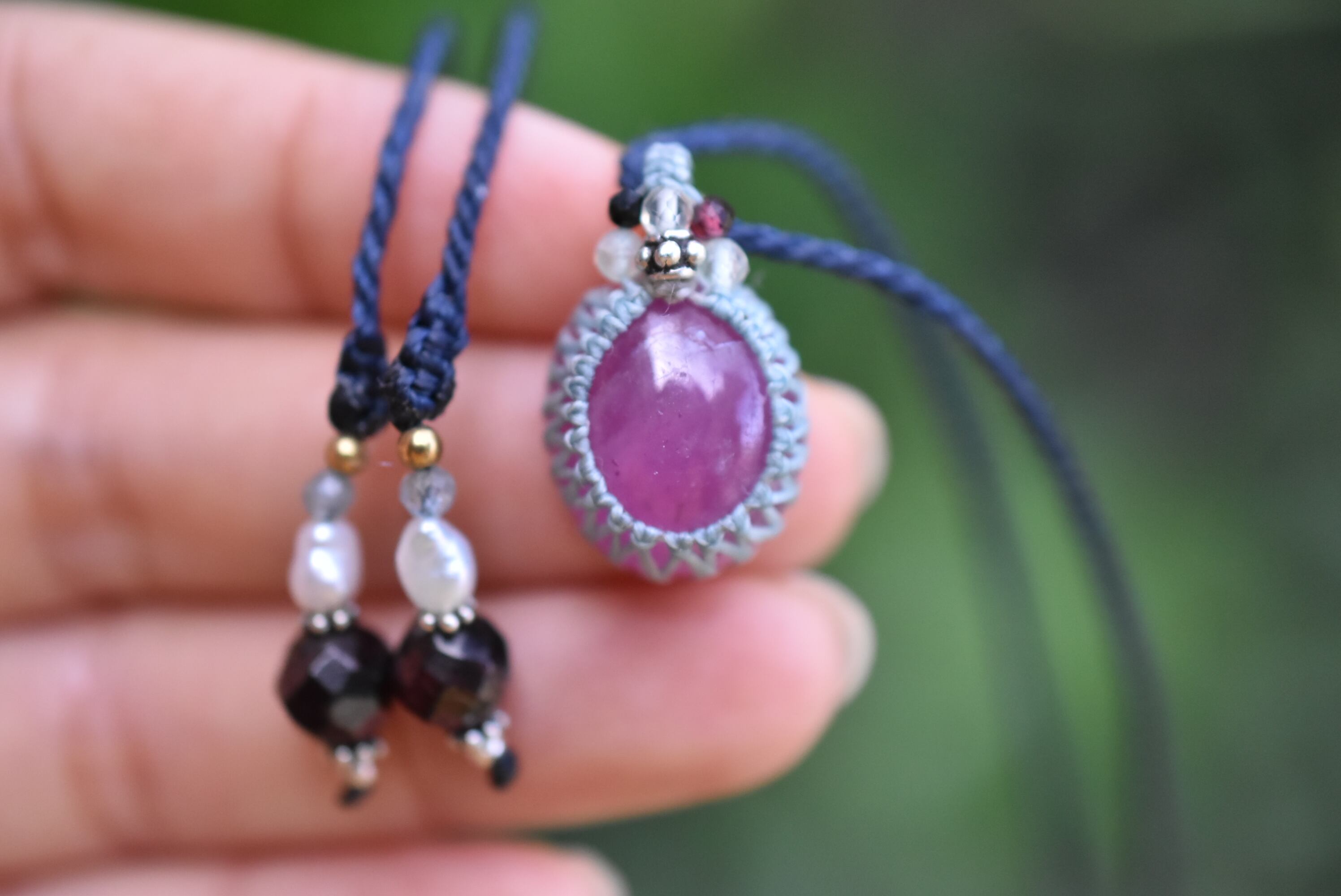 ◆このたびはミント、インディゴ色の蝋引き糸を使用しマクラメ編み装飾を施しました。