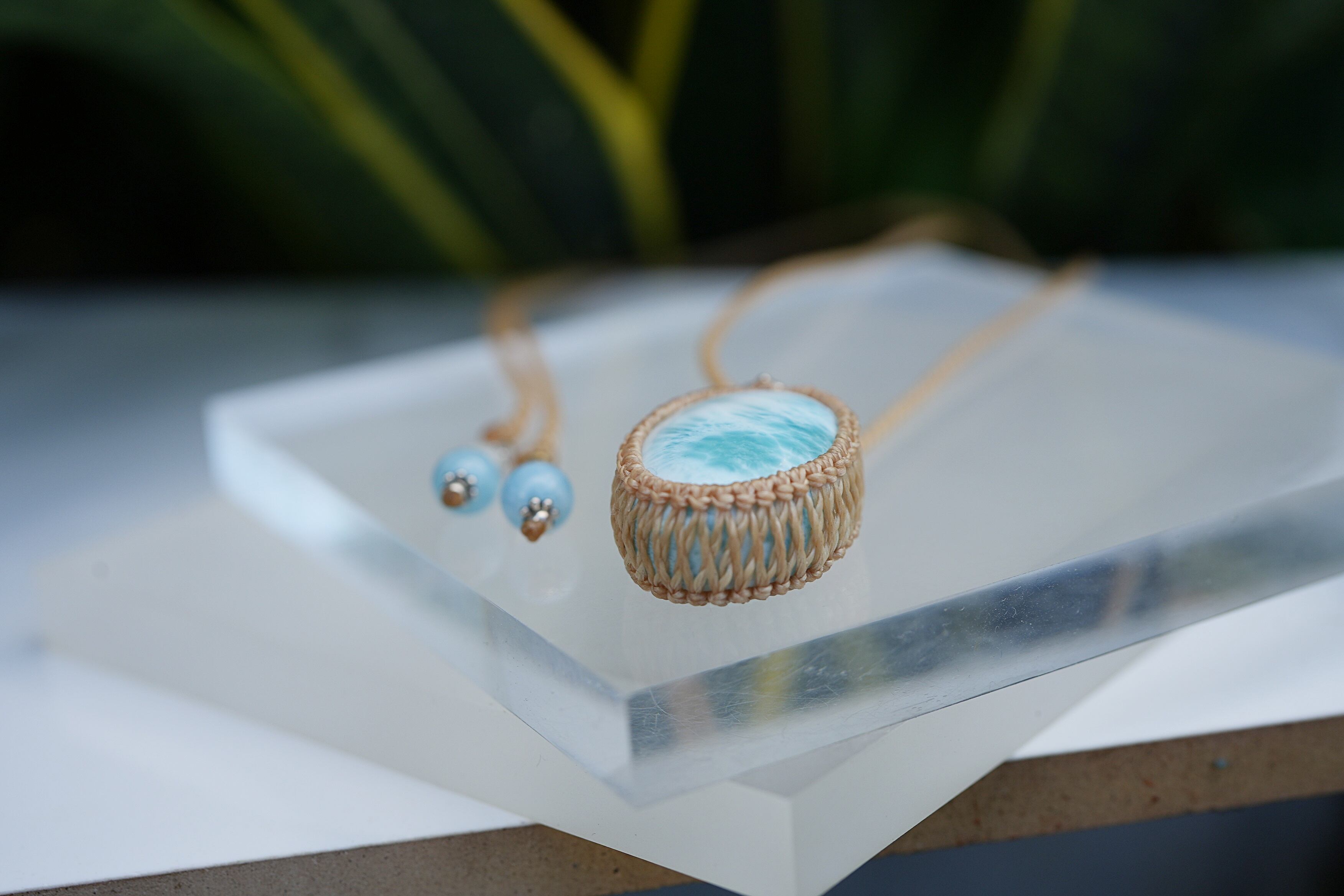 ◆このたびはキャラメル色の蝋引き糸を使用しマクラメ編み装飾を施しました。