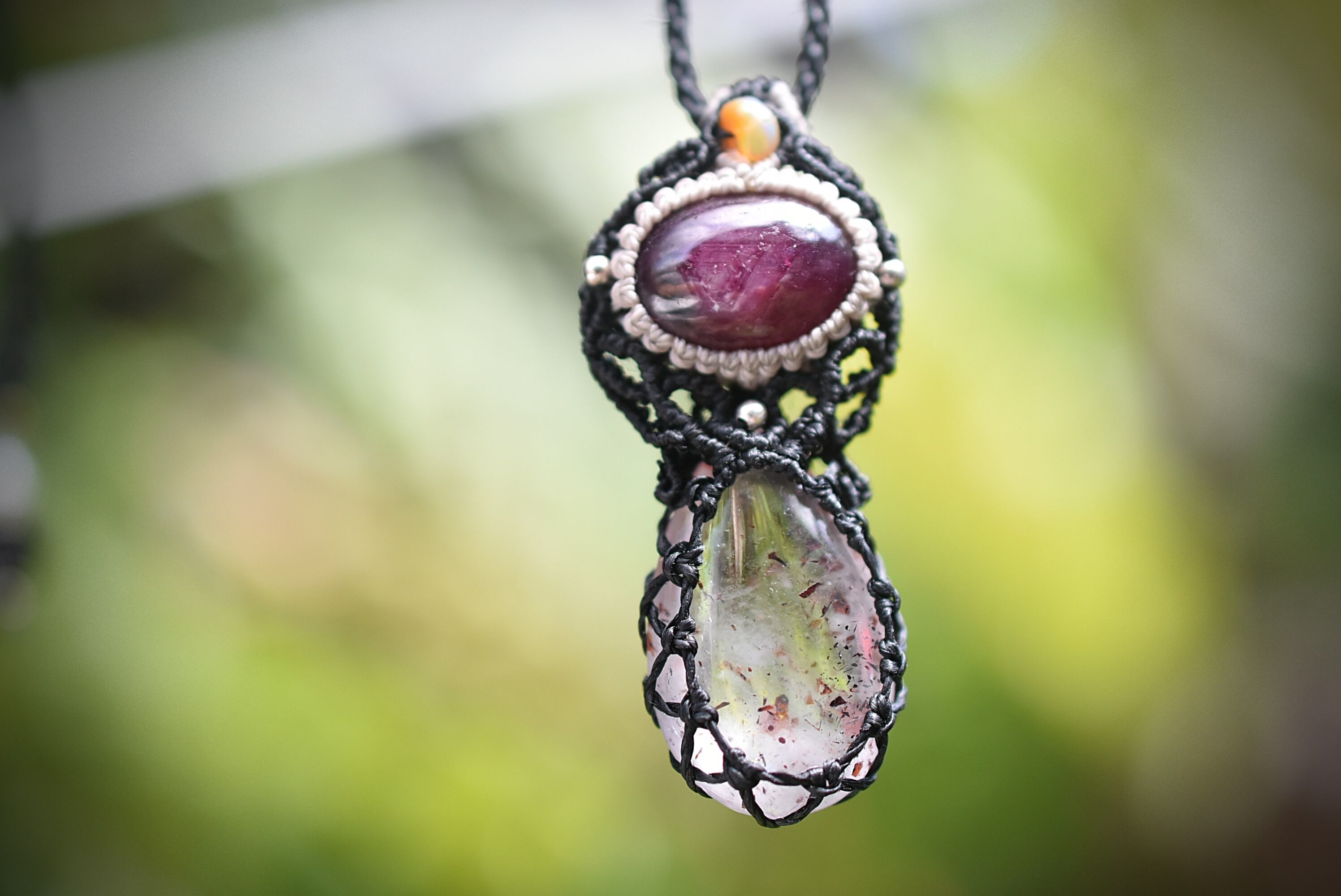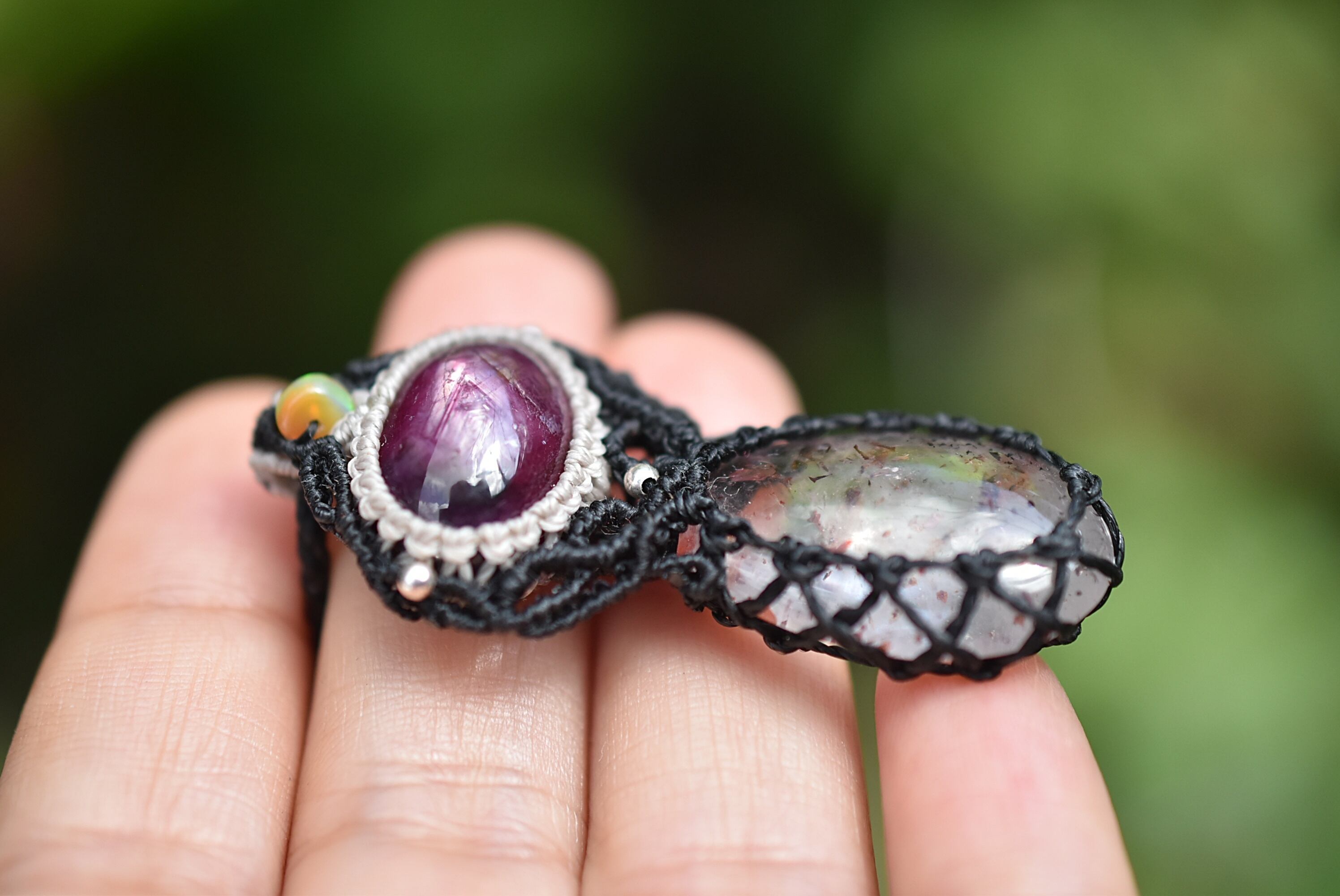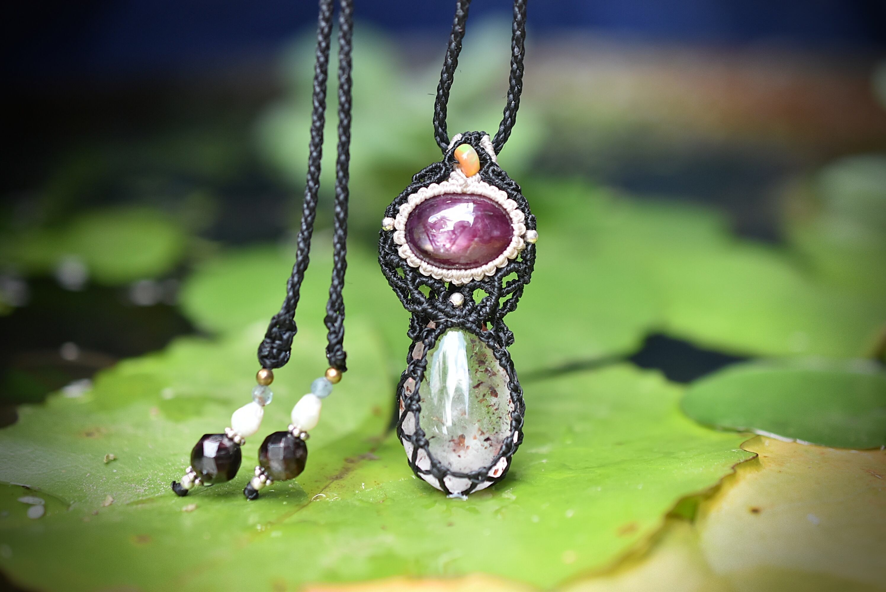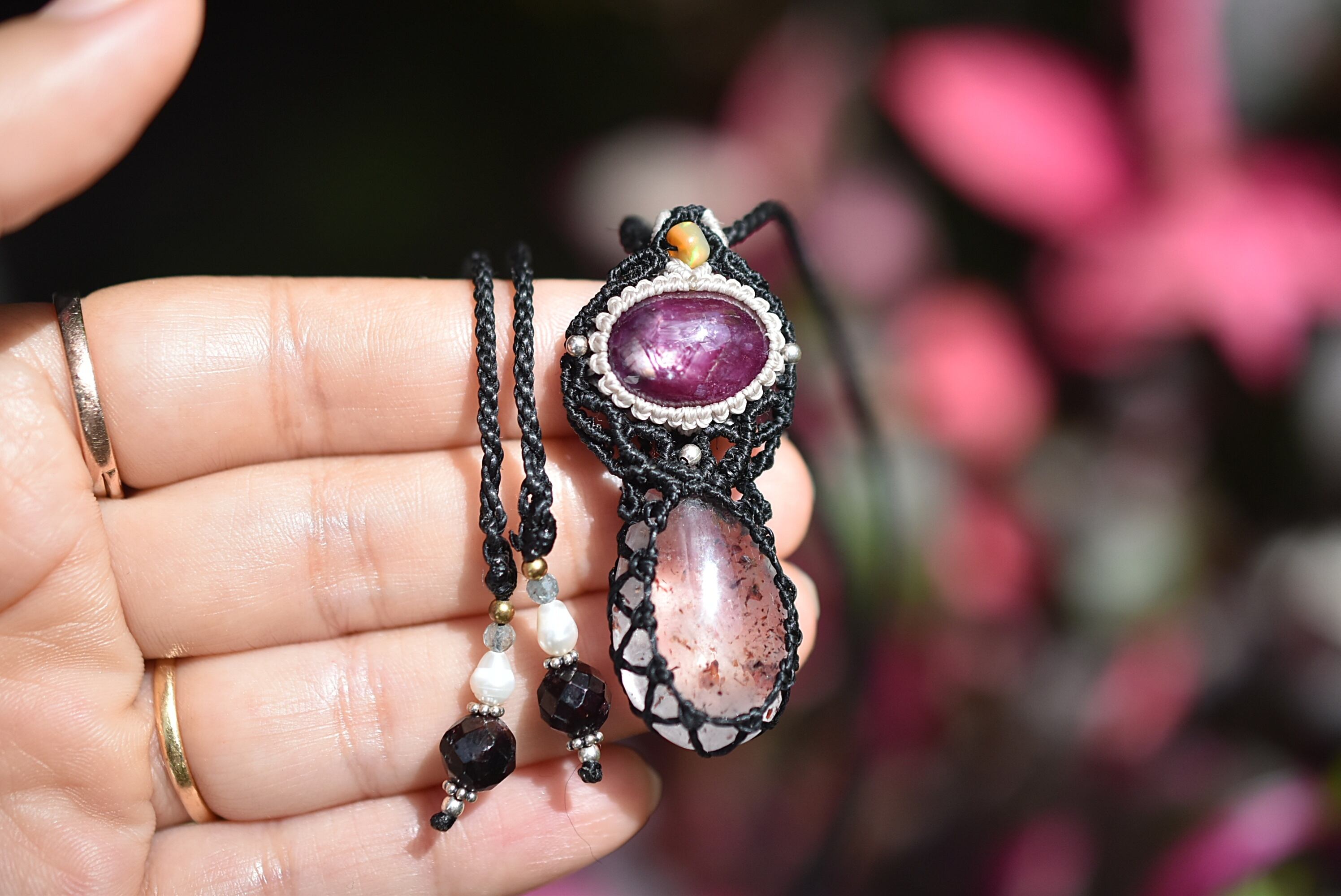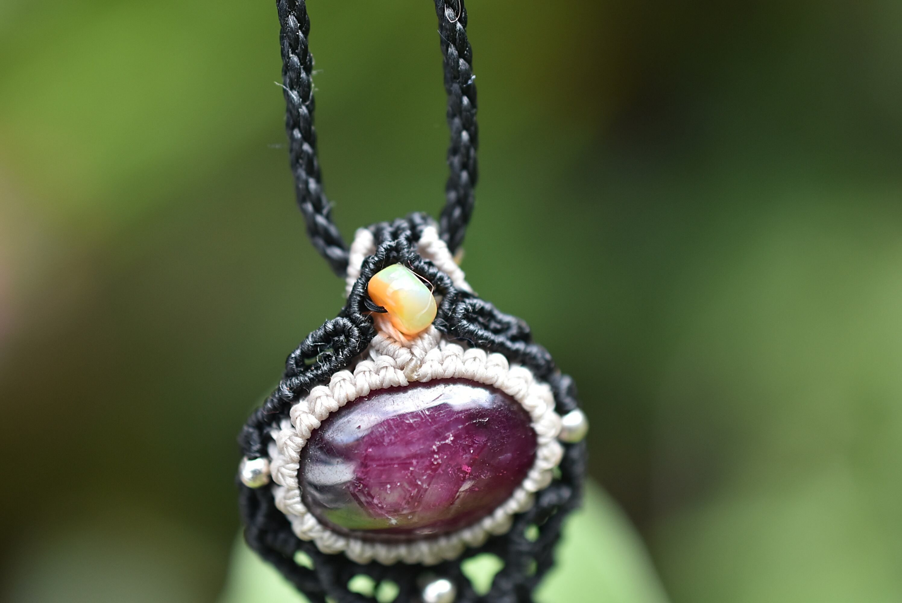 ◆このたびはブラック色の蝋引き糸を使用しマクラメ編み装飾を施しました。