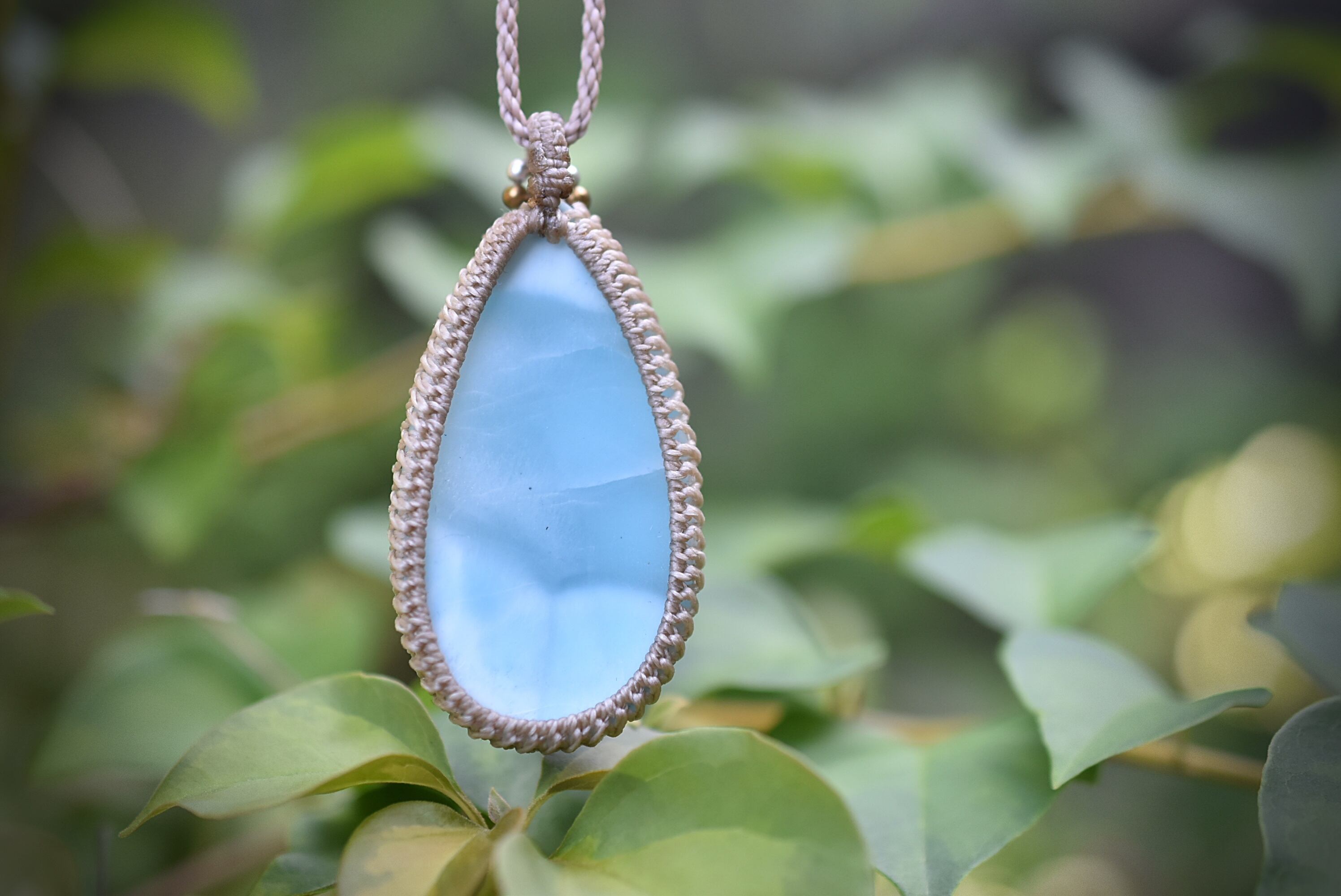 ◆このたびはゴールドブラウン色の蝋引き糸を使用しマクラメ編み装飾を施しました。