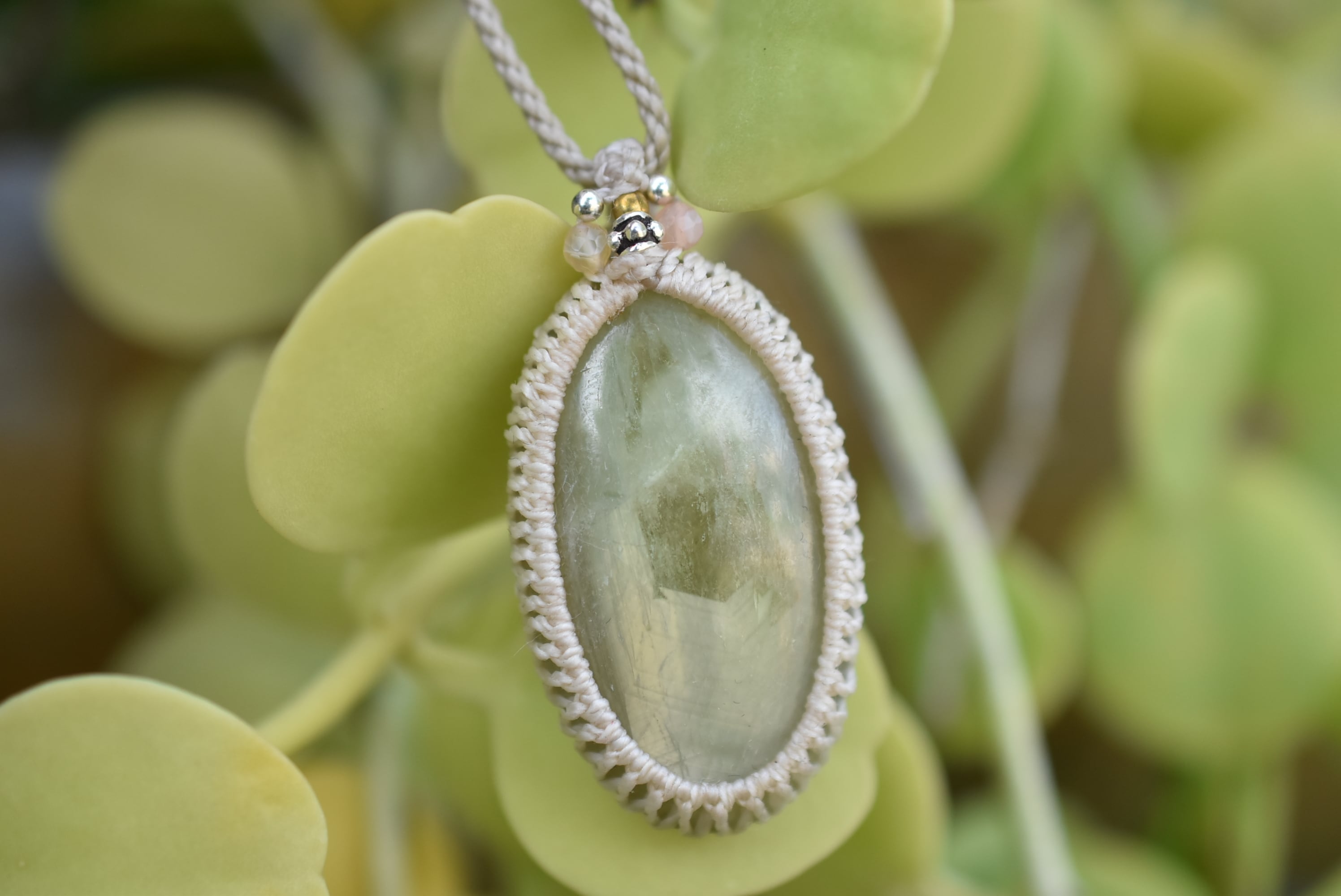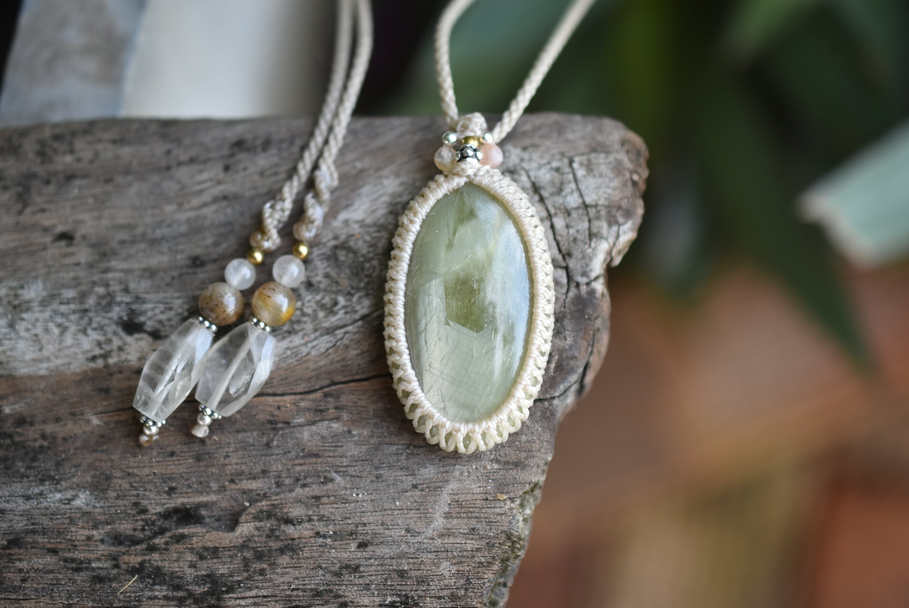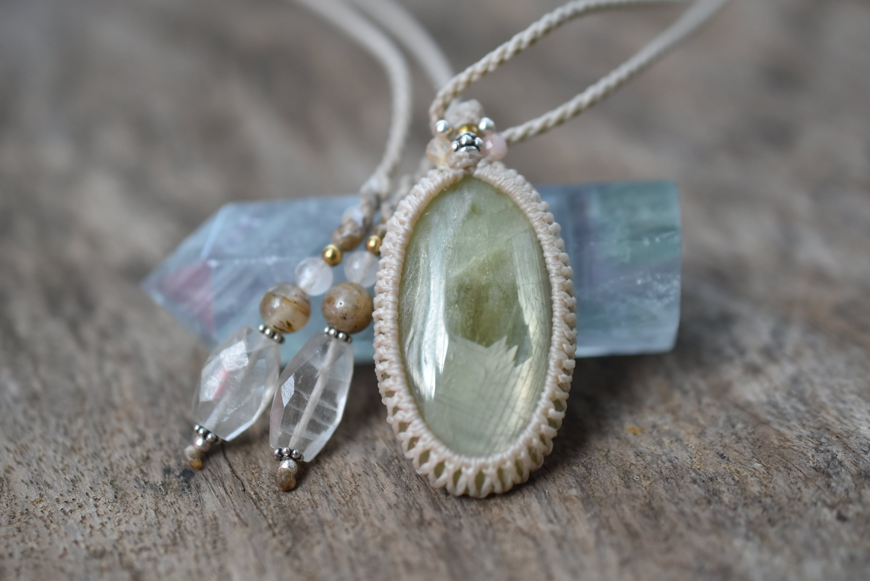 ◆このたびはナチュラルホワイト、キナリ色の蝋引き糸を使用しマクラメ編み装飾を施しました。