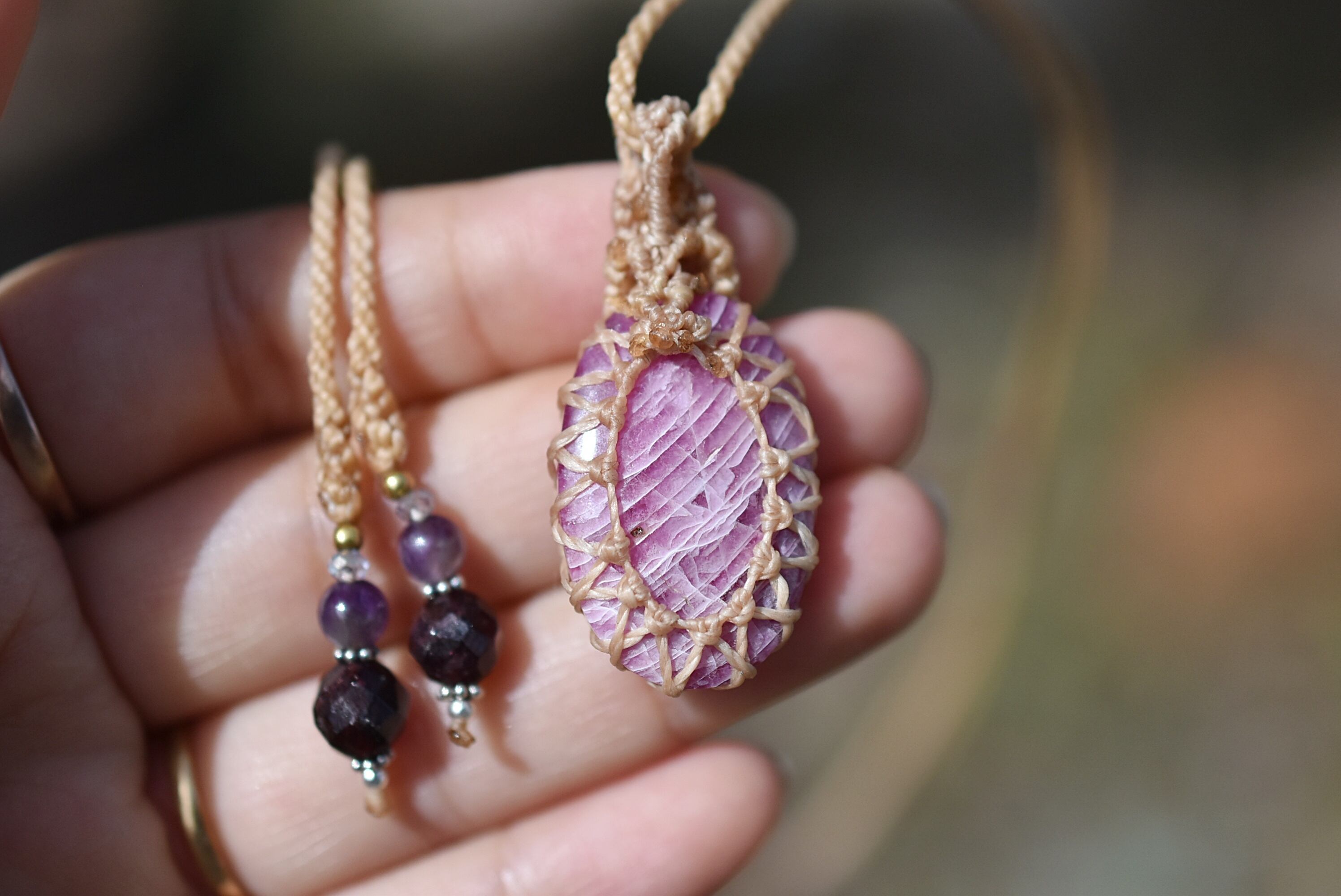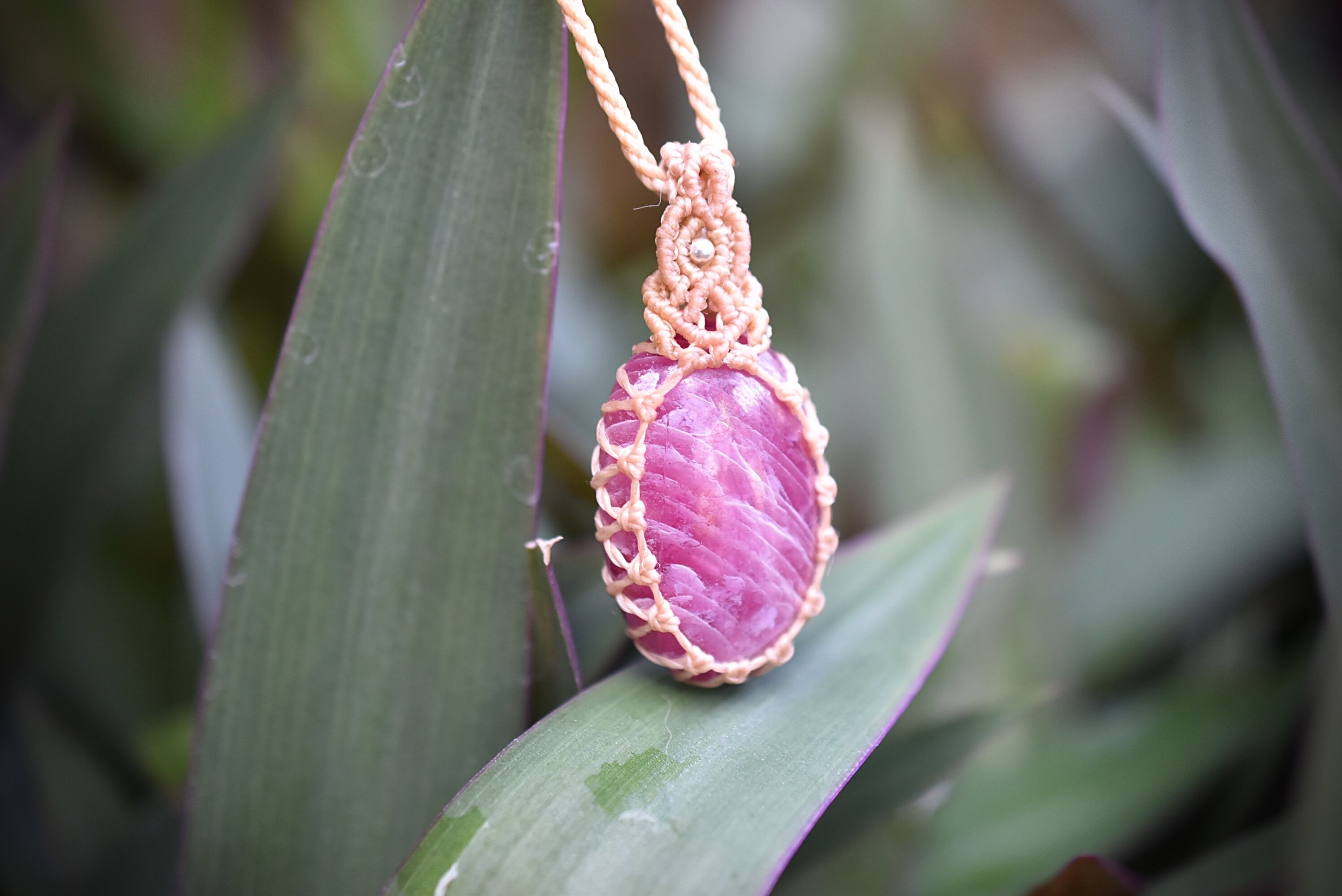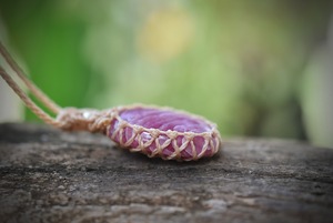 ◆このたびはキャラメル色の蝋引き糸を使用しマクラメ編み装飾を施しました。