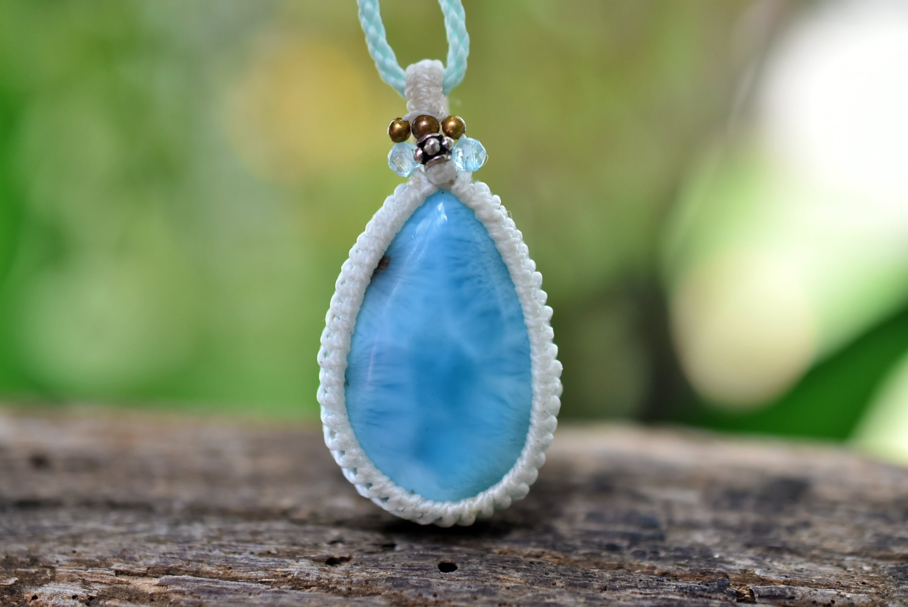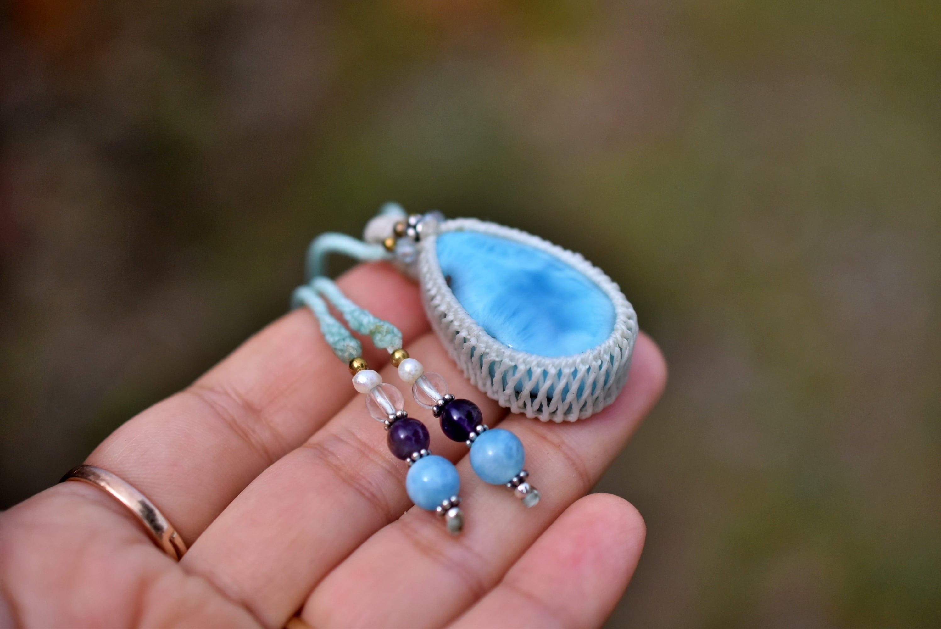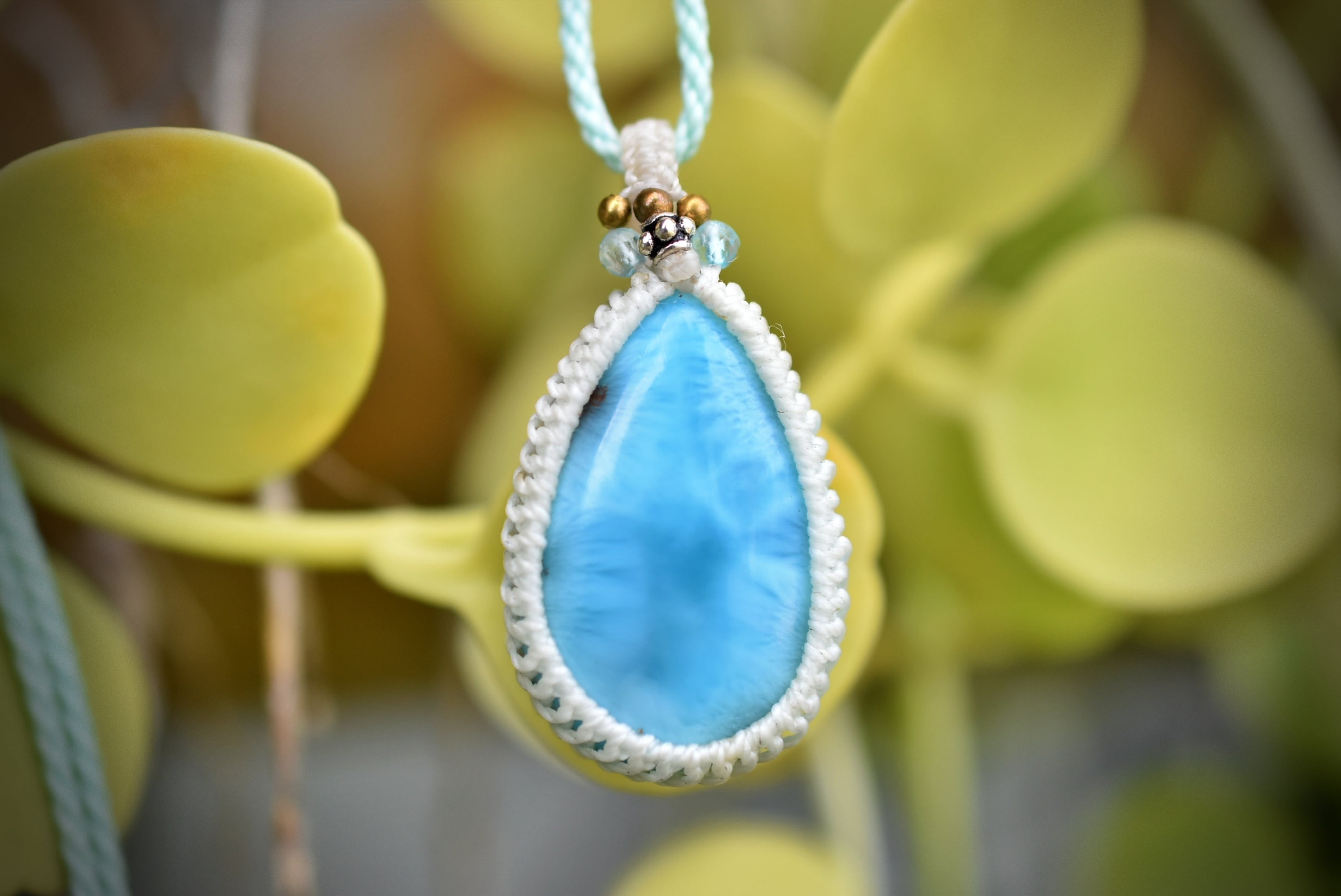 ◆このたびはミント・ナチュラルホワイト色の蝋引き糸を使用しマクラメ編み装飾を施しました。