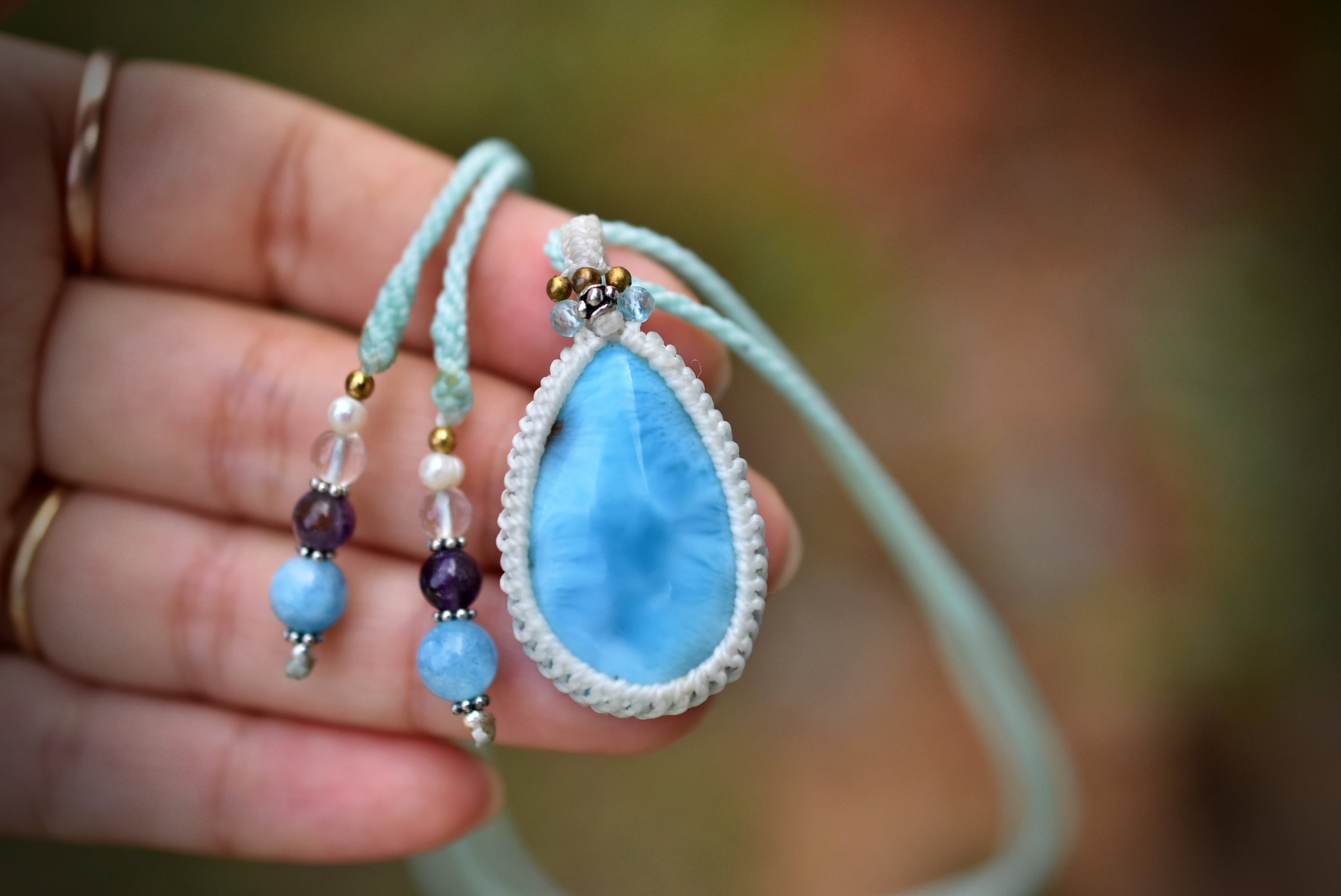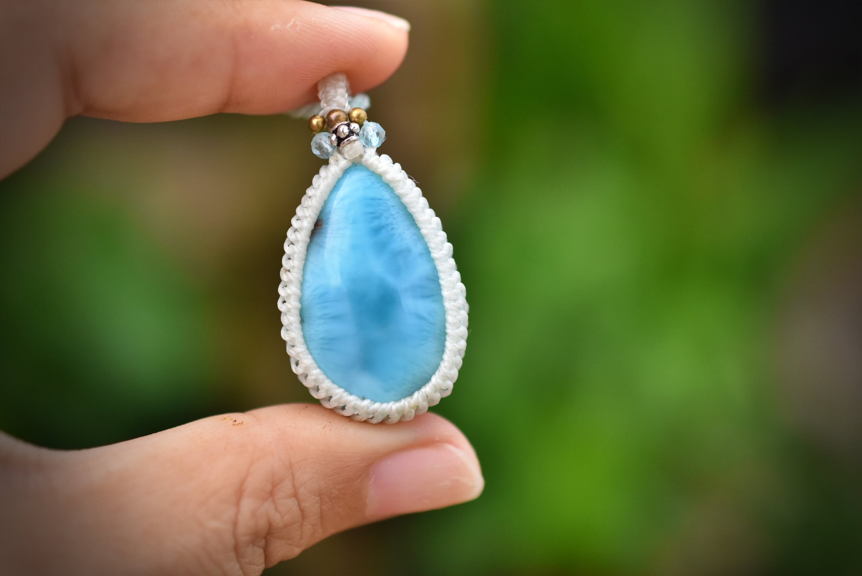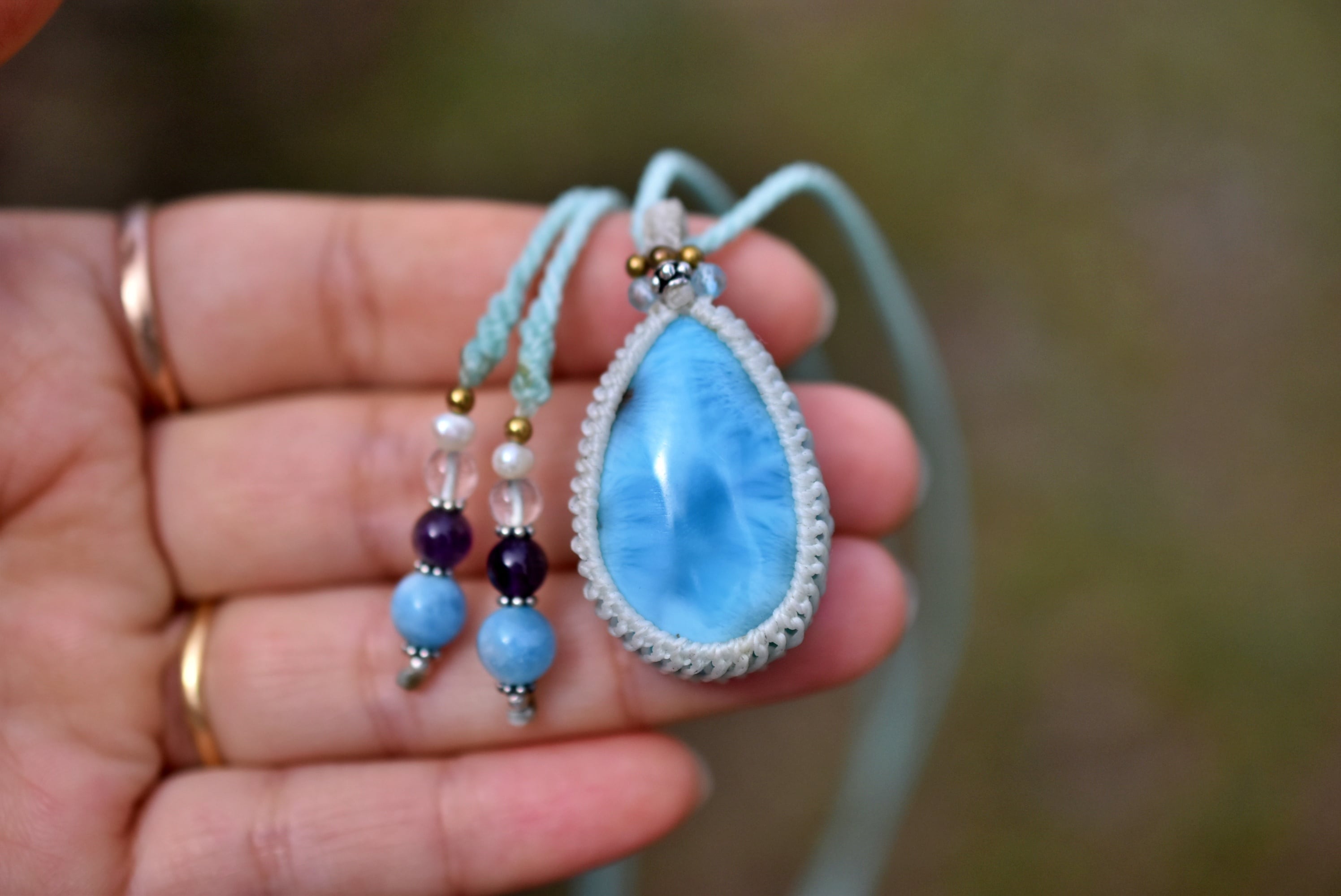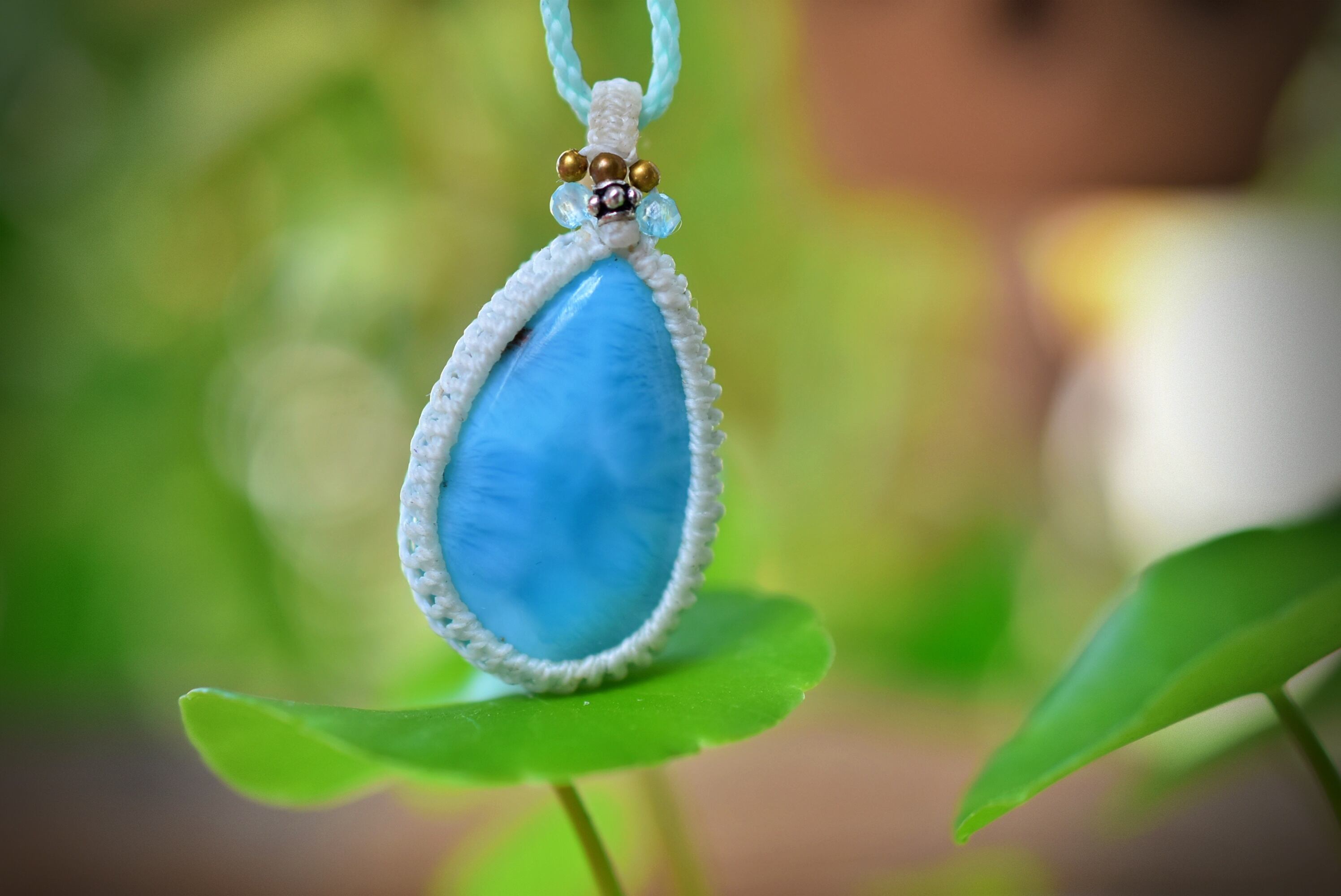 ◆このたびはミント・ナチュラルホワイト色の蝋引き糸を使用しマクラメ編み装飾を施しました。