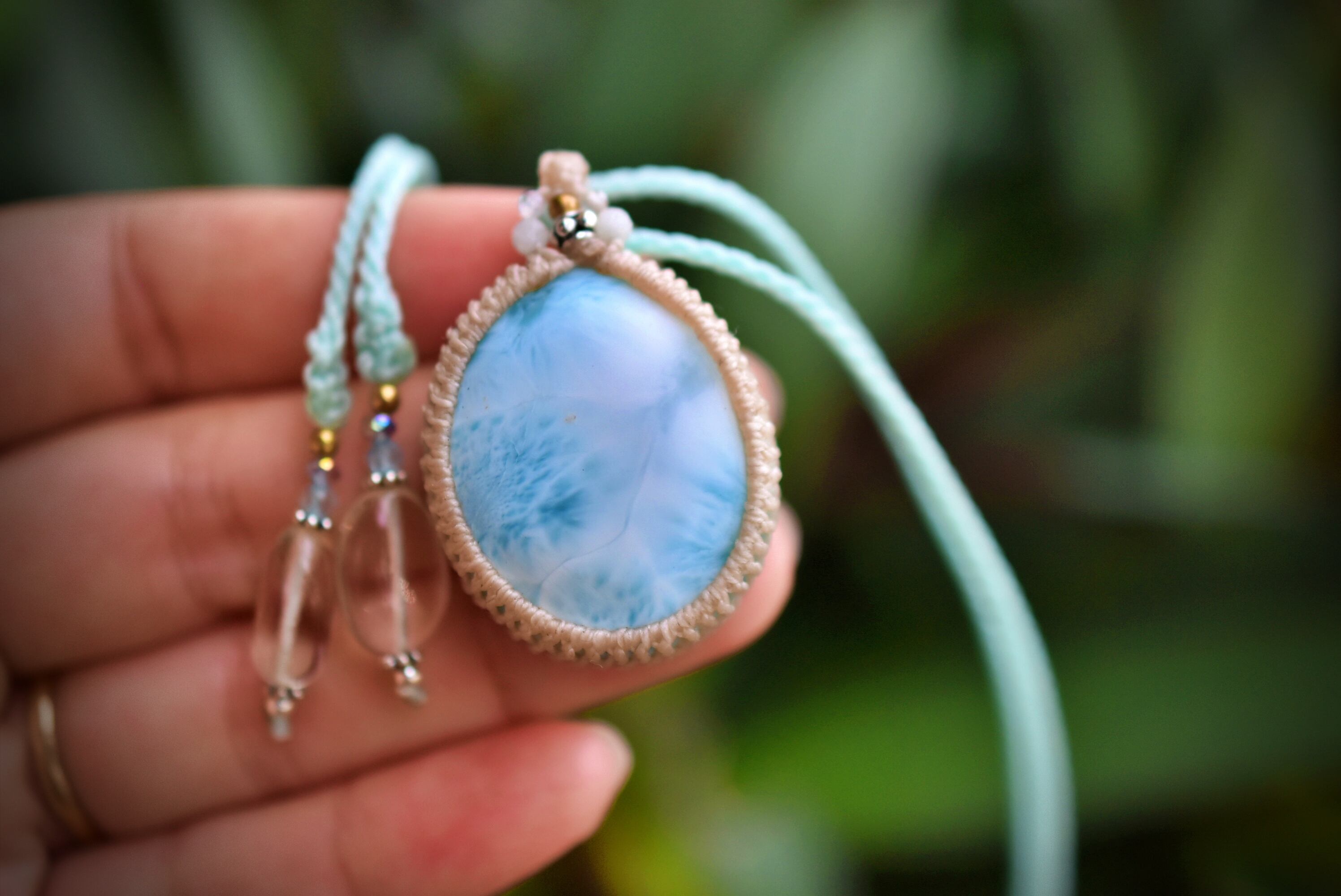 ◆このたびはミント・ナチュラルホワイト色の蝋引き糸を使用しマクラメ編み装飾を施しました。
