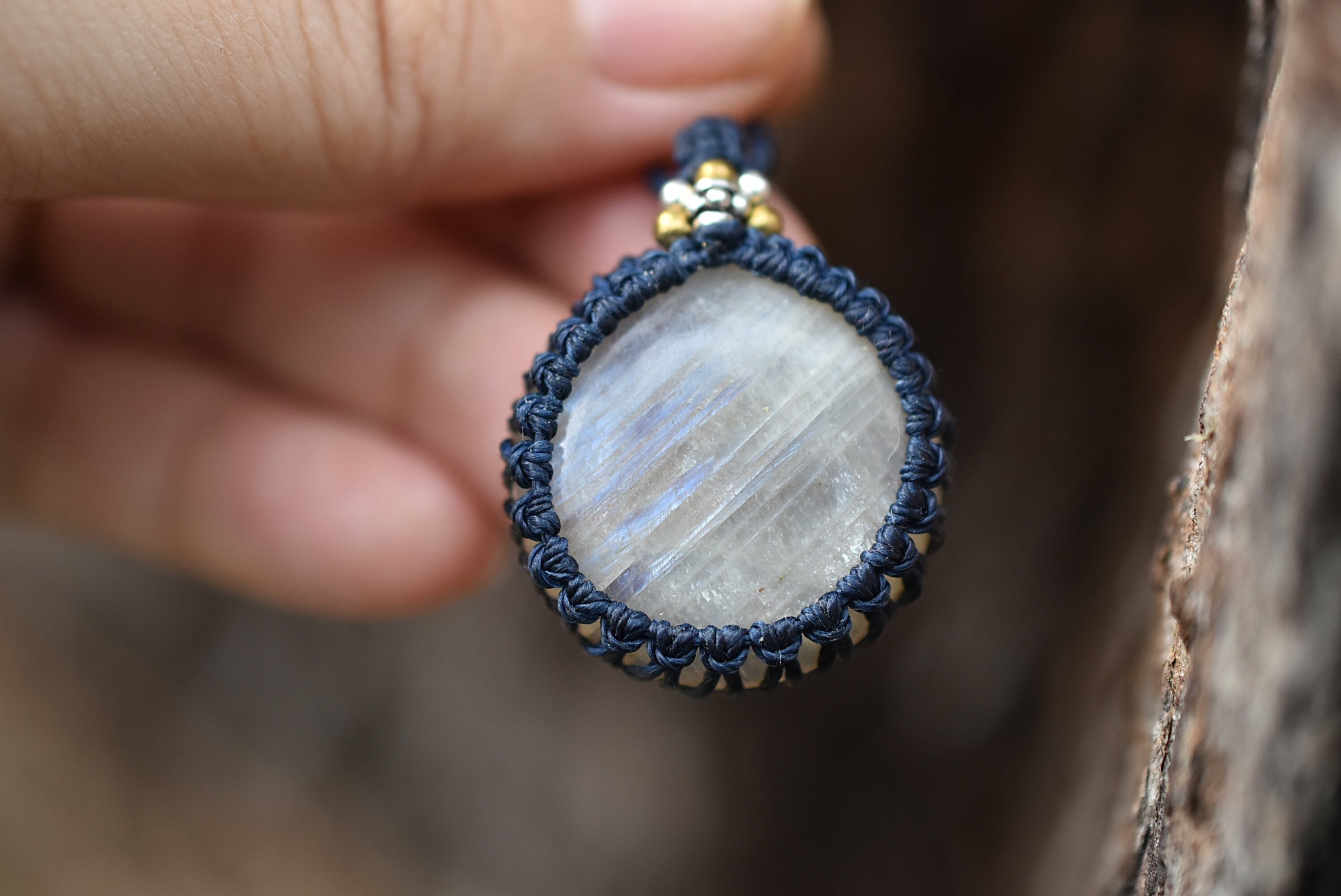 ◆このたびはインディゴ色の蝋引き糸を使用しマクラメ編み装飾を施しました。