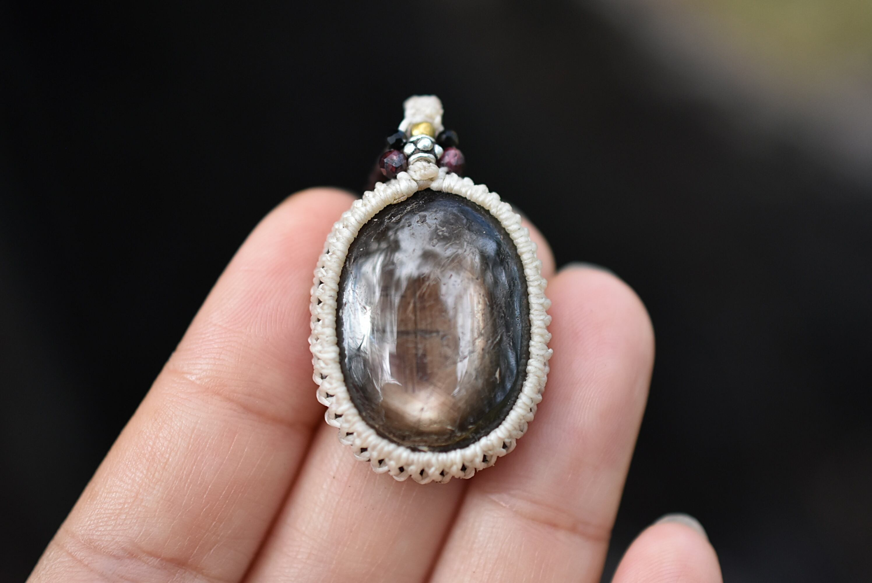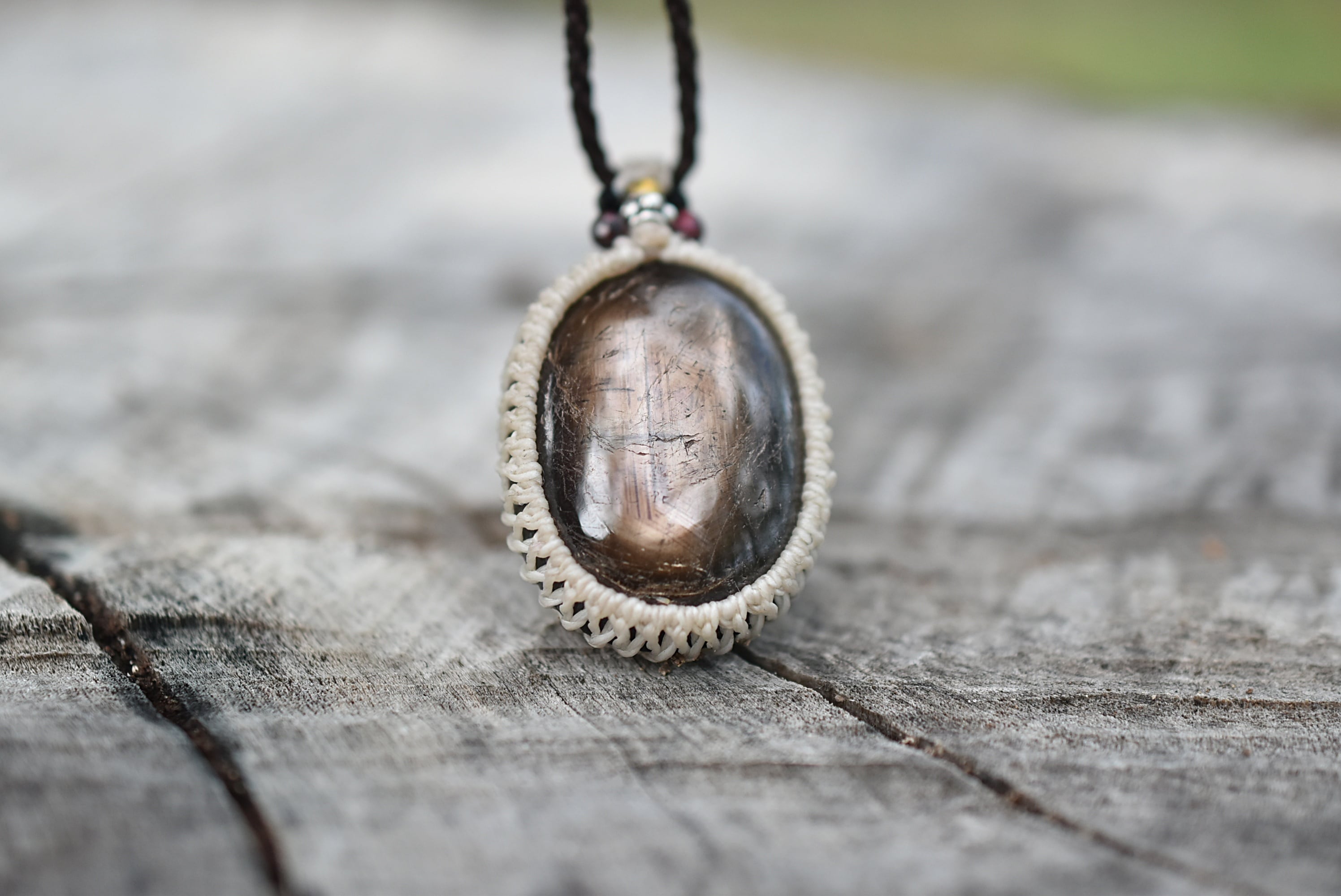 ◆このたびはナチュラルホワイト、ブラウン色の蝋引き糸を使用しマクラメ編み装飾を施しました。