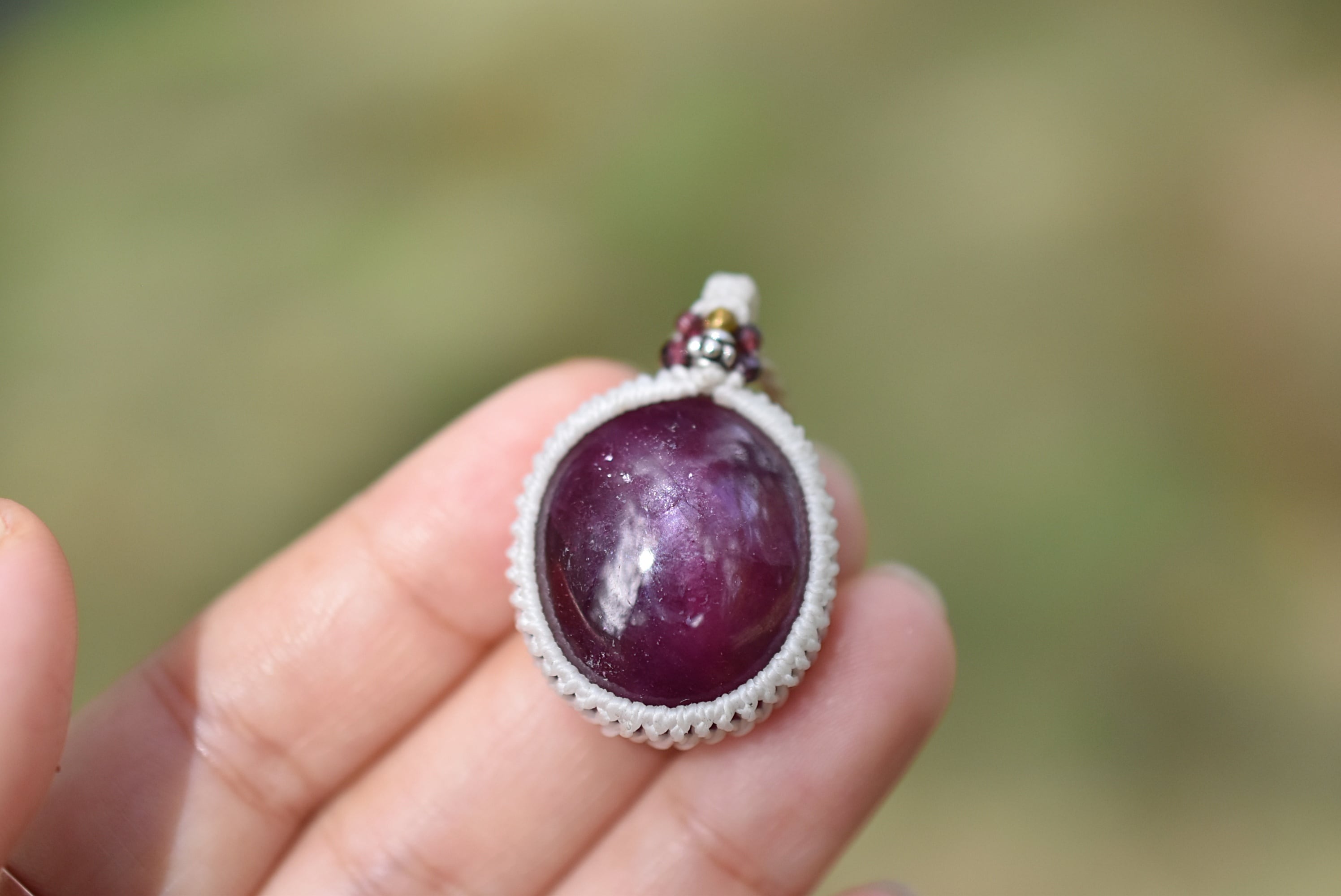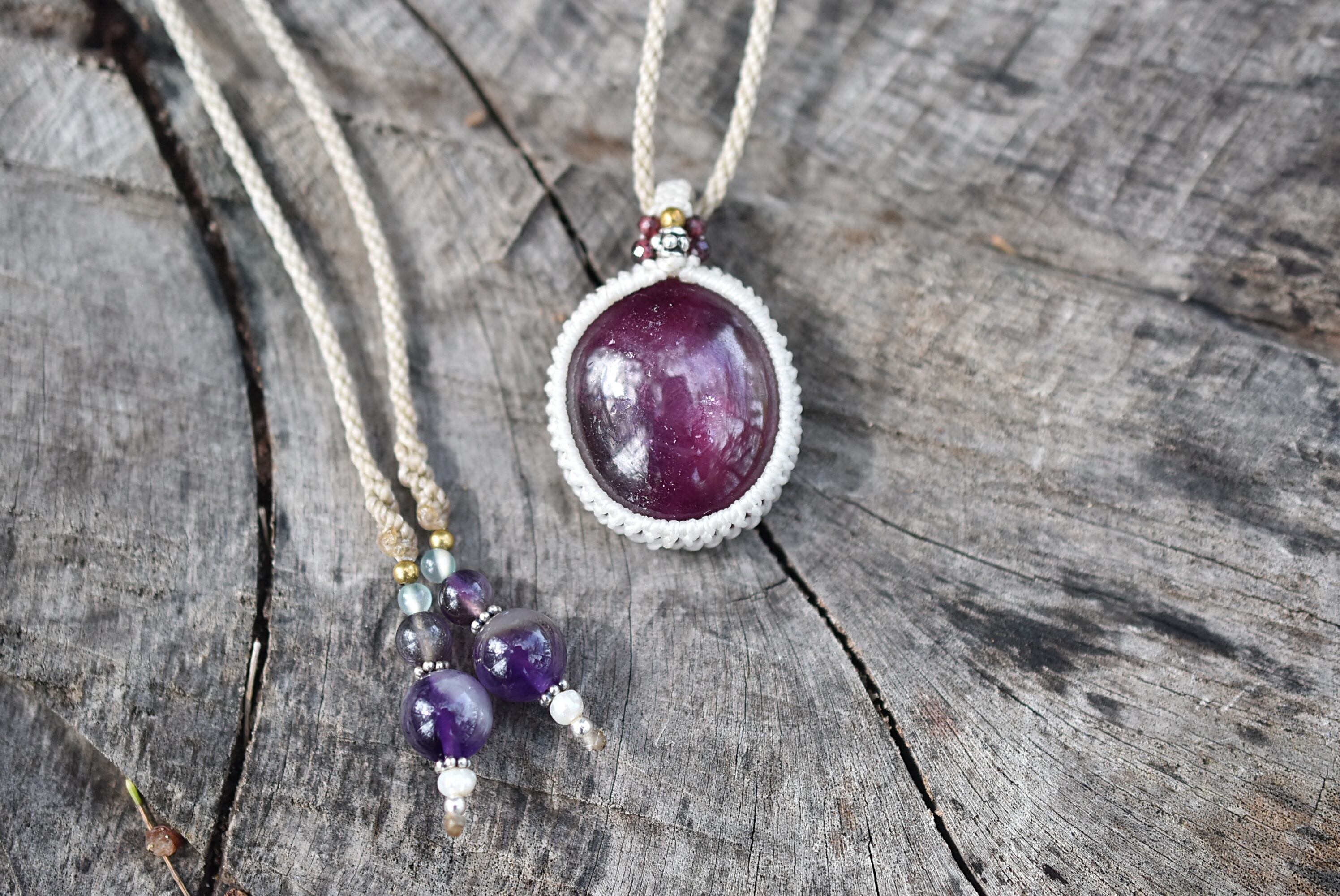 ◆このたびはキナリ、ナチュラルホワイト色の蝋引き糸を使用しマクラメ編み装飾を施しました。
