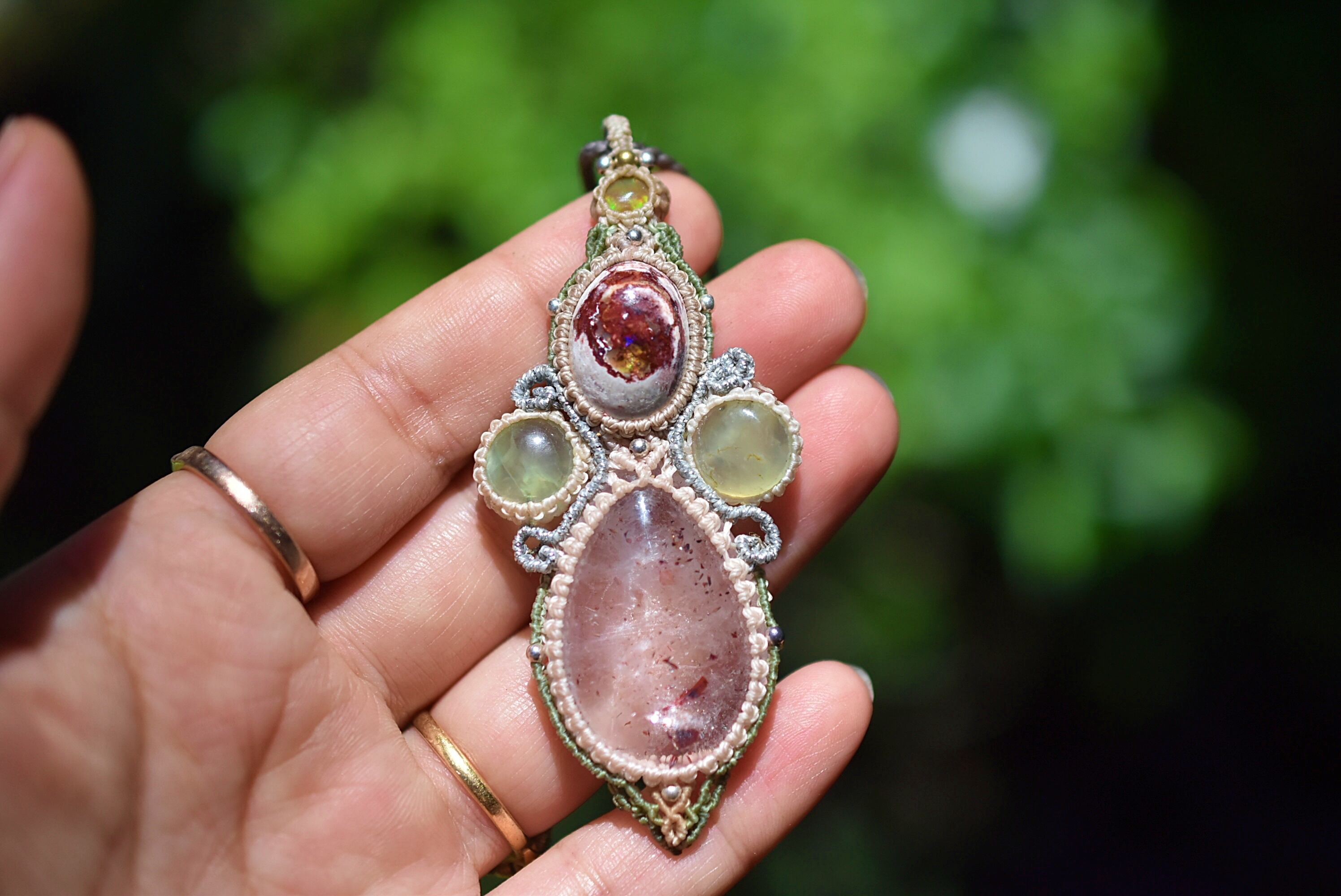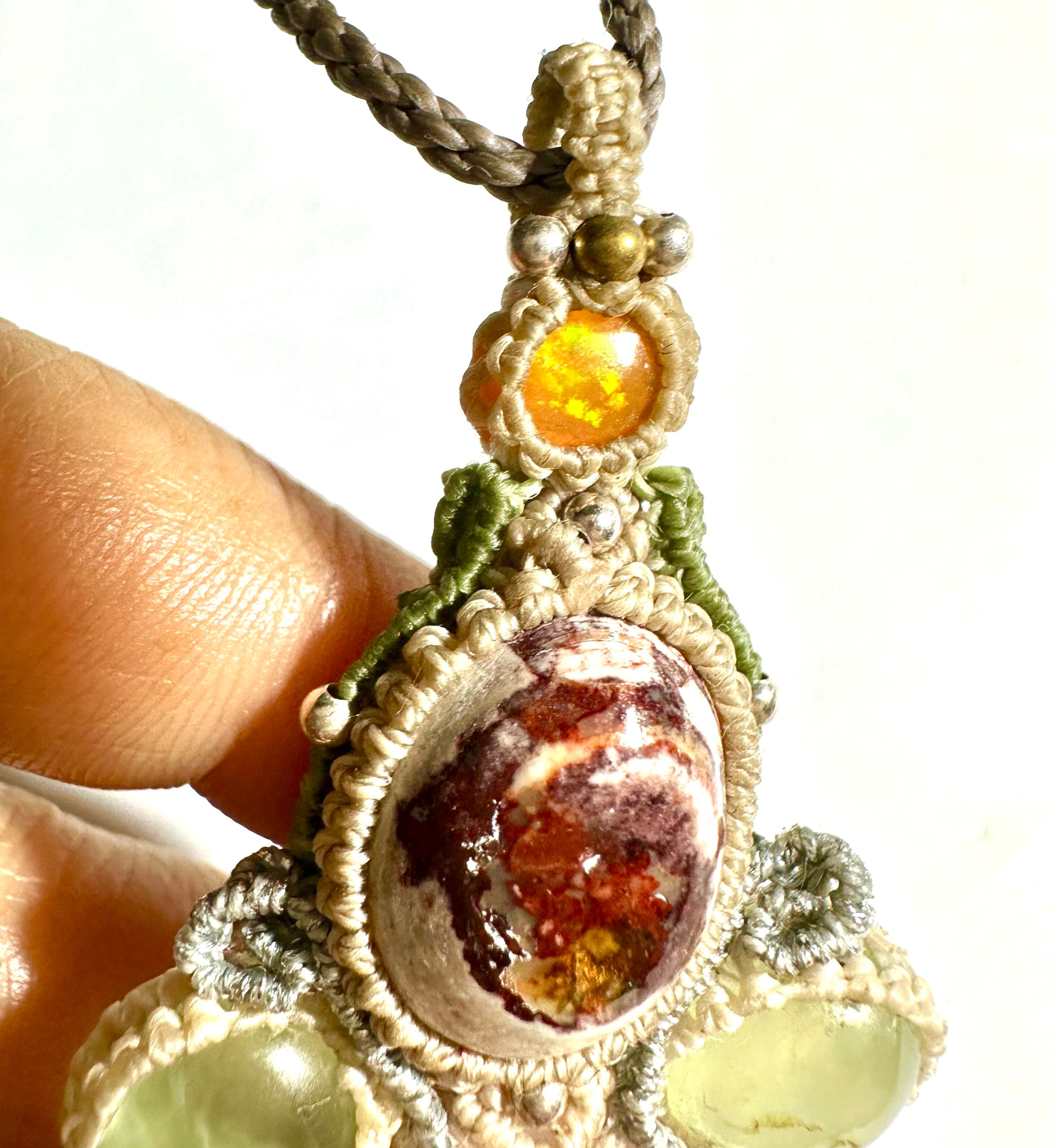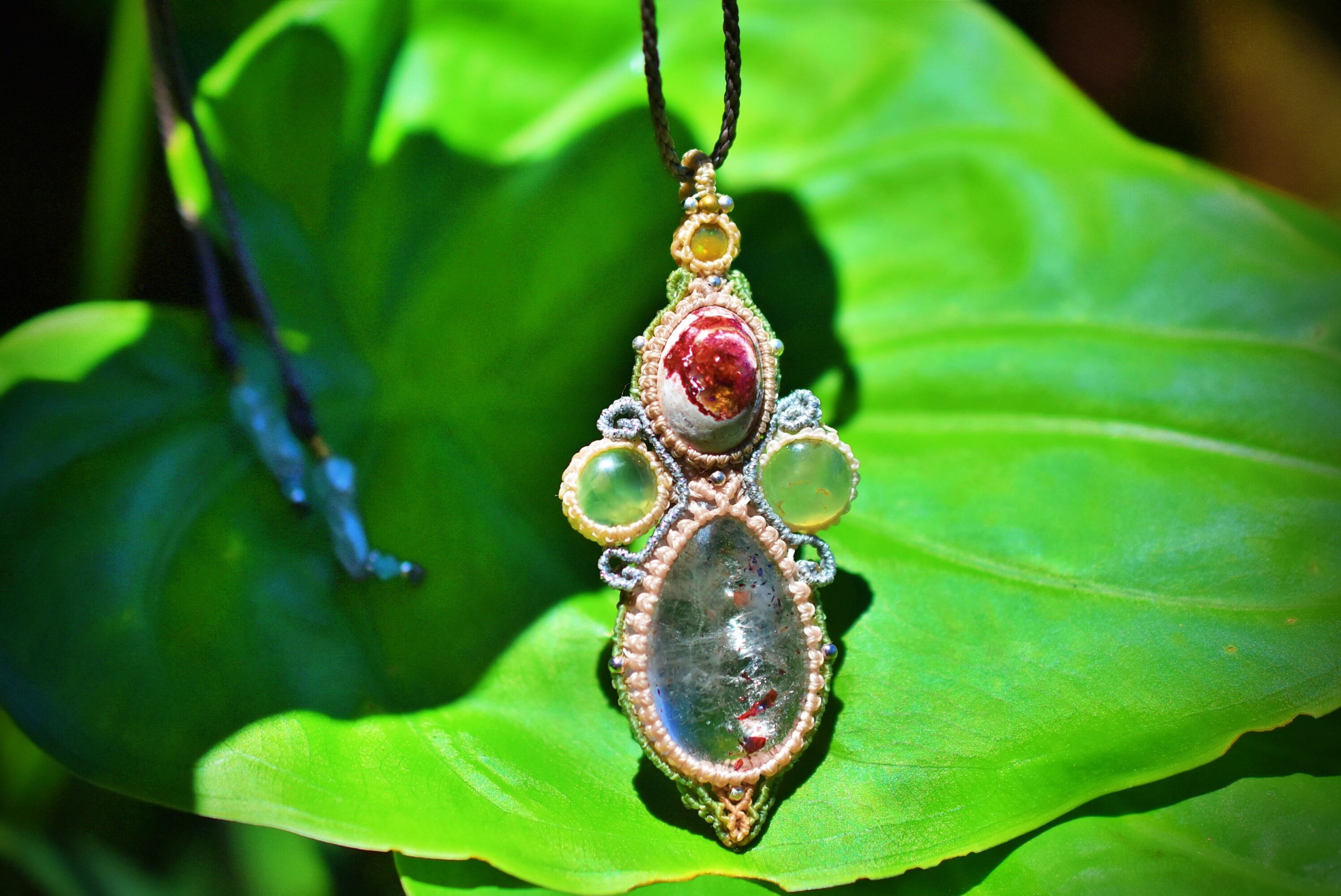 ◆このたびはヘンプ、ナチュラルホワイト、シルバー、ヘンプ、ピーコックグリーン、キャラメル色の蝋引き糸を使用しマクラメ編み装飾を施しました。
