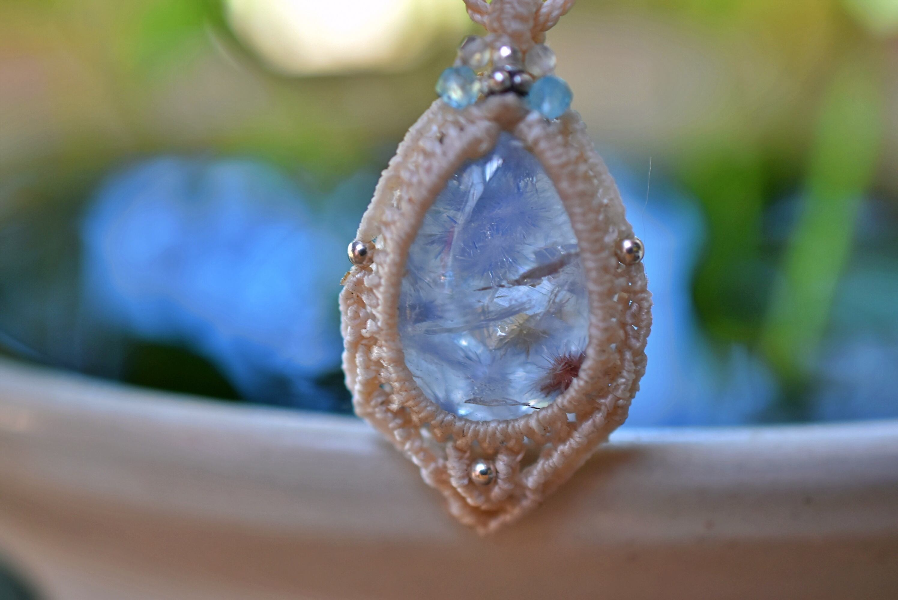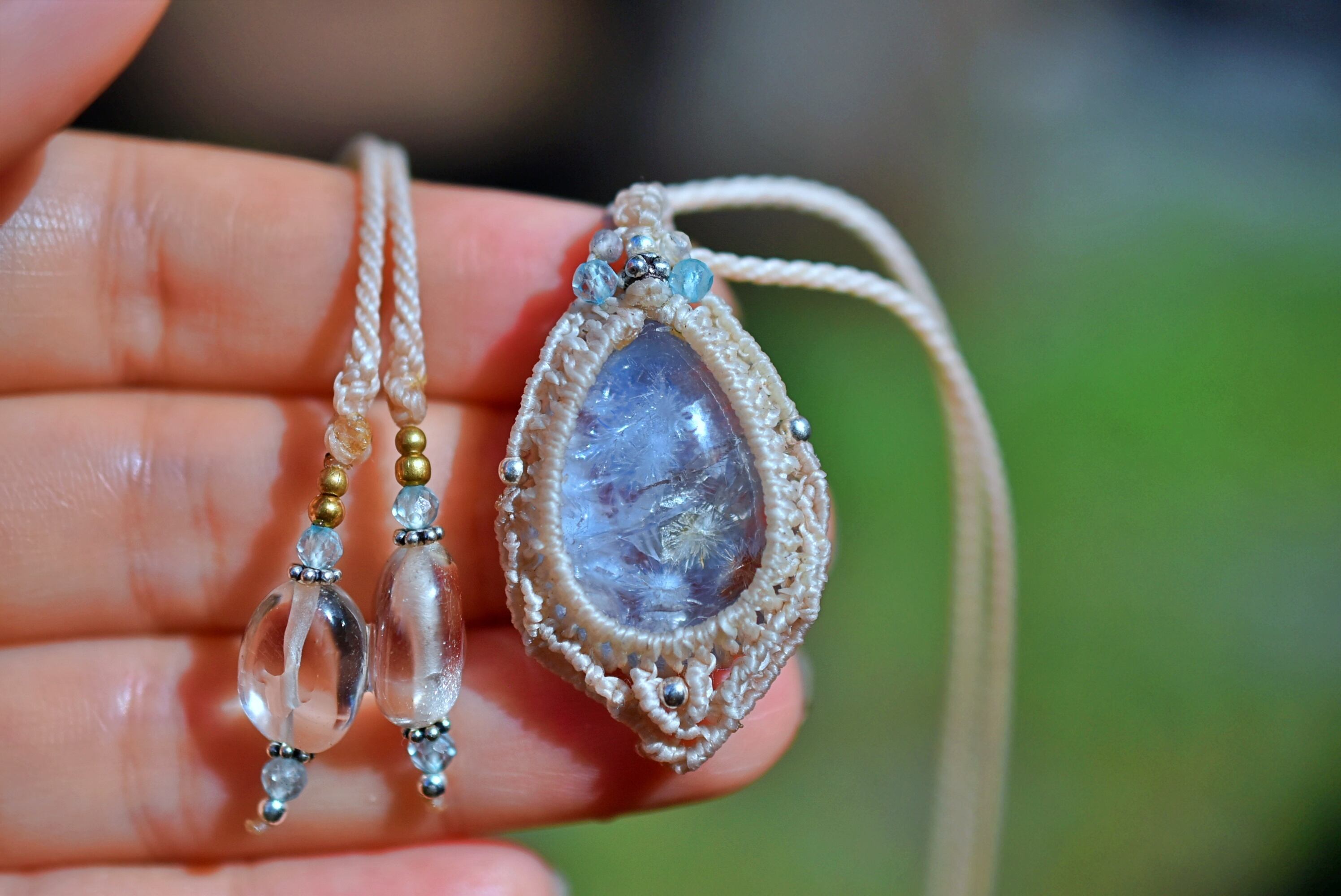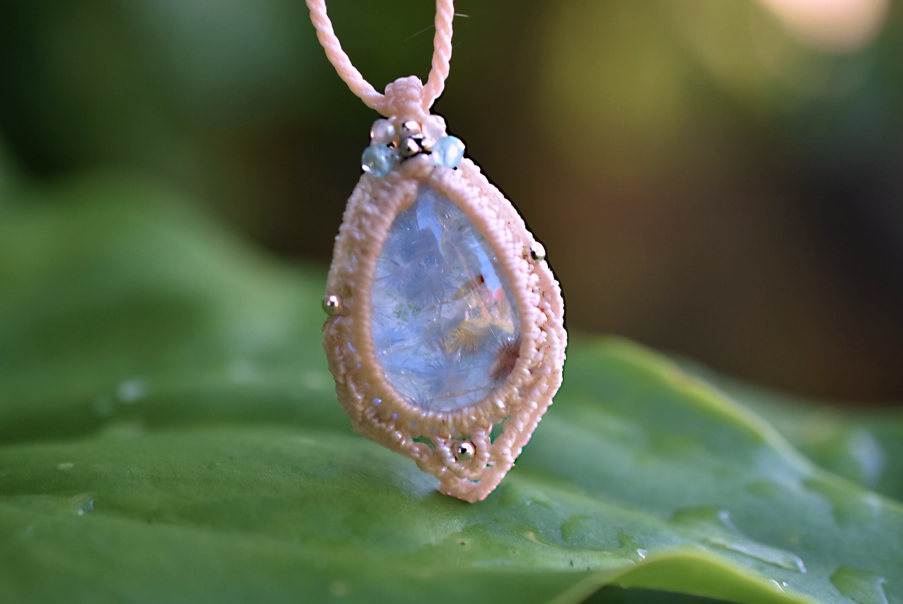 ◆このたびはナチュラルホワイト色の蝋引き糸を使用しマクラメ編み装飾を施しました。