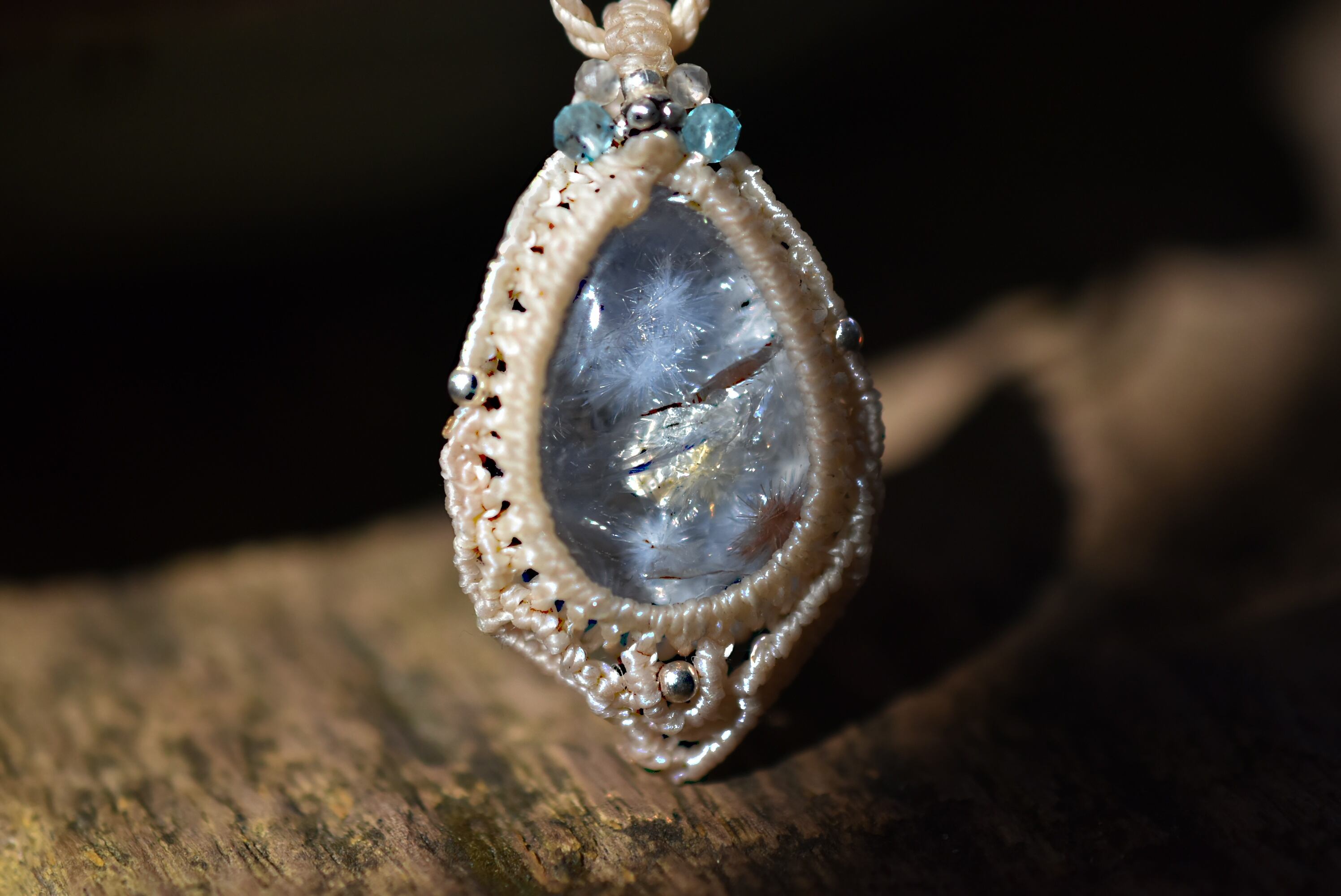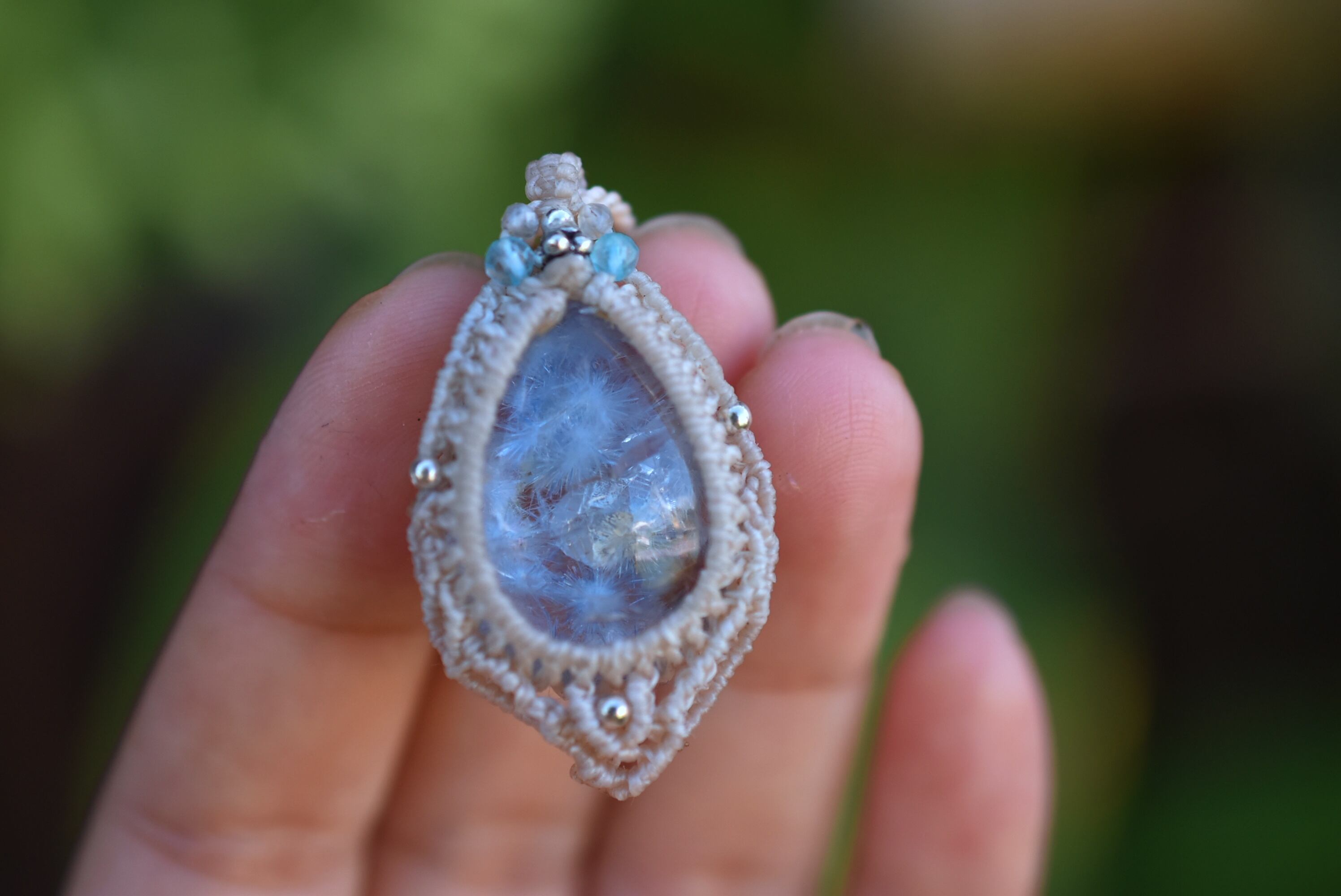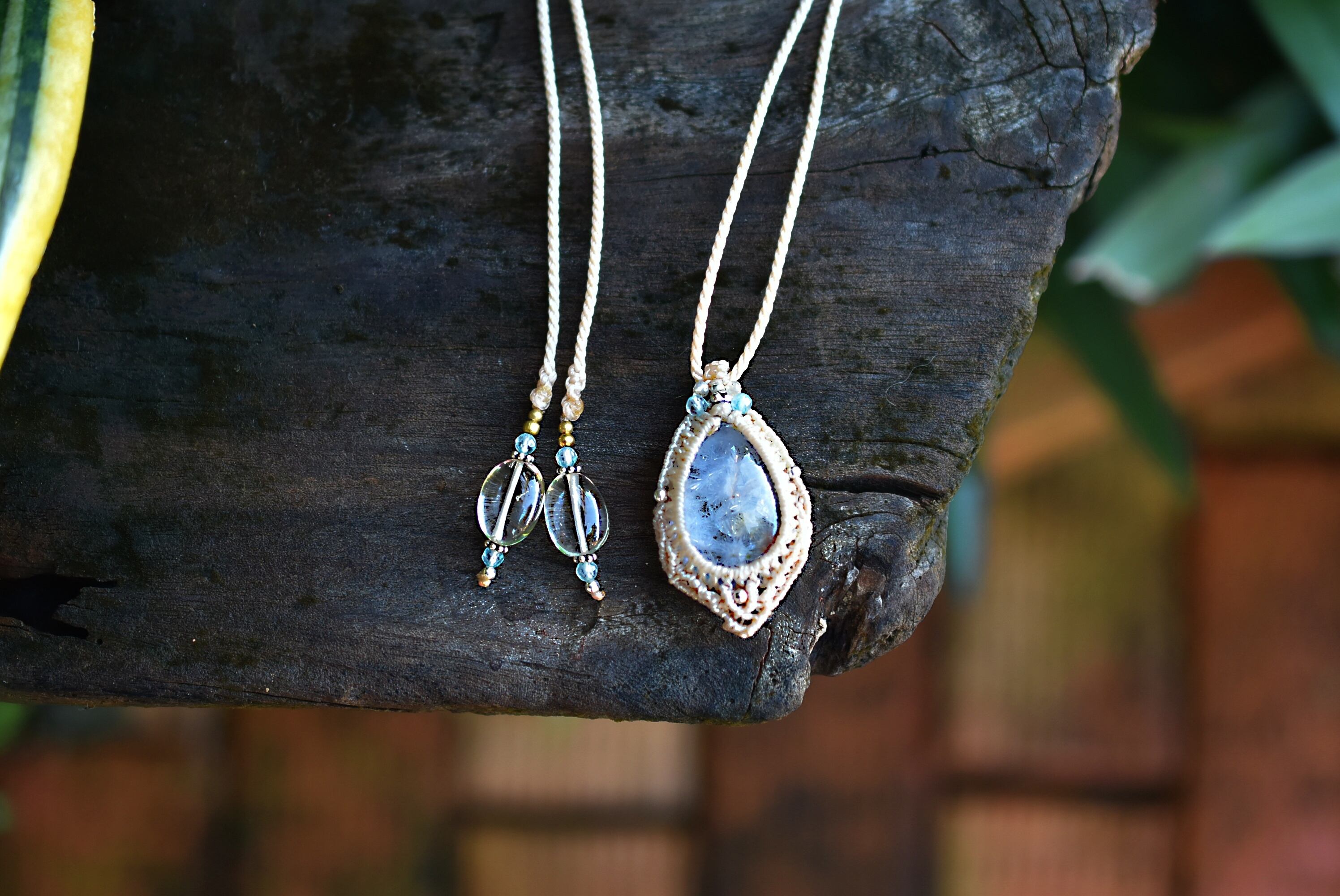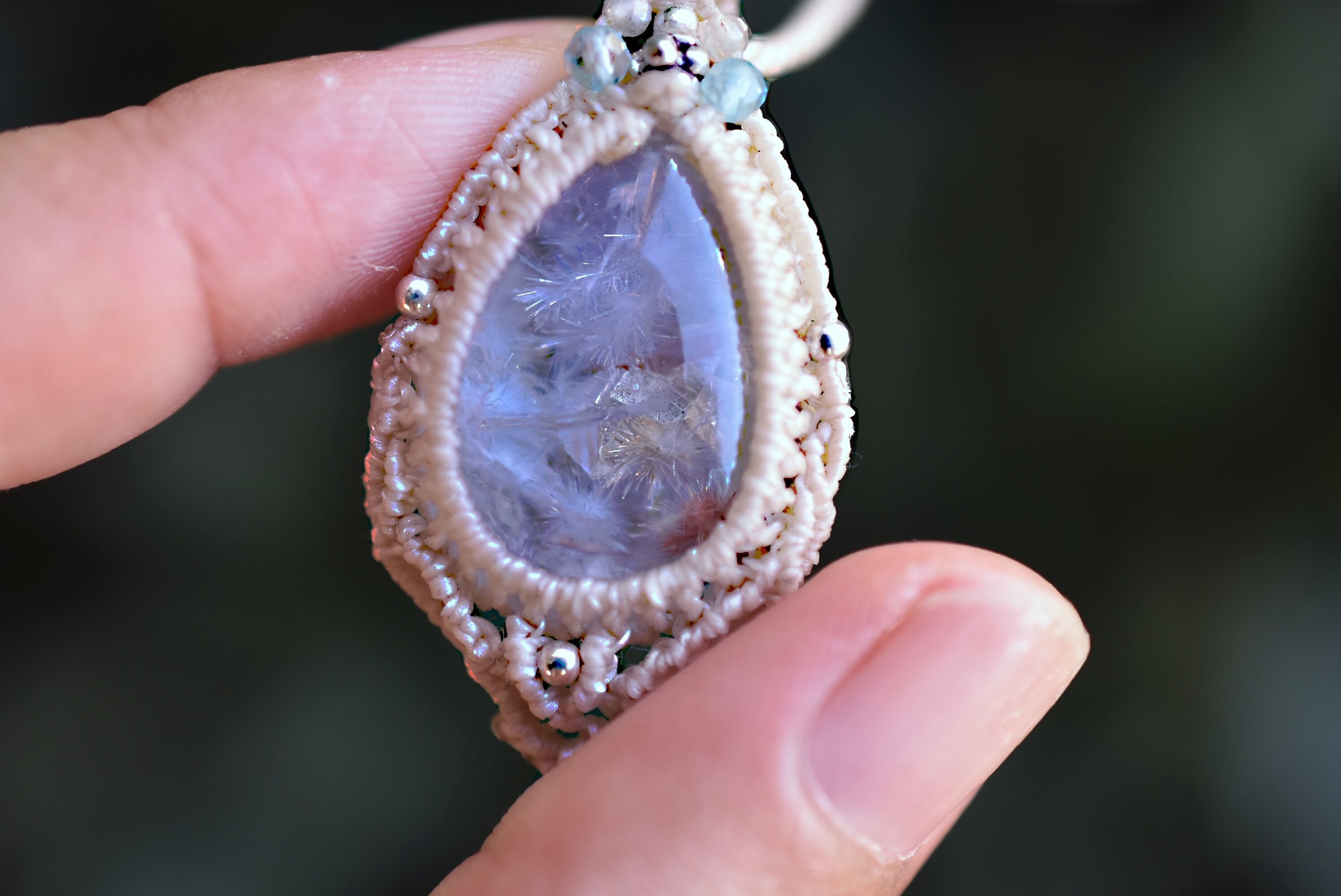 ◆このたびはナチュラルホワイト色の蝋引き糸を使用しマクラメ編み装飾を施しました。