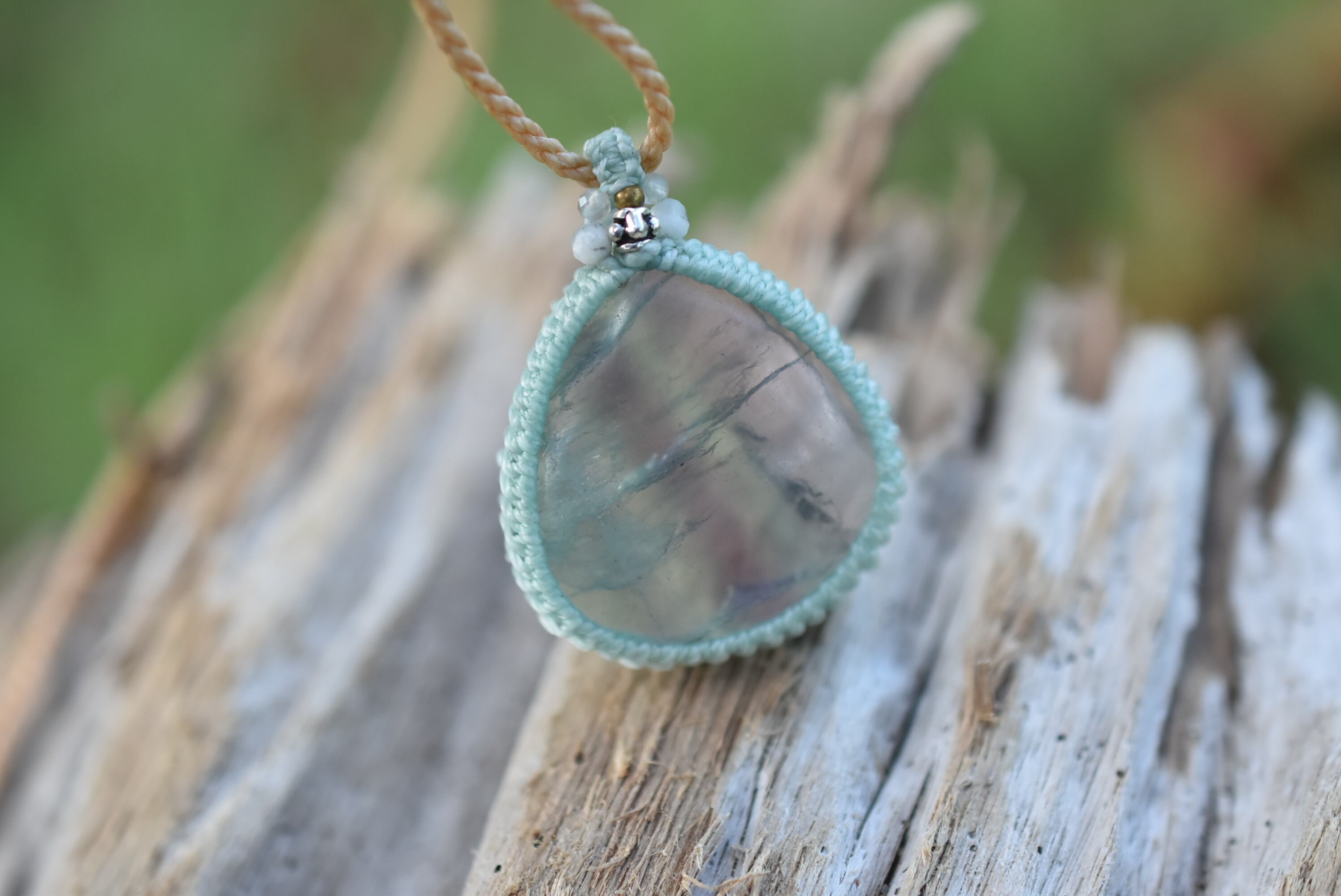 ◆このたびはミント、キャラメル色の蝋引き糸を使用しマクラメ編み装飾を施しました。