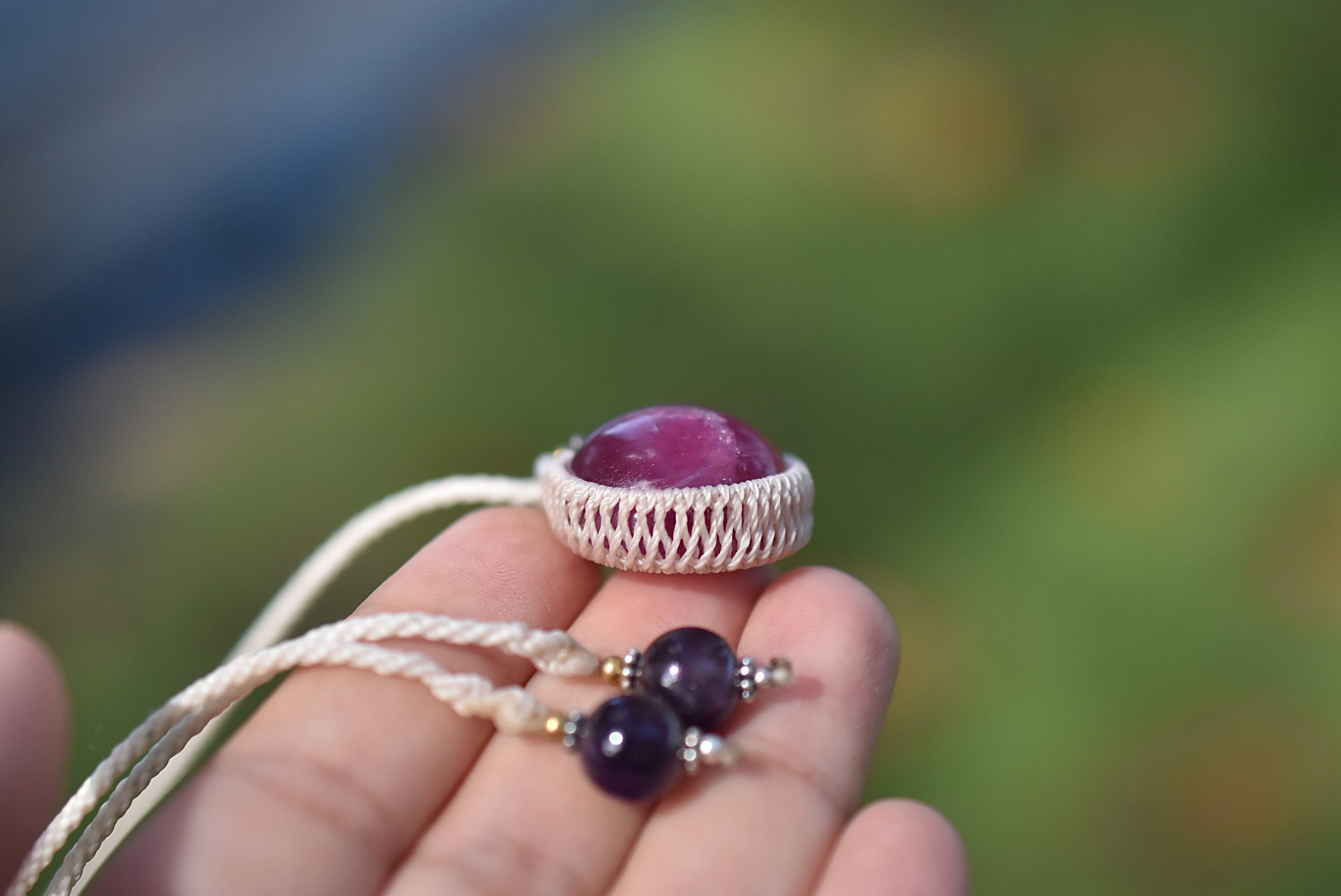 ◆このたびはナチュラルホワイト色の蝋引き糸を使用しマクラメ編み装飾を施しました。
