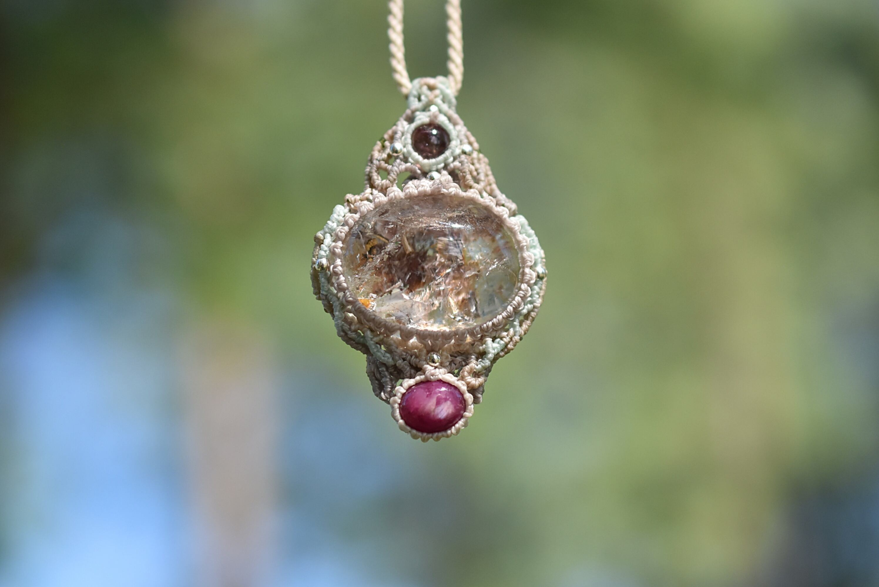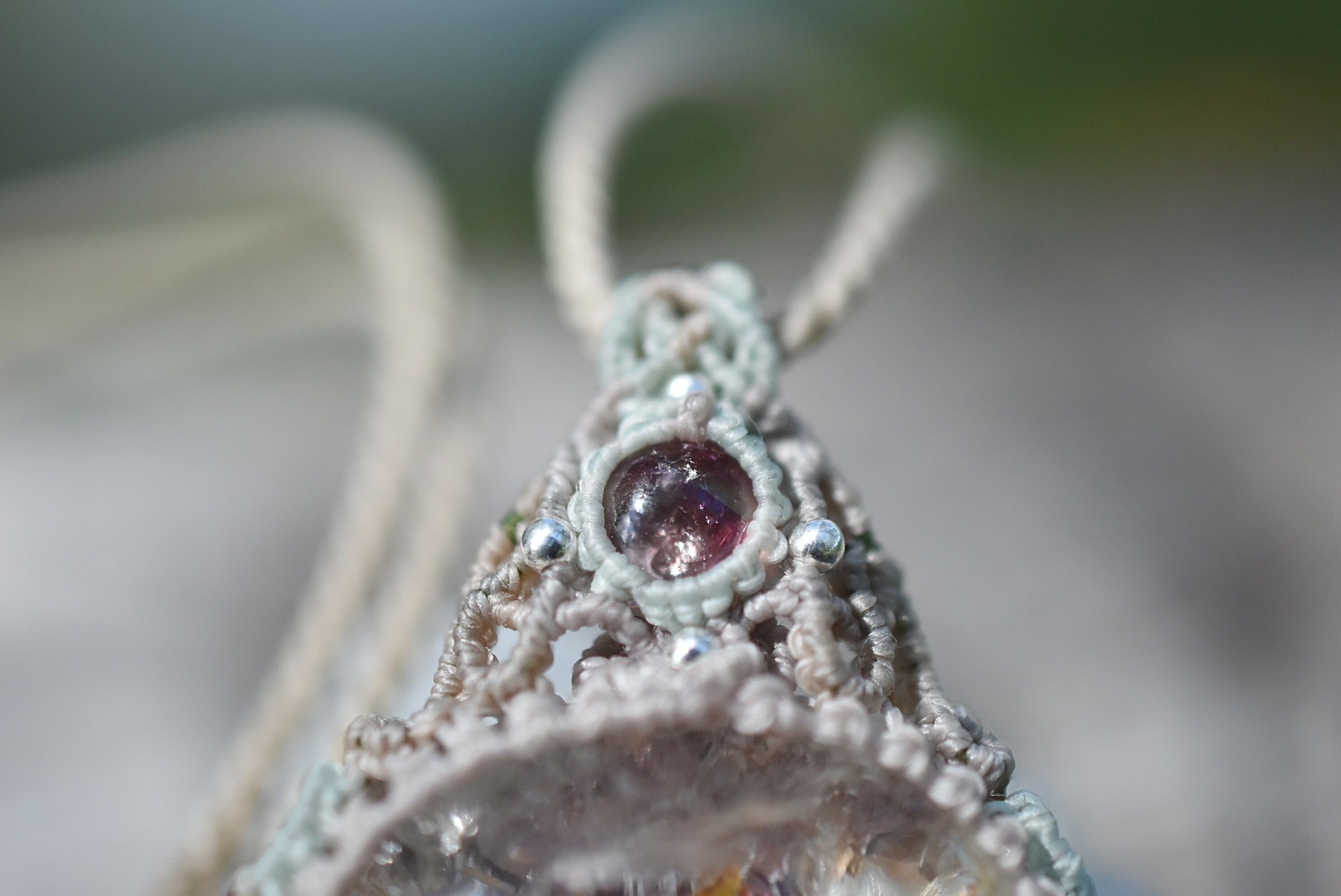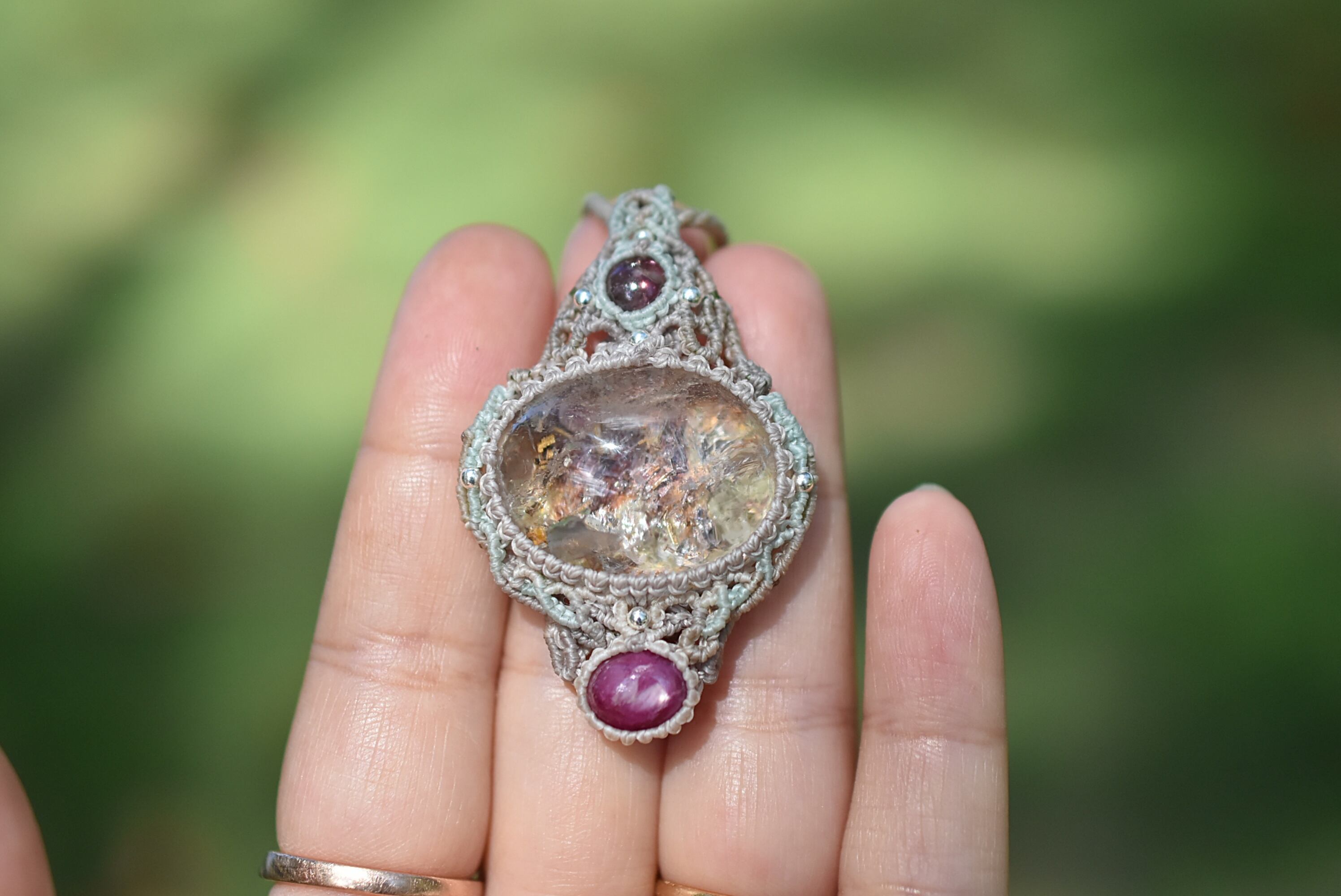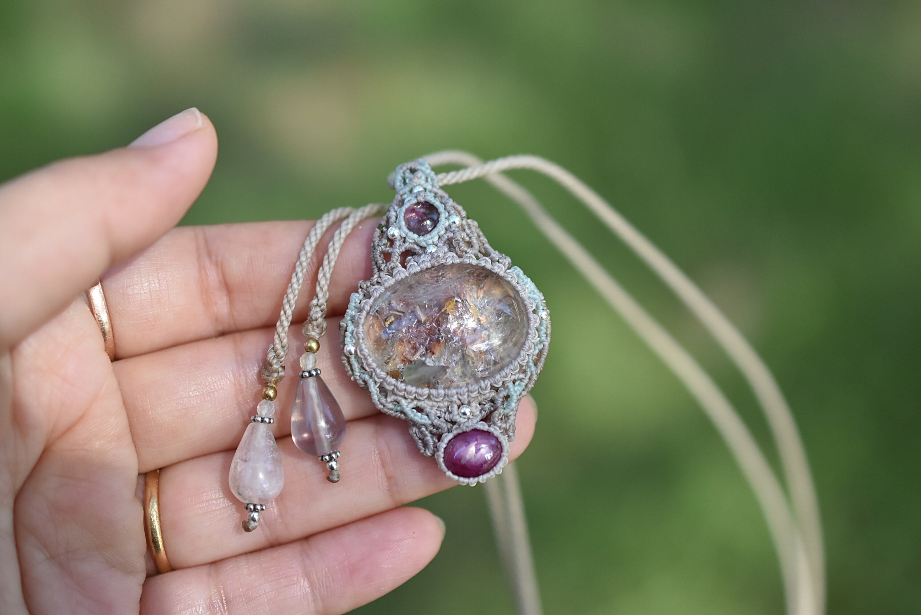 編み込みピンク★ガーデンクォーツ ルビーマクラメネックレス1249