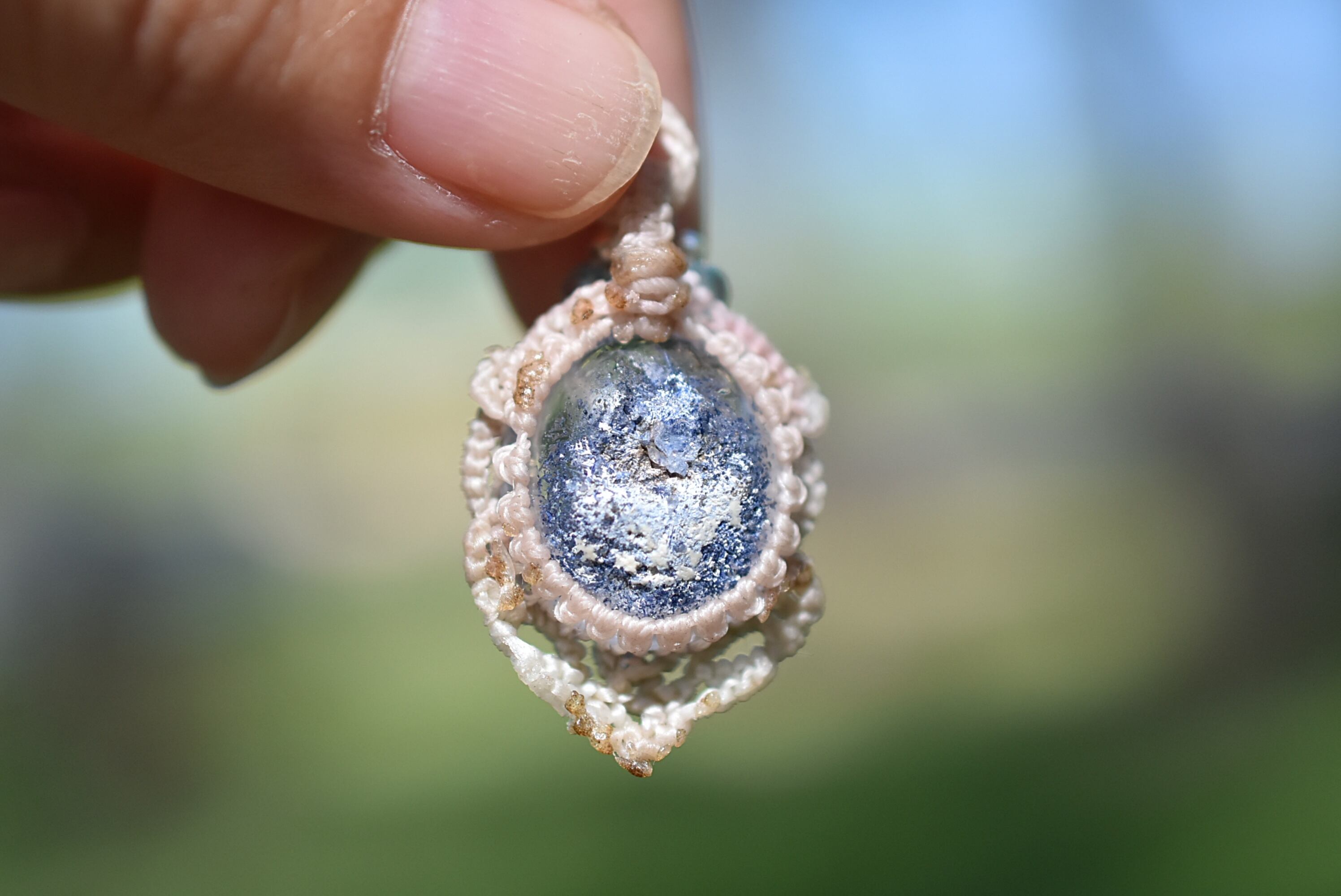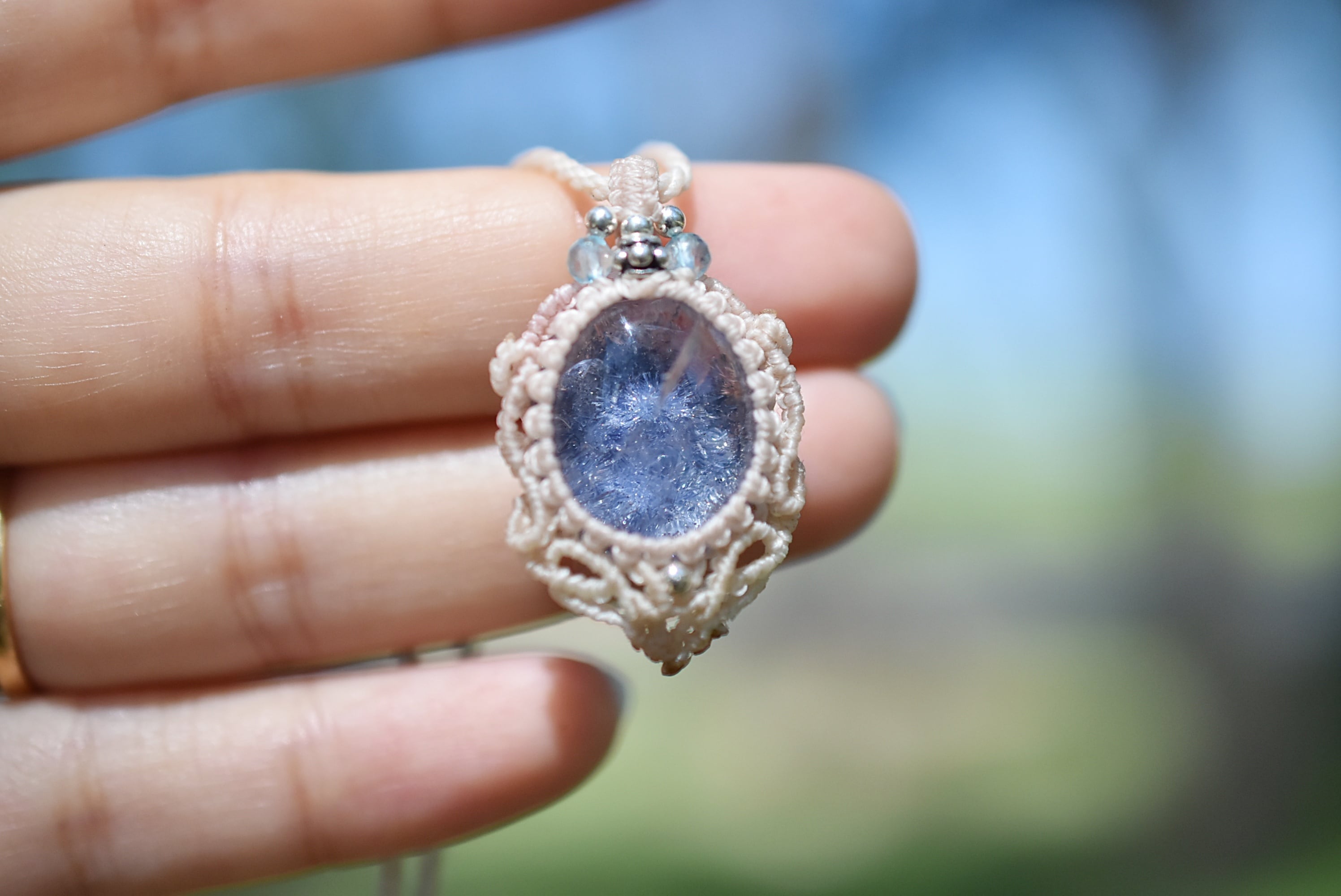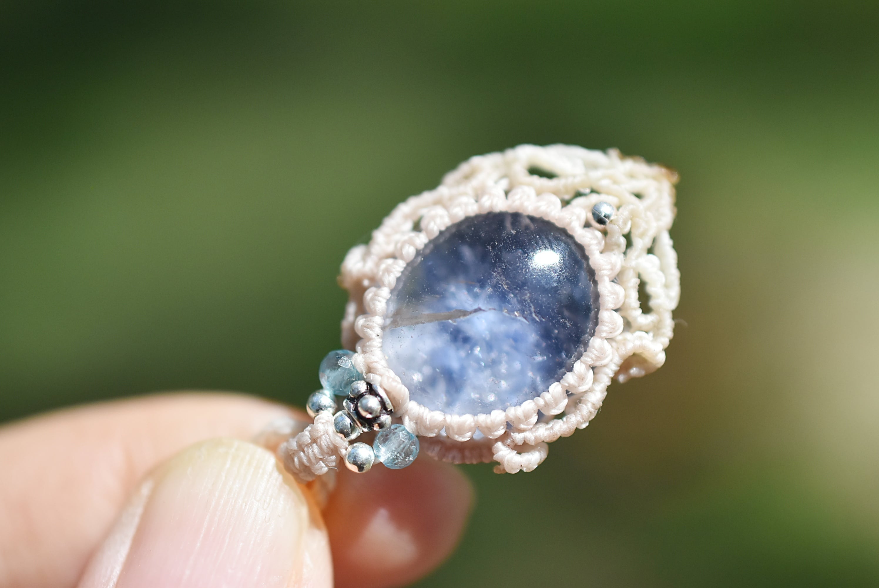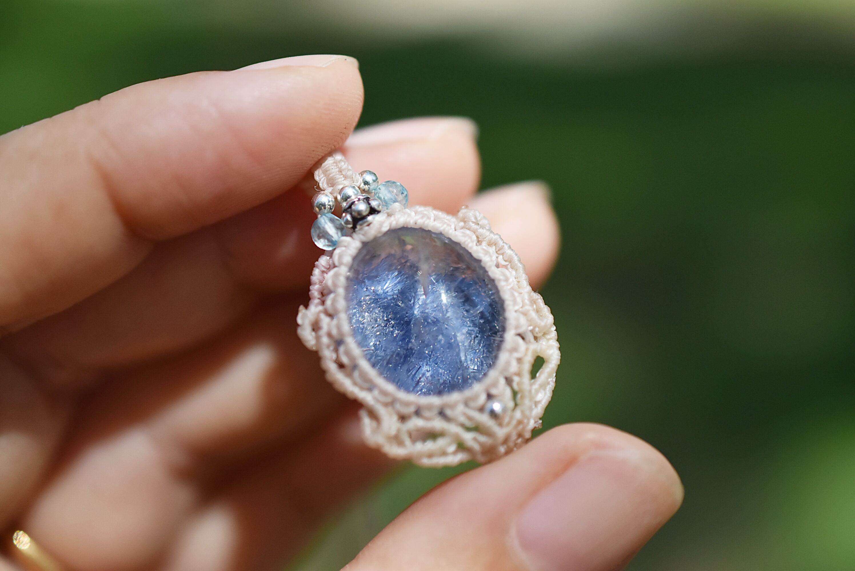 石の周りをマクラメ編み装飾。