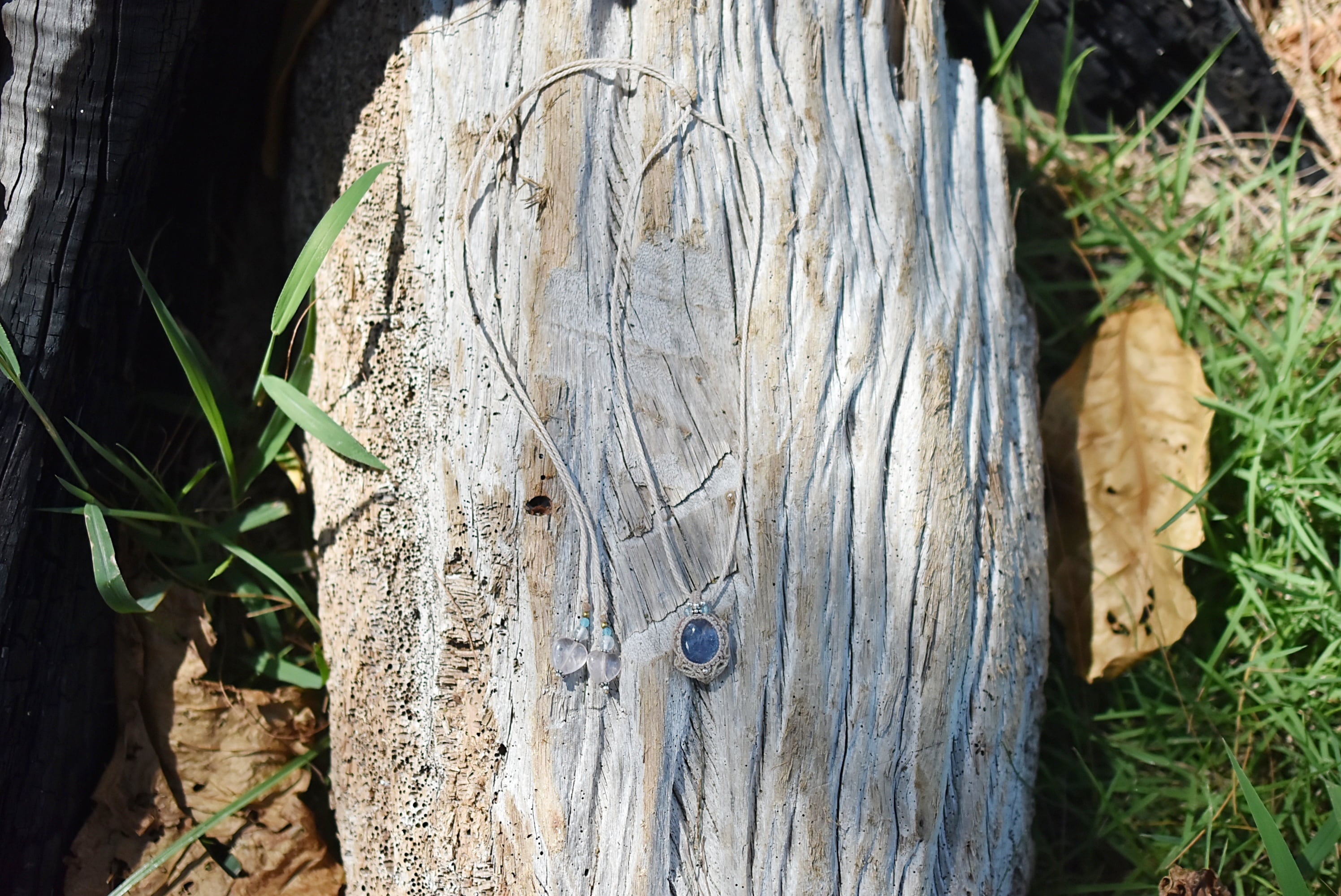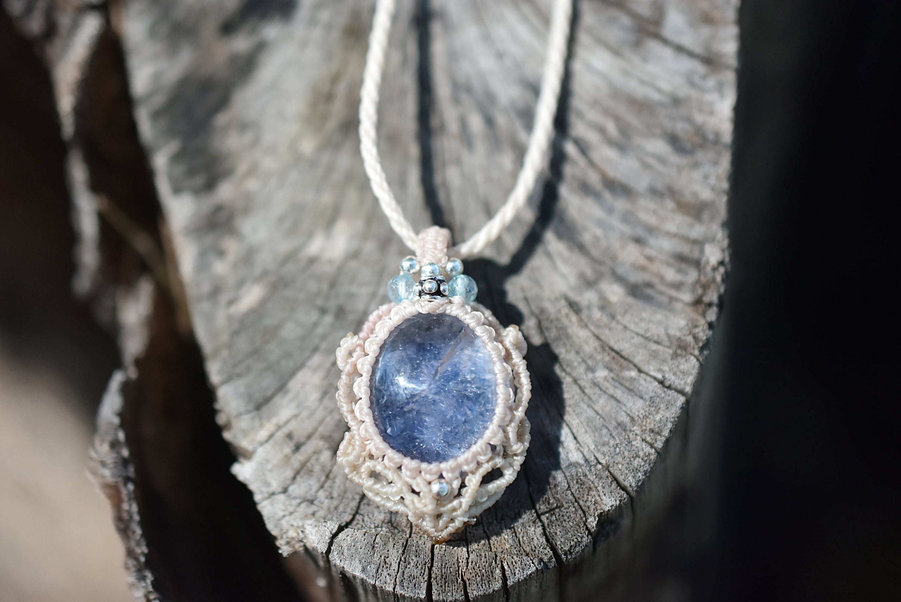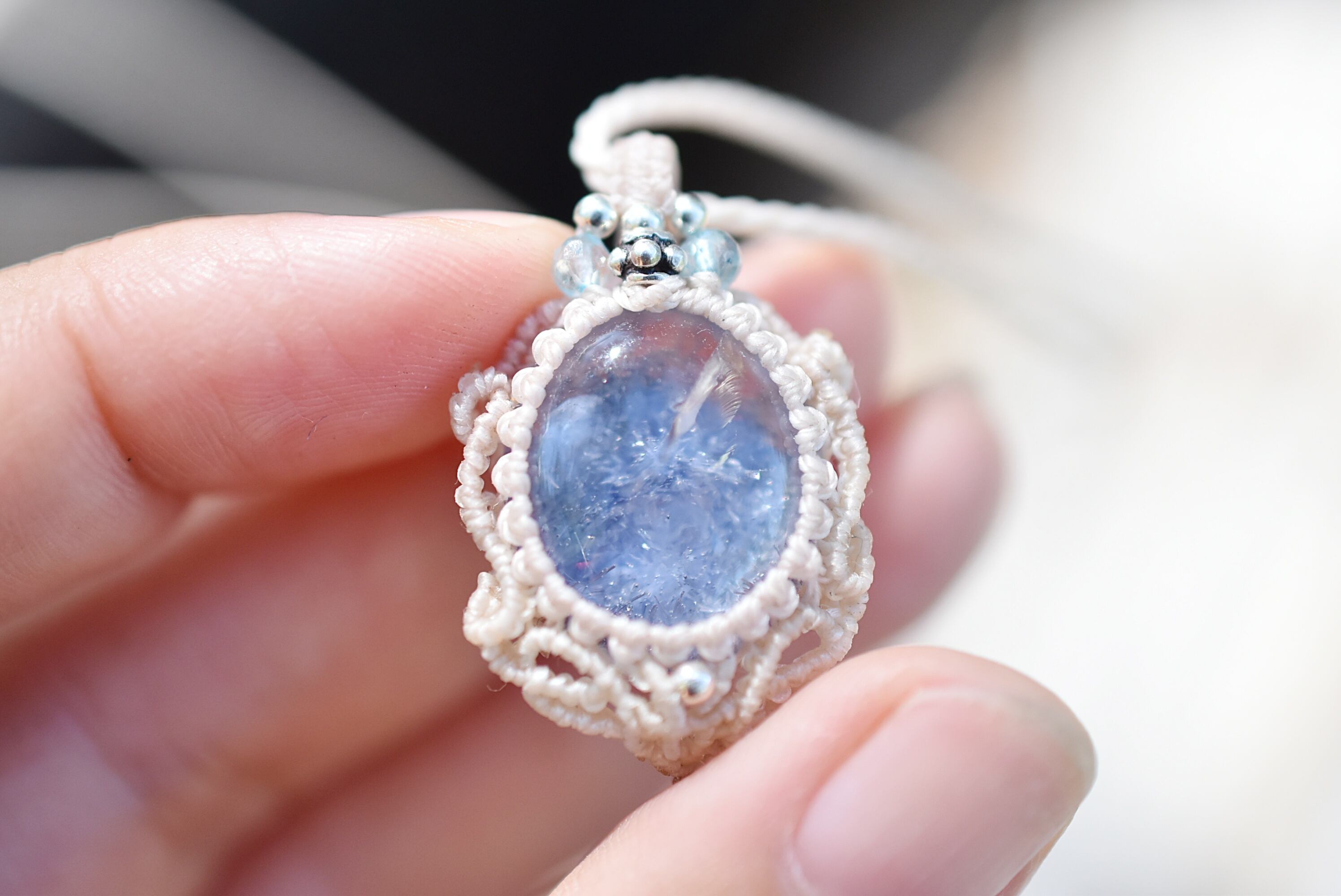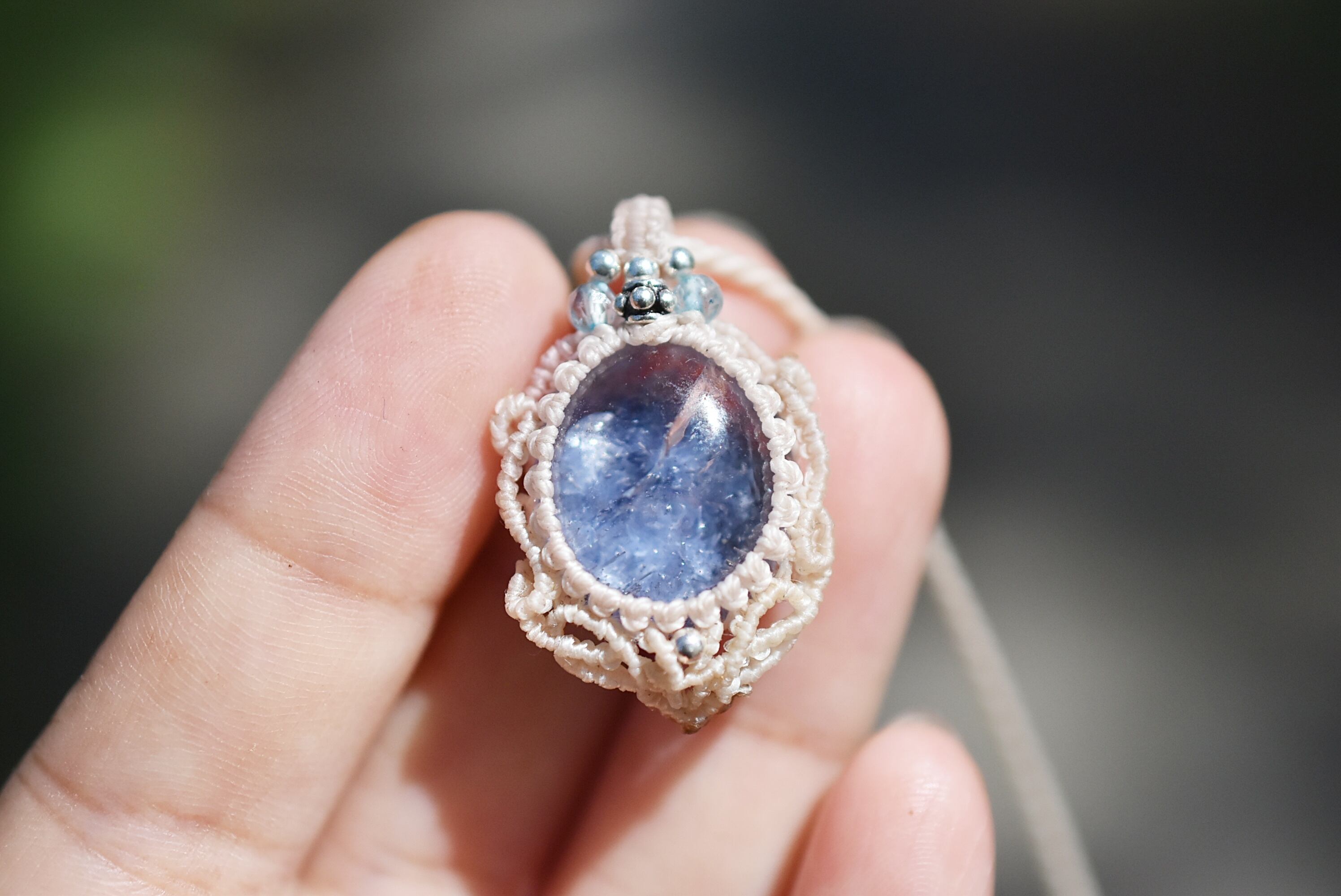 石の周りをマクラメ編み装飾。
