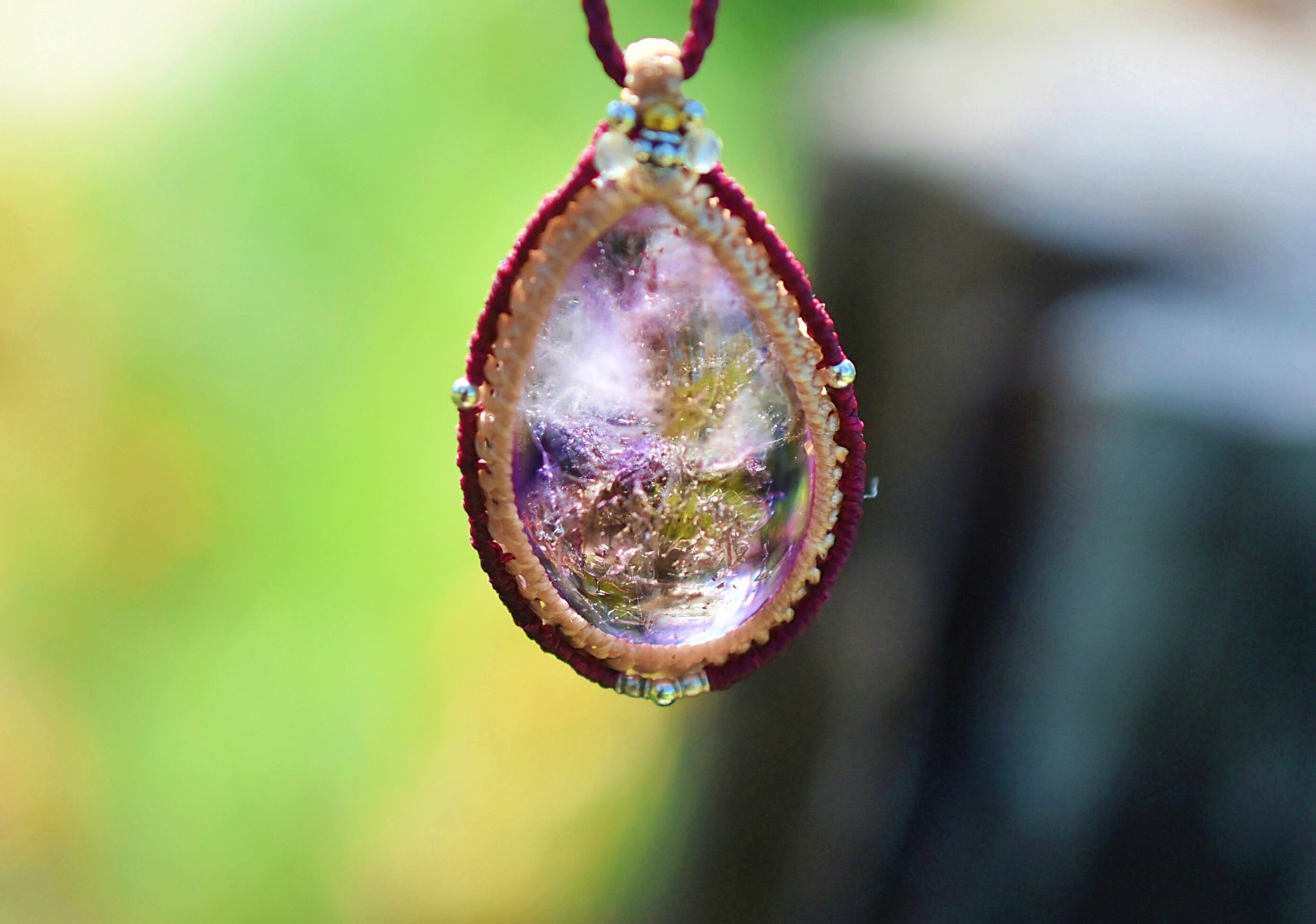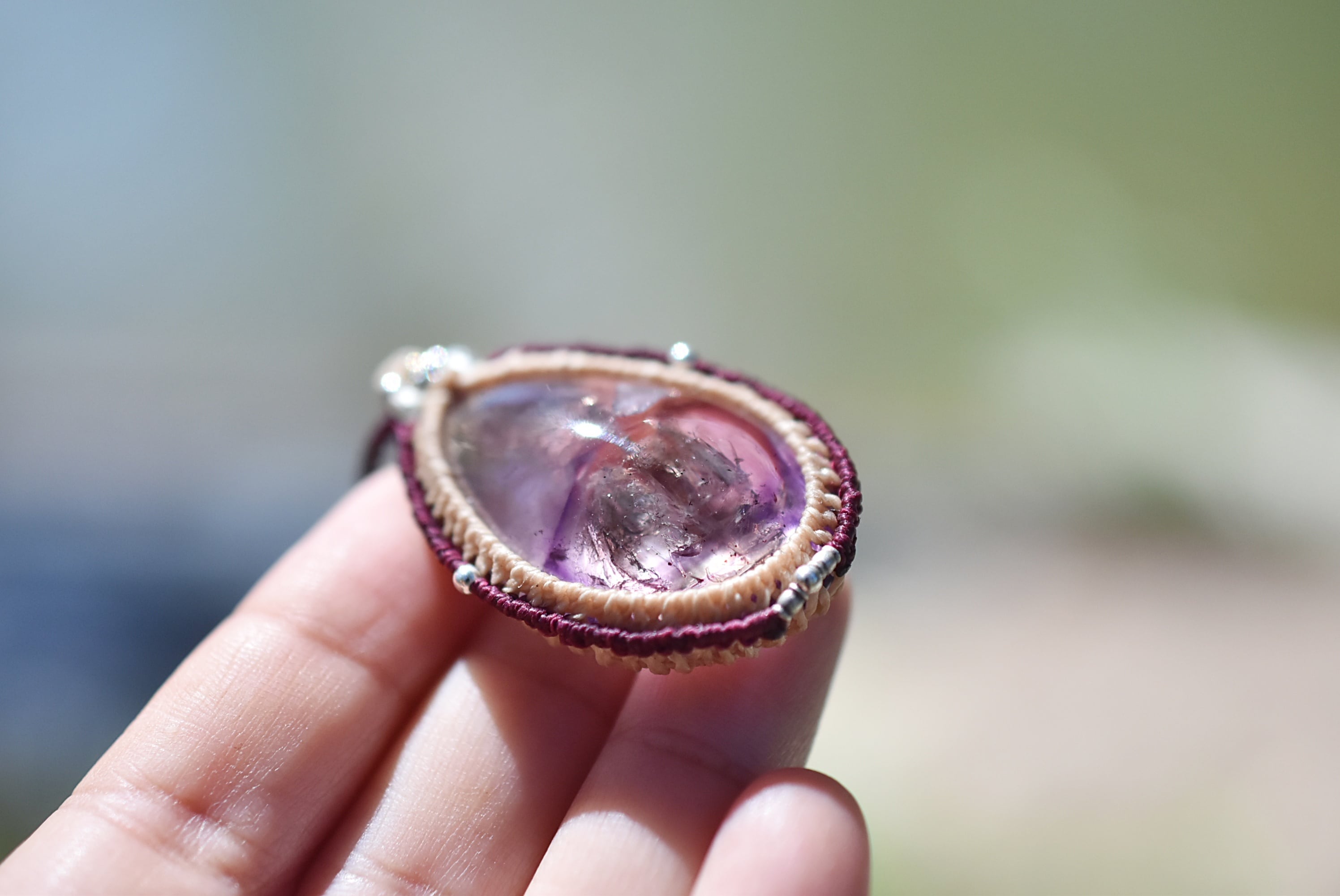 ◆このたびはナチュラルホワイト、ボルドー色の蝋引き糸を使用しマクラメ編み装飾を施しました。