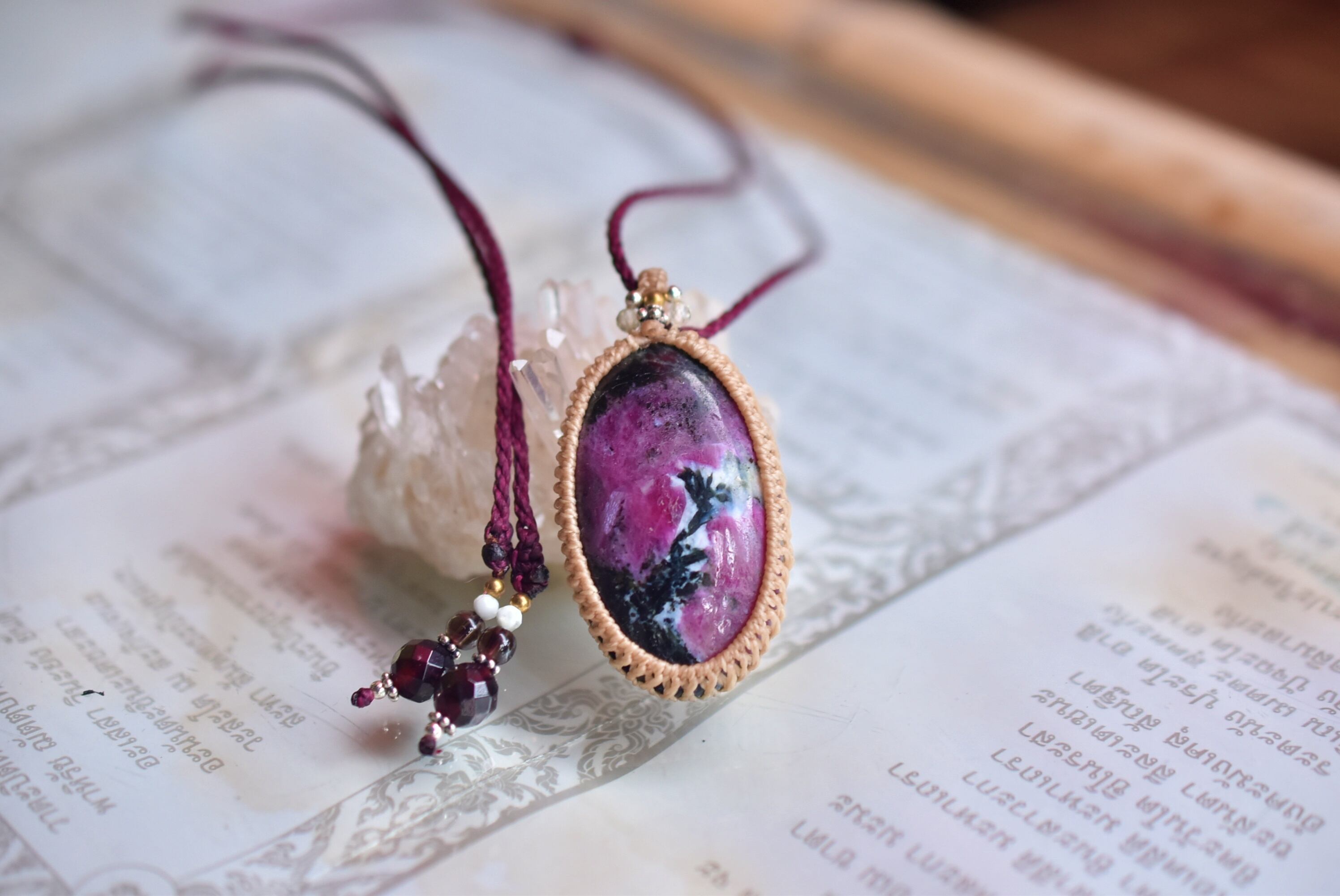 ◆このたびはキャラメル色の蝋引き糸を使用しマクラメ編み装飾を施しました。
